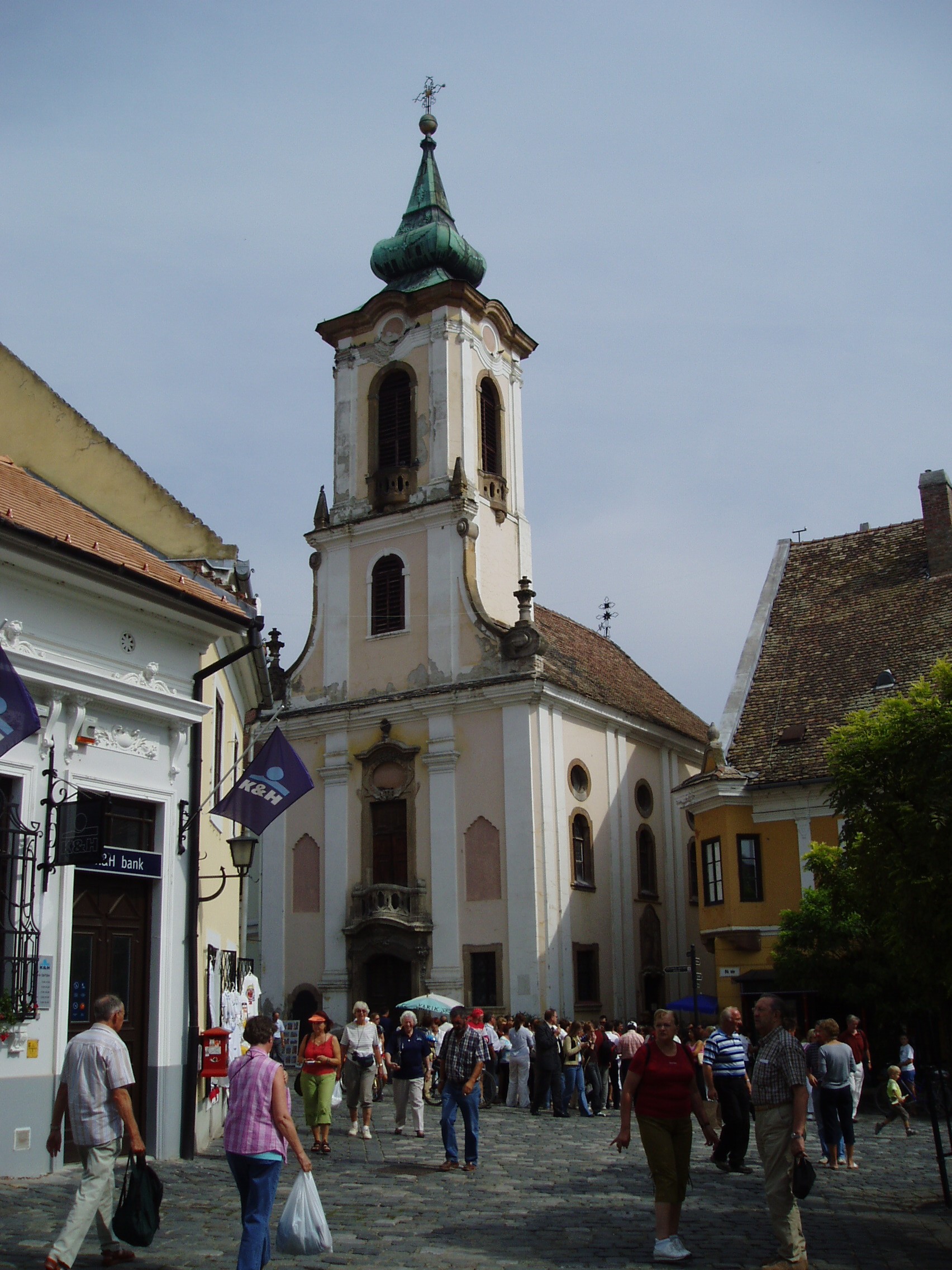 Nyilvános 1282 | 2382 | Szentendre, Fő tér: Blagovesztenszka-templom | A török elől menekülő görög kereskedők Szentendrén a Fő tér és a Duna közti területen telepedtek le. A XVII. században fatemplomot építettek, majd 1752-ben épült fel a jelenlegi épület. Minden bizonnyal Mayerhoffer András tervezte, mivel az épület hasonlóságokat mutat a pesti szerb templommal és a kalocsai Főszékesegyházzal, melyeket Mayerhoffer tervezett. A Fő tér keleti oldalán emelkedő, patinás, kelet-nyugat tengelyű épület stílusában barokk és rokokó elemek keverednek. A templom a kilenc szentendrei templom közül a legjellegzetesebb és legismertebb, a város egyik jelképe. Legnagyobb művészettörténeti értéke az arányos, harmonikus belső tér. A hajót három-szakaszos, fiókos dongaboltozat, a kórust csehsüvegboltozat fedi. A görögkeleti templomok jellegzetessége az ikonosztázion, a képfal, mely a hajót hivatott elválasztani a szentélytől, ahova csak a szertartást végzők léphetnek be. A Blagovesztenszka-templom értékes, rokokó ikonfalát Zsivkovics Mihály készítette az 1790-es években. A fénykép 2005 szeptemberében készült. Felh. irod.: www.templom.hu www.szentendre.hu Szentendre. Szerk. Sándyné Wolf Katalin. Bp. Panoráma, 1985 |