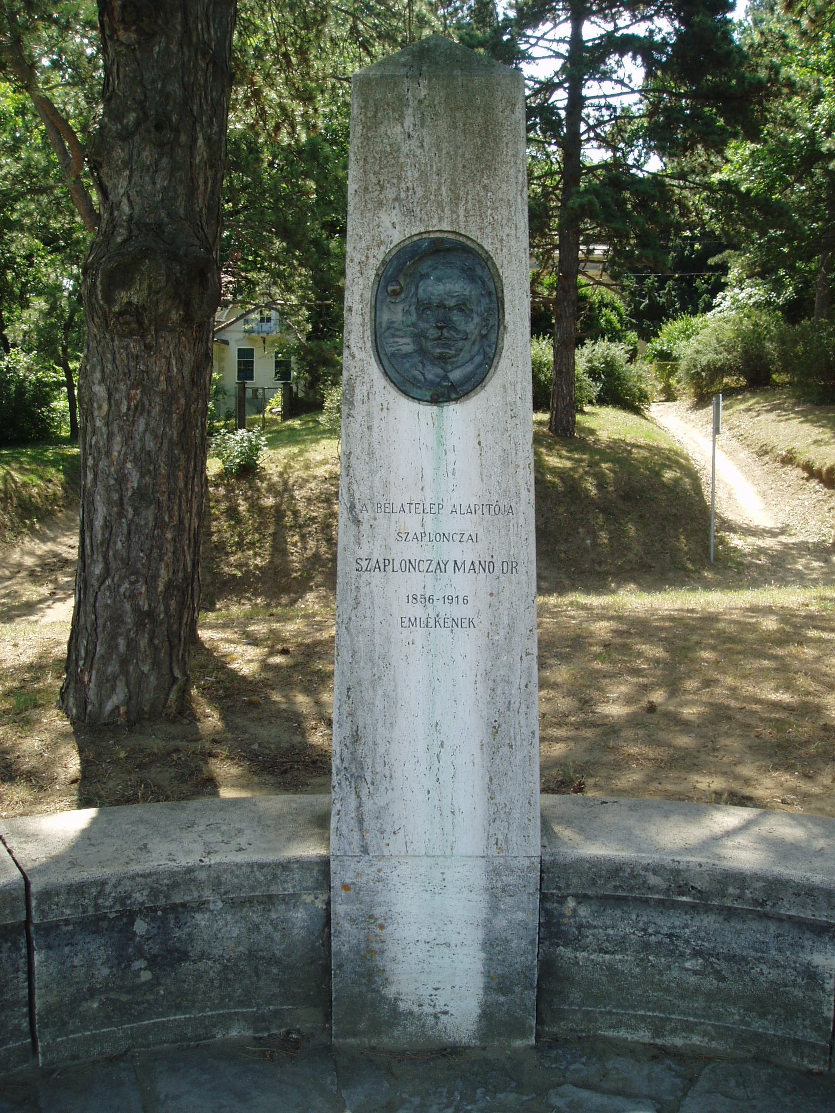 Nyilvános 1254 | 2564 | Fonyód, Márffy tér: Szaplonczay Manó emlékoszlopa | A híres Bartók Béla úti fonyód-bélatelepi villasorral átellenben, a sétányon haladva Szaplonczay Manó (1856-1916) emlékoszlopa látható, amelyet Bélatelep alapítója előtt tisztelegve 1934-ben emeltek. Az emlékoszlophoz, amelyet félkörben kőpad vesz körül, öt lépcső vezet. Az emlékművet Gerlóczy Gedeon műépitész tervezte, a rajta elhelyezett bronz-dombormű Horvay János szobrászművész alkotása. Két oldalán gránittáblákat állított a Fonyód Városvédő és Szépítő Egyesület, illetve egy kopjafa is az ő emlékét idézi. Szaplonczay Manó Somogy vármegye tisztifőorvosa volt. Ő építtette a marcali kórházat. Tiszti főorvosként sokat foglalkozott a fertőző betegségekkel, igyekezett terjeszteni a védőoltásokat. Sikerrel küzdött a csecsemőhalandóság ellen is. A fonyódi Várhegyen ő alapította meg a gróf Zichy Béláról (lásd: Fonyód, Bartók u. 3.) elnevezett Bélatelepet, s ezzel sokat tett a Balaton idegenforgalmának megteremtéséért. 1894-ben Kaposváron ötven alapítóval létrehozta a Fonyódi Nyaralók Társaságát. Hatvan éves korában, 1916. szeptember 3-án hunyt el. Ahogy kívánta, az általa alapított Bélatelepen, Balatonra nézve temették el a Várhegyen. A fénykép 2007 júliusában készült. Felh. irod.: http://konyvtar.fonyod.hu/szapmano.htm Szerdán avatták fel Fonyódon a Szaplonczay-emlékművet. = Új Somogy. 1934. augusztus 17 www.somogyitemetkezes.hu/temetok.php?id=179 |