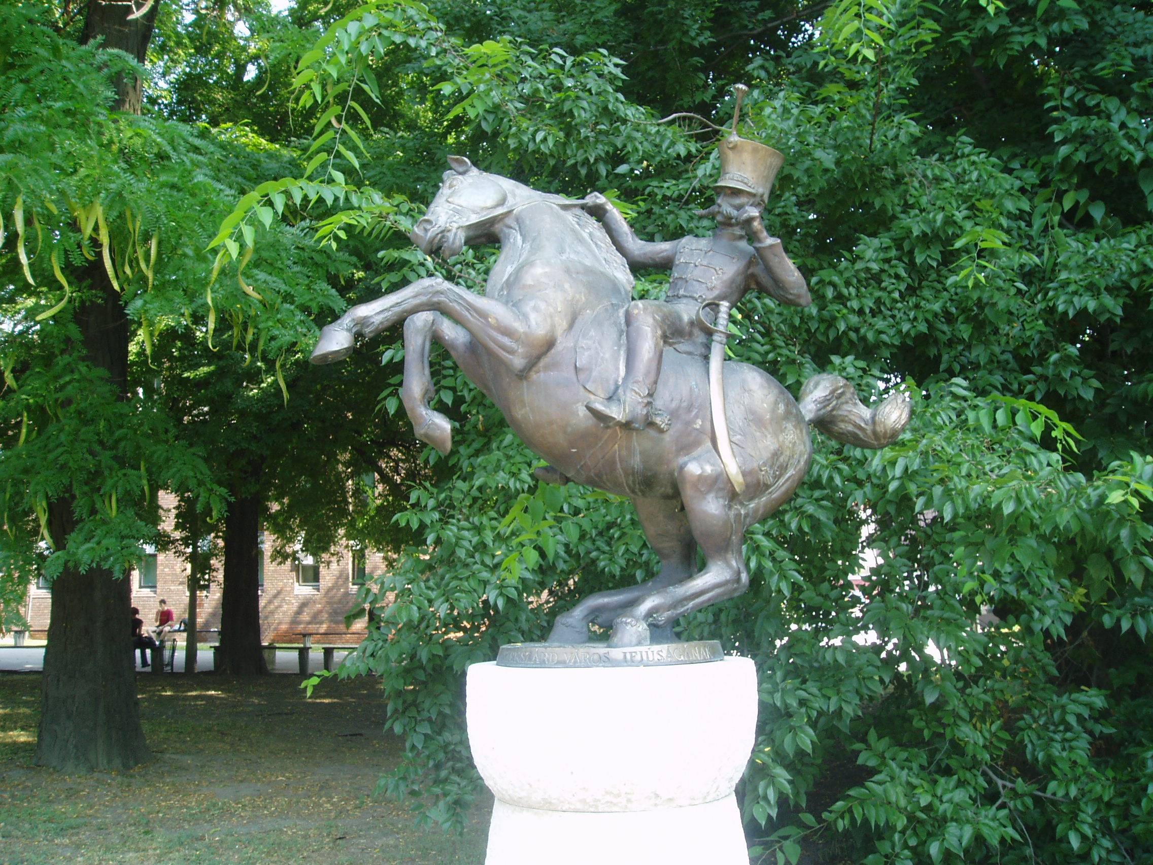 Nyilvános 1176 | 2666 | Szekszárd, Liszt Ferenc tér: Háry János szobra | A szekszárdi születésű (lásd: Szekszárd, Széchenyi u. 40.) Garay János, majd később Kodály Zoltán által halhatatlanná tett mesehős, Háry János szobra a Szekszárdon élő Farkas Pál alkotása. Felállítását dr. Joó Ferenc adománya tette lehetővé 1992-ben. A helyi hagyomány szerint a szobor háta mögötti Augusz-házban (lásd: Szekszárd, Széchenyi u. 36-38.) szolgált az az egykori katona, akiről Garay Háry János alakját mintázta. A fénykép 2006 júliusában készült. Felh. irod.: http://www.szeki.hu/turista/kalauz/magyar/tuka0201.htm Töttös Gábor: Szekszárd. Bp. Panoráma, 1986 Töttös Gábor: Irodalmi séták Szekszárdon. 1985 |