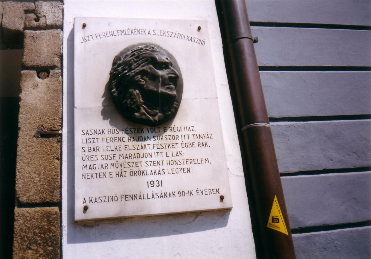 Nyilvános 1023 | 1692 | Szekszárd, Széchenyi utca 36-38. Augusz-ház | Az Augusz–család egykori kúriája, amelyben négy alkalommal vendégeskedett Liszt Ferenc, három eltérő korú épületrészből áll. Legrégebbi része a jelenleg kékesszürkére festett déli szárny. Id. Augusz Antal 1820 körül építtette, az ő fia volt Liszt barátja, a később bárói címet kapott Augusz Antal. Az épület három homokkő oszlopon nyugvó középső része az 1830-as évekből való. A trieszti Miramare–kastély által ihletett rózsaszínű, tornyos északi szárnnyal pedig az 1860-as években bővíttette otthonát az ekkor már bárói címmel felruházott Augusz Antal. Ezt az épületrészt a szekszárdi Stann Jakab tervezte. Ennek a szárnynak első emeletén voltak Liszt Ferenc kertre néző lakosztályának szobái. A helyi hagyomány szerint az idősebb Augusz idejében ebben házban szolgált az az egykori katona, akiről Garay Háry János alakját mintázta. Liszt Ferenc négy alkalommal töltött rövidebb–hosszabb időt Szekszárdon ebben a házban Augusz Antal vendégeként (1846, 1865, 1870, 1876). Később az épületben működött a szekszárdi kaszinó, s ennek keretében az ország első közgazdasági és társadalomtudományi szakkönyvtára. 1973 óta a Liszt Ferenc Zeneiskola otthona. Az épület középső szárnyának városközpont felé eső homlokzatán 1931-ben leplezték le Liszt Ferenc portrédomborművel díszített emléktábláját, Wigand Edit alkotását. A verset Bodnár István, a kaszinó igazgatója írta. A fénykép 2006 júliusában készült. Felh. irod.: www.szeki.hu/turista/kalauz/magyar/tu000012.htm www.csatolna.hu/hu/tolnamegye Vendel–Mohay Lajosné: Liszt–emlékek Szekszárdon. Szekszárd, 1986 |
