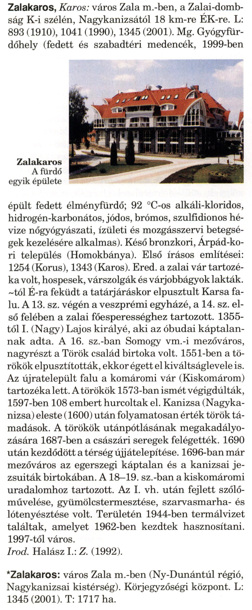 Nyilvános 1535 | 3056 | A szócikkek felismertetett szövege: | (A csillag után a kiegészítő kötetből származó szöveg következik) Zalakaros, Karos: város Zala m.-ben, a Zalai-dombság K-i szélén, Nagykanizsától 18 km-re ÉK-re. L: 893 (1910), 1041 (1990), 1345 (2001). Mg. Gyógyfür-dőhely (fedett és szabadtéri medencék, 1999-ben épült fedett élményfürdő; 92 °C-os alkáli-kloridos, hidrogén-karbonátos, jódos, brómos, szulfidionos hévize nőgyógyászati, ízületi és mozgásszervi betegségek kezelésére alkalmas). Késő bronzkori, Árpád-kori település (Homokbánya). Első írásos említései: 1254 (Korus), 1343 (Karos). Ered. a zalai vár tartozéka volt, hospesek, várszolgák és várjobbágyok lakták. ~tól É-ra feküdt a tatárjáráskor elpusztult Karsa falu. A 13. sz. végén a veszprémi egyházé, a 14. sz. első felében a zalai főesperességhez tartozott. 1355-től I. (Nagy) Lajos királyé, aki az óbudai káptalannak adta. A 16. sz.-ban Somogy vm.-i mezőváros, nagyrészt a Török család birtoka volt. 1551-ben a törökök elpusztították, ekkor égett el kiváltságlevele is. Az újratelepült falu a komáromi vár (Kiskomárom) tartozéka lett. A törökök 1573-ban ismét végigdúlták, 1597-ben 108 embert hurcoltak el. Kanizsa (Nagykanizsa) eleste (1600) után folyamatosan érték török támadások. A törökök utánpótlásának megakadályozására 1687-ben a császári seregek felégették. 1690 után kezdődött a térség újjátelepítése. 1696-ban már mezőváros az egerszegi káptalan és a kanizsai jezsuiták birtokában. A 18—19. sz.-ban a kiskomáromi uradalomhoz tartozott. Az I. vh. után fejlett szőlőművelése, gyümölcstermesztése, szarvasmarha- és lótenyésztése volt. Területén 1944-ben termálvizet találtak, amelyet 1962-ben kezdtek hasznosítani. 1997-től város. Irod. Halász I.: Z. (1992). *Zalakaros: város Zala m.-ben (Ny-Dunántúl régió, Nagykanizsai kistérség). Körjegyzőségi központ. L: 1345 (2001). T: 1717 ha. A szócikkek a következő lexikonból származnak: Cím: Magyar nagylexikon Közreműködő: Élesztős László (1949) (szerk.) ; Barabás Éva (1943) (szerk.) ; Berényi Gábor (1946) (szerk.) ; Bárány Lászlóné (szerk.) ; Adelmann-né Kertész Judit (1945) (közrem.) ; Froemel Károlyné Jáky Éva (1936) (közrem.) ; Akadémiai Kiadó és Nyomda Vállala Szerz. közl.: [... Élesztős László főszerk.] ; [szerk. Barabás Éva et al.] ; [bibliogr. Adelmanné Kertész Judit] ; [kész. az Akadémiai Kiadó Magyar Nagylexikon Szerkesztőségében] Kiadás: Budapest : Akad. K., 1993- Kötetei: 1. köt., A - Anc 2. köt., And - Bag 3. köt., Bah - Bij 4. köt., Bik - Bz 5. köt., C - Csem 6. köt., Csen - Ec 7. köt., Ed - Fe 8. köt., Ff - Gyep 9. köt., Gyer - Iq 10. köt., Ir - Kip 11. köt., Kir - Lem 12. köt., Len - Mep 13. köt., Mer - Nyk 14. köt., Nyl - Pom 15. köt., Pon - Sek 16. köt., Sel - Szö 17. köt., Szp - Ung 18. köt., Unh - Z 19. köt., Kiegészítő kötet, A - Z ETO jelzet: 030=945.11 Szakjelzet: 030 Cutter: M 14 ISBN: 963-05-6611-7 [!ISBN 963-05-6615-X] Nyelv: magyar Megjegyzés: Az 5. kötettől kiad. a Magyar Nagylexikon Kiadó ; A 6. kötettől főszerk. Berényi Gábor ; A 6. kötettől szakszerk. Bárány Lászlóné et al. ; A 6. kötettől bibliogr. Froemel Károlyné ; Bibliogr. a szócikkek végén |