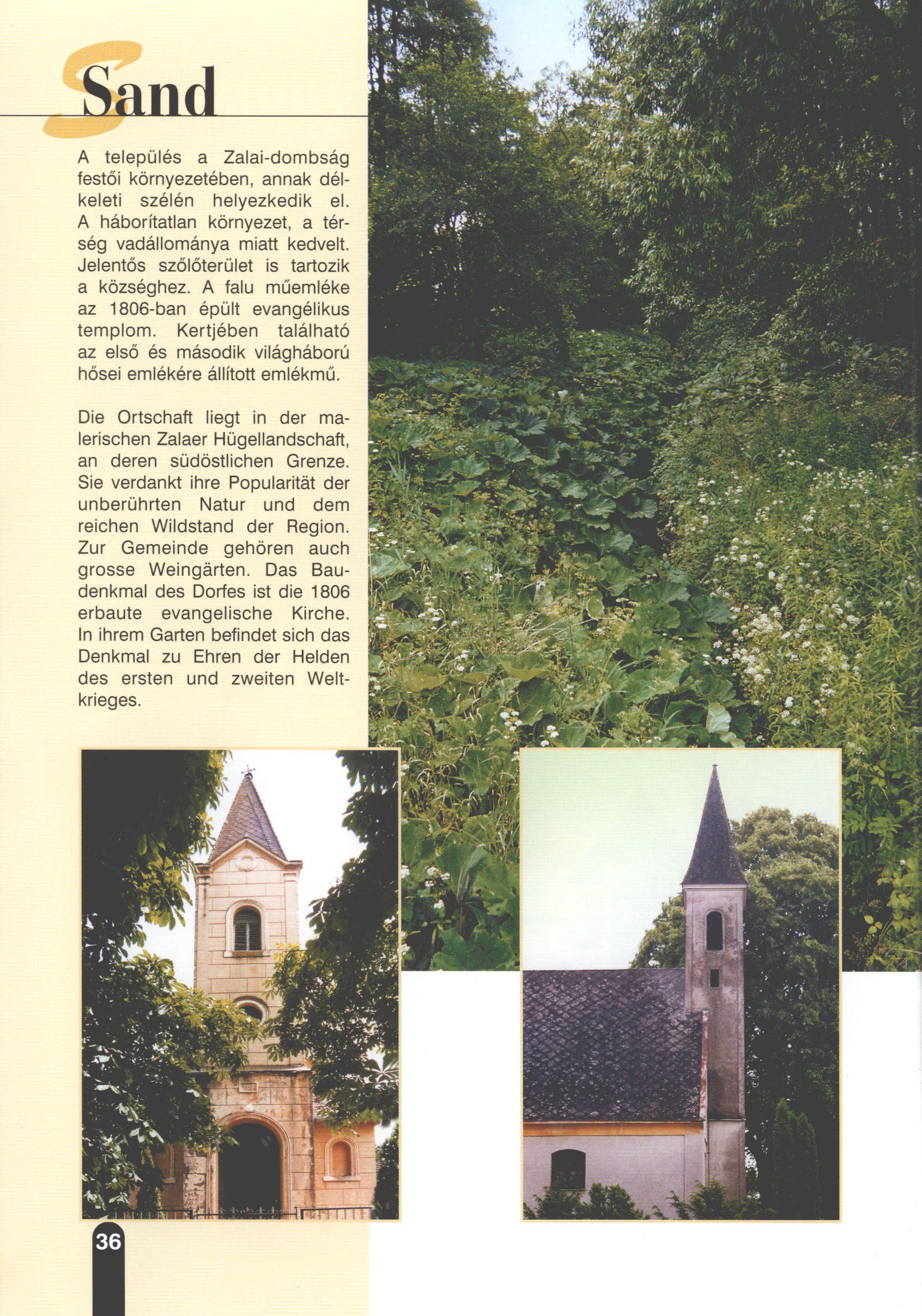 Nyilvános 2673 | 7947 | Sand | Die Ortschaft liegt in der malerischen Zaiaer Hügellandschaft, an deren südöstlichen Grenze. Sie verdankt ihre Popularität der unberührten Natur und dem reichen Wildstand der Region. Zur Gemeinde gehören auch grosse Weingärten. Das Baudenkmal des Dorfes ist die 1806 erbaute evangelische Kirche. In ihrem Garten befindet sich das Denkmal zu Ehren der Helden des ersten und zweiten Weltkrieges. Dieses Text stammt von: Titel: Hívogató a Régiók Kapujában - Útikönyv Látnivalók Nagykanizsán és Térségében (Einladend in dem Tor des Gebiets - Reisebuch - Sehenswürdigkeiten in Nagykanizsa und Umgebung) Herausgegeben von: Nagykanizsa és a Környező Települések Területfejlesztési Társulása (Verein für Gebietsentwicklung in Nagykanizsa und in ihrer Umgebung) 8800 Nagykanizsa, Petőfi Sándor út 5. Tel.: 06 93/536-453 • 06 93/536-454 Tel ./Fax: 06 93/326-323 E-mail: terstars@axelero.hu www.kanizsaterseg.celodin.hu |