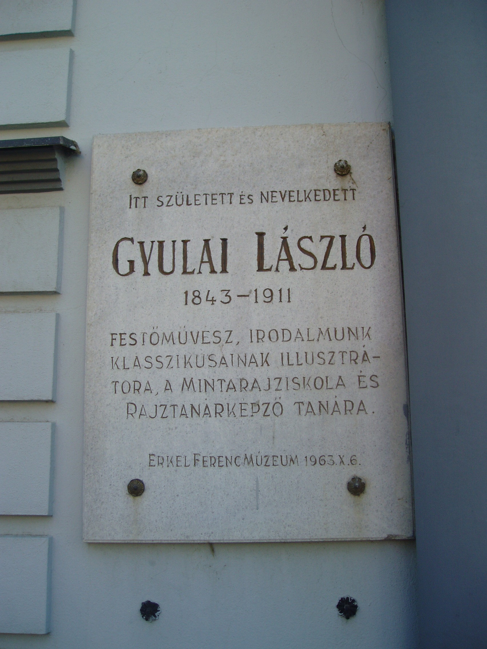 Nyilvános 1510 | 3243 | Rövid leírás | Teljes leírás (970 B) | Gyula, Béke sugárút 4. Az Élővíz csatornán átívelő hídon túl álló épületen emléktábla jelzi, hogy ebben a házban született Gyulai László (1833-1911) festőművész, Munkácsy barátja (eredeti neve Kratochvill László volt.) 1861-ben ismerkedtek meg, amikor Munkácsy - akkor még Lieb Miska - Gyulán élt (lásd: Gyula, Munkácsy u. 15.). Együtt jártak Karl Fisherhez rajzórákat venni (lásd: Gyula, Petőfi tér 5.). Barátságuk Munkácsy távozása után sem szűnt meg. Ösztöndíjjal a müncheni festészeti akadémiára kerültek, ahol együtt is laktak. Amikor pedig a már világhírűvé vált Munkácsy Gyulán járt, meglátogatta a Kratochvill családot is. Gyulai László itthon rajztanárként dolgozott és mint illusztrátor vált ismertté. A fénykép 2007 júliusában készült. Felh. irod.: Czeglédi Imre: Gyula útikalauz. 2. bőv. kiad. Gyula, 1995 |