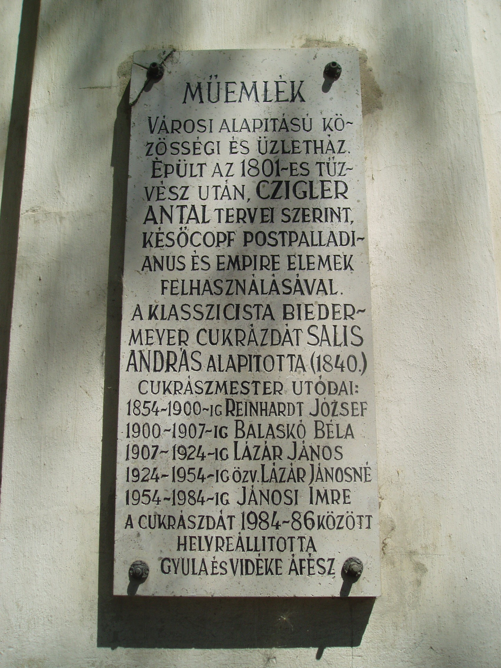 Nyilvános 1535 | 3084 | Rövid leírás | Teljes leírás (1.04 KB) | Gyula, Erkel tér 1. Százéves cukrászda 1801-ben, a nagy tűzvész után épült az egyemeletes, L alakú, műemlékké nyilvánított ház. Erkel térre néző oldala copf- és empire stílusú, a Jókai utca felőli részen klasszicista elemek is felfedezhetők. Műemléki megítélés szerint "korát és színvonalát tekintve a Dél-Alföld legértékesebb emeletes polgárháza". Földszintjén található a megye legrégibb, s az ország egyik legnevezetesebb műemléki cukrászdája, mely bizonyíthatóan legalább 1840 óta fennáll. XIX. századi tulajdonosáról eredetileg Reinhardt-cukrászdának nevezték. A cukrászda elkerülte az államosítást, megőrizték régi berendezését, s a helyiségek reformkori hangulatát. Az udvar felőli folyosón az egykori szabadkéményes cukrászműhely felszereléseit, eszközeit bemutató kiállítás látható. A fénykép 2007 júliusában készült. Felh. irod.: Czeglédi Imre: Gyula útikalauz. 2. bőv. kiad. Gyula, 1995 |