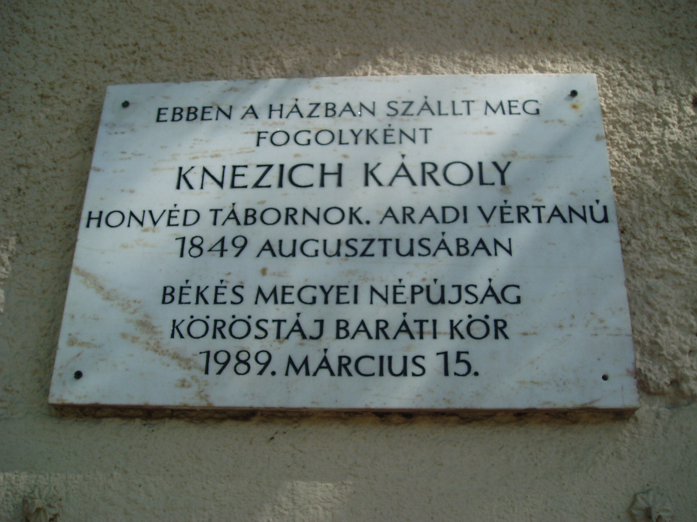 Nyilvános 960 | 1379 | Gyula, Jókai utca 8. Czégényi-ház | Ebben a házban volt elszállásolva 1849. augusztusában Knezich Károly honvéd tábornok, az aradi vértanúk egyike. A lefegyverzéskor kardját Czégényi nevű házigazdájának adta át, s ma a gyulai múzeum becses tulajdona. A szabadságharc tragikus gyulai eseményét lásd: Gyula, Várkert: Honvédtiszti emlékhely. A fénykép 2007 júliusában készült. Felh. irod.: Czeglédi Imre: Gyula útikalauz. 2. jav., bőv. kiad. Gyula, 1995 |