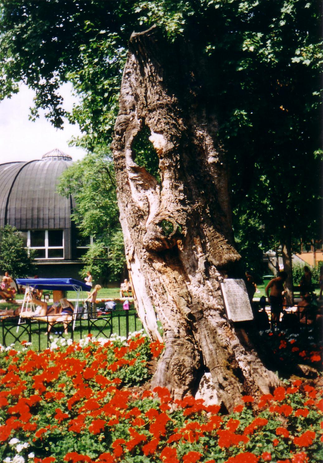 Nyilvános 990 | 1807 | Gyula, Várfürdő utca: Erkel-fa | A mai strandfürdő területén, a Wenckheim-Almásy-kastély egykori parkjának idős fái és növényritkaságai között díszes kovácsoltvas kerítés védi egy juharfa mára már teljesen kiszáradt törzsét, amely alatt a hagyomány szerint Erkel Ferenc szeretett pihenni és komponálni. Emléktáblával is megjelölték a kiszáradt csonkot. D. Nagy András, Gyulán élő Erkel–kutató szerint azonban nem ez a nevezetes fa, hanem valamelyik, szintén ezen a területen, de a kastélyhoz közelebb álló óriás tölgyfa. Véleményét az támasztja alá, hogy a juharfák rövidebb életkorúak, mint a tölgyek, a megjelölt fa abban az időben eredhetett meg a földben, amikor Erkel meghalt, így az 1850-es, 1860-as években semmiképpen nem dolgozhatott alatta. Annyi azért bizonyos, hogy Erkel nyaranta ebben a parkban dolgozott, pihent. A fénykép 2000 júliusában készült. Felh. irod.: Czeglédi Imre: Gyula útikalauz. 2. jav., bőv. kiad. Gyula, 1995 D. Nagy András szóbeli közlése, 2000. július |