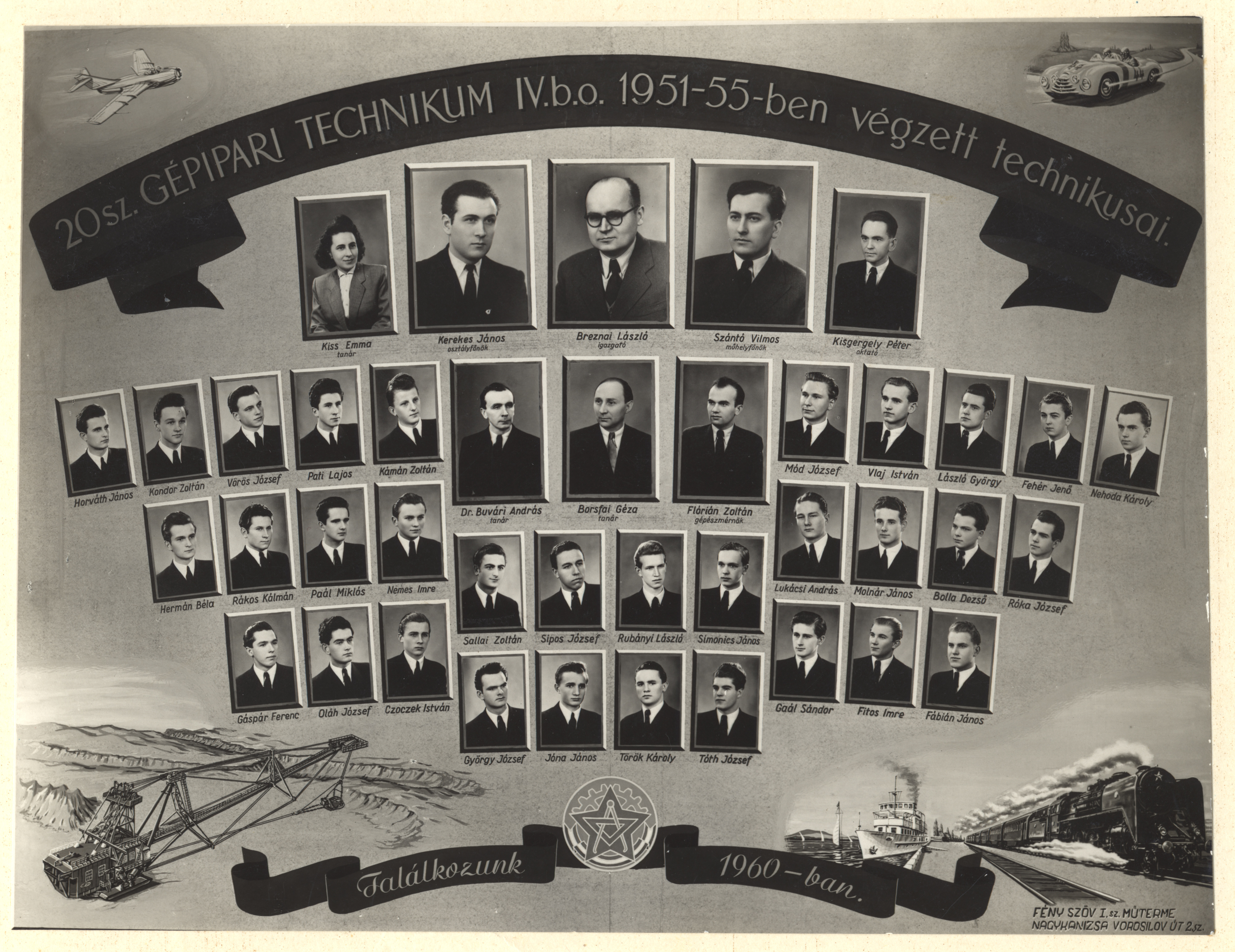 Nyilvános 1306 | 2365 | 20 sz. Gépipari Technikum IV.b.o. 1951-55-ben végzett technikusai | Borsfai Géza tanár Breznai László igazgató Buvári András dr. tanár Flórián Zoltán gépészmérnök Kerekes János osztályfőnök Kisgergely Péter oktató Kiss Emma tanár Szántó Vilmos műhelyfőnök Bolla Dezső Czoczek István Fábián János Fehér Jenő Fitos Imre Gaál Sándor Gáspár Ferenc György József Hermán Béla Horváth János Jóna János Kámán Zoltán Kondor Zoltán László György Lukácsi András Mód József Molnár János Nehoda Károly Nemes Imre Oláh József Paál Miklós Pati Lajos Rákos Kálmán Róka József Rubányi László Sallai Zoltán Simonics János Sipos József Tóth József Török Károly Vlaj István Vörös József |