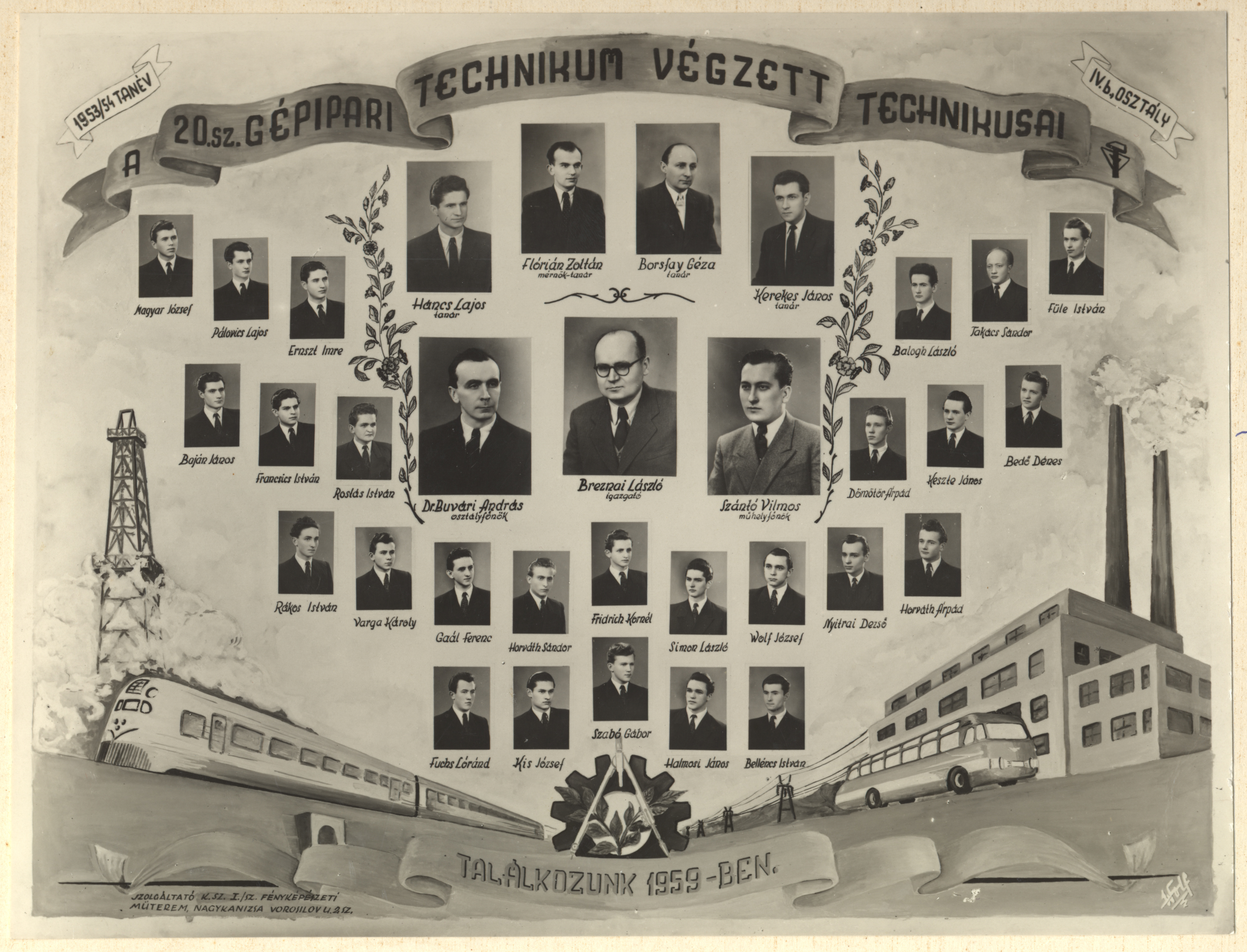 Nyilvános 1369 | 2564 | 1953/54 tanév IV.b. osztály - a 20.sz. Gépipari Technikum végzett technikusai | Borsfay Géza tanár Breznai László igazgató Buvári András dr. osztályfőnök Flórián Zoltán mérnök-tanár Háncs Lajos tanár Kerekes János tanár Szántó Vilmos műhelyfőnök Baján János Balogh László Bedő Dénes Belléncs István Dömötör Árpád Ernszt Imre Francsics István Fridrich Kornél Fuchs Lóránd Füle István Gaál Ferenc Halmosi János Horváth Árpád Horváth Sándor Keszte János Kis József Magyar József Nyitrai Dezső Pálovics Lajos Rákos István Rostás István Simon László Szabó Gábor Takács Sándor Varga Károly Wolf József |