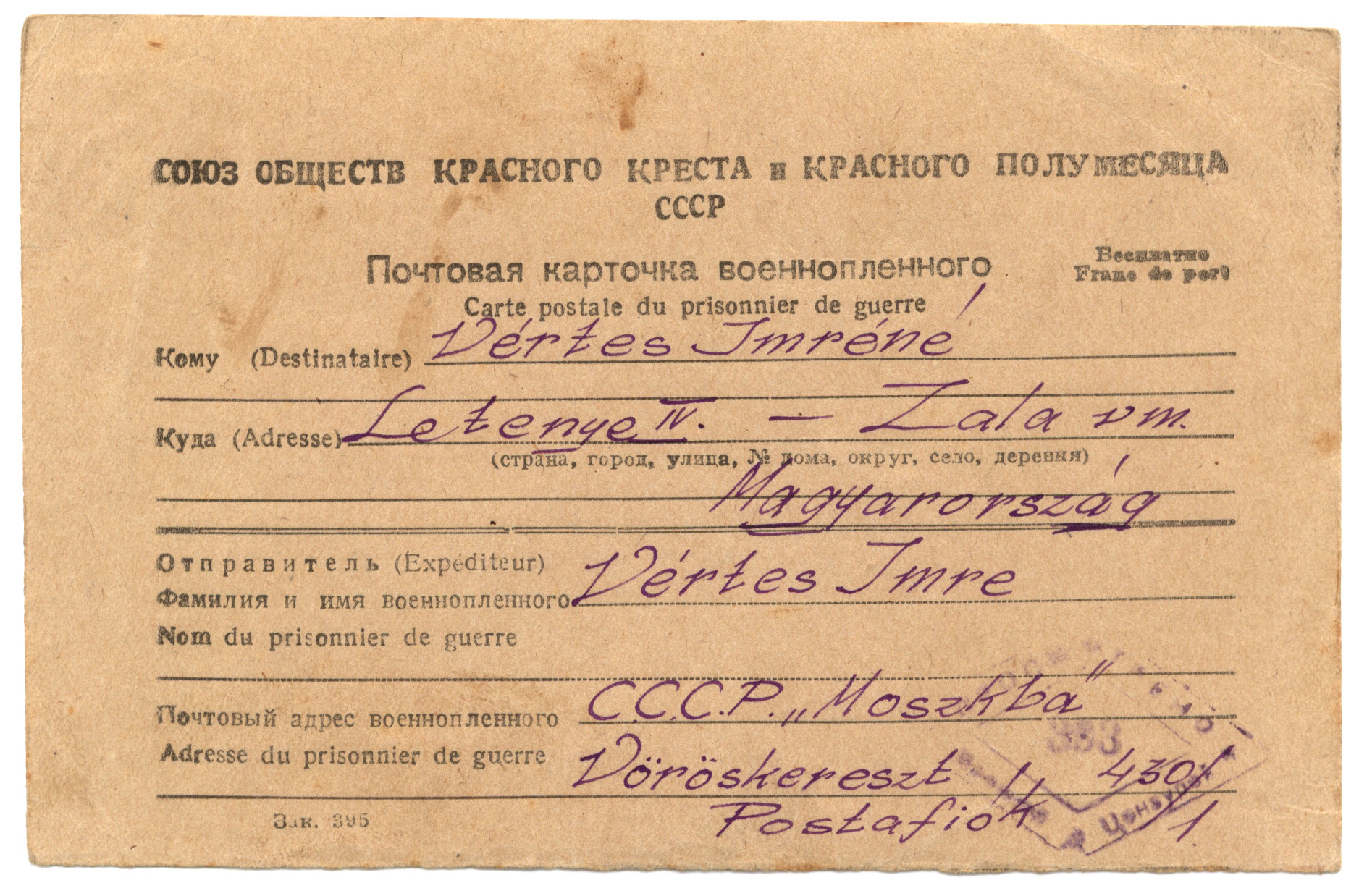 Nyilvános 1251 | 2159 | Vértes Imréné | Letenye IV. - Zala vm. Magyarország Vértes Imre hdgy. C.C.C.P. "Moszkva" Vöröskereszt, Postafiók 430/1. c. 10. IV. hó 1947. (Kaptam V. 12-én) Kedveseim! Húsvét volt, ünnep. Hogy gondoltam Rátok? Így! Volt nékem kis váram, mesekinccsel ékes, Szerelemmel, szívvel, széppel, jóval fényes. Aranyasszony ajka, gyermekkacaj hangja Csilingelt a szívben boldogság harangja. Mit éreztem? Amit Te szoktál érezni-, Sárikám - mikor a négy alvó kisgyerek fölött imát dalol a szíved. Nagy, tiszta, szép vágyat! A szép élet utáni vágyat. Apuka |