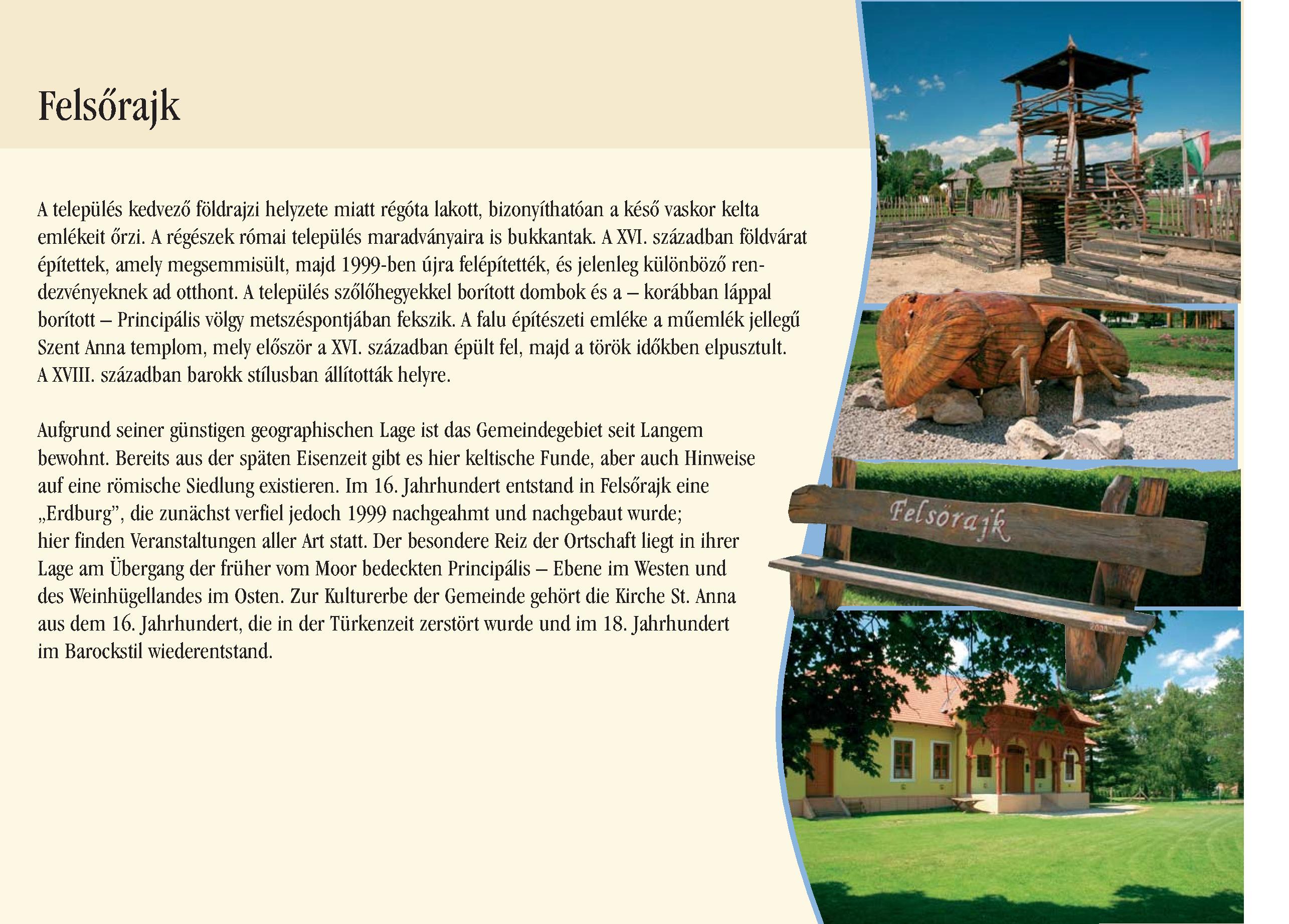 Nyilvános 2407 | 6909 | Felsőrajk | Aufgrund seiner günstigen geographischen Lage ist das Gemeindegebiet seit Langem bewohnt. Bereits aus der späten Eisenzeit gibt es hier keltische Funde, aber auch Hinweise auf eine römische Siedlung existieren. Im 16. Jahrhundert entstand in Felsőrajk eine ,,Erdburg", die zunächst verfiel jedoch 1999 nachgeahmt und nachgebaut wurde; hier finden Veranstaltungen aller Art statt. Der besondere Reiz der Ortschaft liegt in ihrer Lage am Übergang der früher vom Moor bedeckten Principális Ebene im Westen und des Weinhügellandes im Osten. Zur Kulturerbe der Gemeinde gehört die Kirche St. Anna aus dem 16. Jahrhundert, die in der Türkenzeit zerstört wurde und im 18. Jahrhundert im Barockstil wiederentstand. Dieses Text stammt von: Pannonhát tájpark prospektus 2006. Web: http://www.pannonhat.hu/ (auch in Deutsch) |