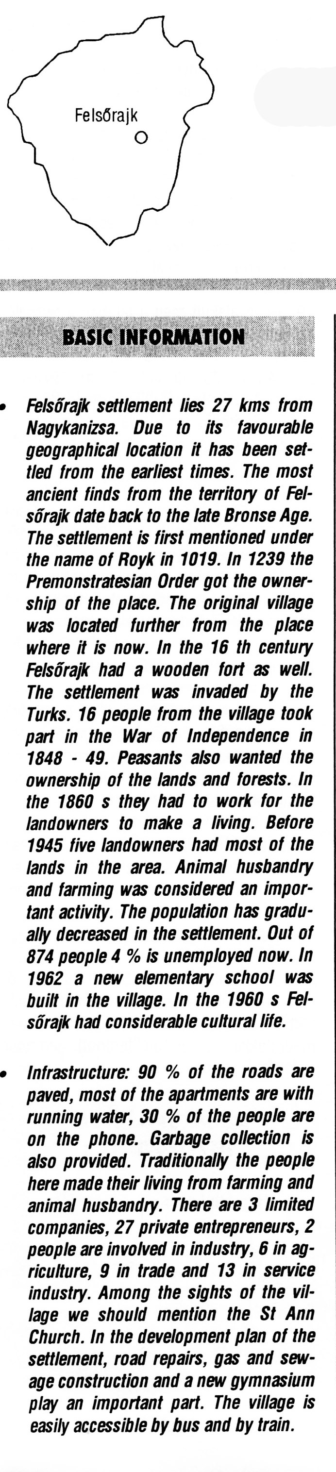 Nyilvános 2354 | 6838 | Felsőrajk | BASIC INFORMATION • Felsőrajk settlement lies 27 kms from Nagykanizsa. Due to its favourable geographical location it has been settled from the earliest times. The most ancient finds from the territory of Felsőrajk date back to the late Bronse Age. The settlement is first mentioned under the name of Royk in 1019. In 1239 the Premonstratesian Order got the ownership of the place. The original village was located further from the place where it is now. In the 16 th century Felsőrajk had a wooden fort as well. The settlement was invaded by the Turks. 16 people from the village took part in the War of Independence in 1848 - 49. Peasants also wanted the ownership of the lands and forests. In the 1860 s they had to work for the landowners to make a living. Before 1945 five landowners had most of the lands in the area. Animal husbandry and farming was considered an important activity. The population has gradually decreased in the settlement. Out of 874 people 4% is unemployed now. In 1962 a new elementary school was built in the village. In the 1960 s Felsőrajk had considerable cultural life. • Infrastructure: 90 % of the roads are paved, most of the apartments are with running water, 30 % of the people are on the phone. Garbage collection is also provided. Traditionally the people here made their living from farming and animal husbandry. There are 3 limited companies, 27 private entrepreneurs, 2 people are involved in industry, 6 in agriculture, 9 in trade and 13 in service industry. Among the sights of the village we should mention the St Ann Church. In the development plan of the settlement, road repairs, gas and sewage construction and a new gymnasium play an important part. The village is easily accessible by bus and by train. This text came from the following book: Title: Handbook of Zala county (Zala megye kézikönyve) Series: County handbooks of Hungary (Magyarország megyei kézikönyvei) Chief editor: Hóbor József Publisher: (Hatvan), CEBA-Hungary Ltd, 1998 ETO: 908.439.121(035) ; 050.8(439.121) ISBN: 963-9089-18-2 Pages: 488-1040 p. Remark: Closed on: 1998. márc. 31. |