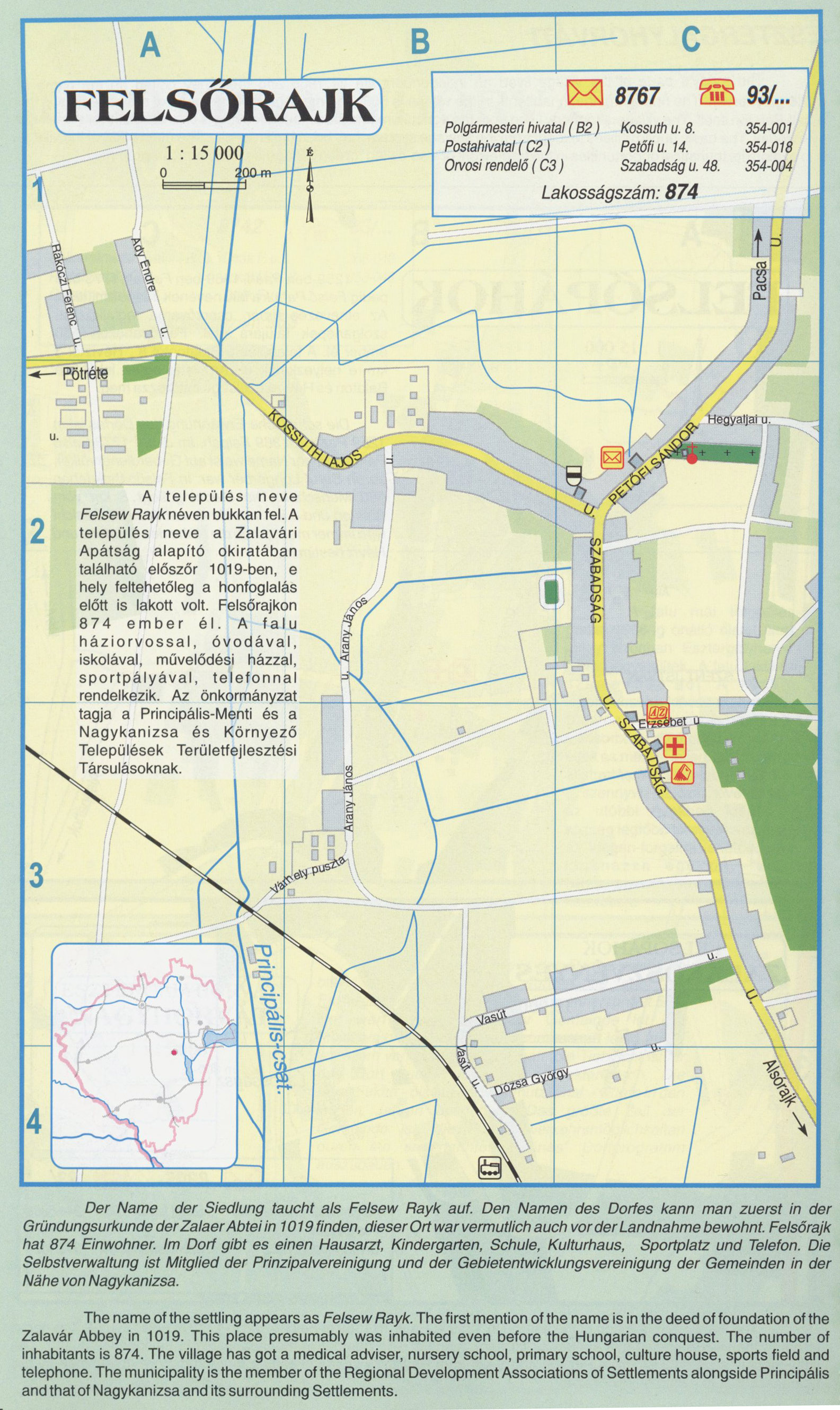 Nyilvános 2409 | 7930 | Felsőrajk | A település neveFelsew Rayknéven bukkan fel. A település neve a Zalavári Apátság alapító okiratában található először 1019-ben, e hely feltehetőleg a honfoglalás előtt is lakott volt. Felsőrajkon 874 ember él. A falu háziorvossal, óvodával, iskolával, művelődési házzal, sportpályával, telefonnal.rendelkezik. Az önkormányzat tagja a Principális-Menti és a Nagykanizsa és Környező Települések Területfejlesztési Társulásoknak. Der Name der Siedlung taucht als Felsew Rayk auf. Den Namen des Dorfes kann man zuerst in der Gründungsurkunde der Zalaer Abtei in 1019 finden, dieser Ort war vermutlich auch vor der Landnahme bewohnt. Felsőrajk hat 874 Einwohner. Im Dorf gibt es einen Hausarzt, Kindergarten, Schule, Kulturhaus, Sportplatz und Telefon. Die Selbstverwaltung ist Mitglied der Prinzipalvereinigung und der Gebietentwicklungsvereinigung der Gemeinden in der Nähe von Nagykanizsa. The name of the settling appears as Felsew Rayk. The first mention of the name is in the deed of foundation of the Zalavár Abbey in 1019. This place presumably was inhabited even before the Hungarian conquest. The number of inhabitants is 874. The village has got a medical adviser, nursery school, primary school, culture house, sports field and telephone. The municipality is the member of the Regional Development Associations of Settlements alongside Principális and that of Nagykanizsa and its surrounding Settlements. A részlet a következő kiadványból származik/Die Teile stammen vom volgenden Buch/This text came from the following book: Cím/Titel/Title: Zala megye településeinek atlasza - 257 település részletes térképe/Atlas der Komitat Zala - 257 Detailte Siedlungskarten/Zala county\'s Atlas - 257 settlement maps. Közreműködő/contributor: Lackner László (1943) (fotó) Kiadás/Ausgabe/Publisher: Gyula : HISZI-MAP, 1997 Sorozat/Serie/Series: Indulástól - megérkezésig... ETO: 912(439.121-2) ; 908.439.121 Cutter: Z 19 ISBN: 963-610-025-4 Oldalszám/Seiten/Pages: 323, 81 p. Megjegyzés/Note: Lezárva/Abgeschlossen am/Closed am: 1997. máj. 30. |