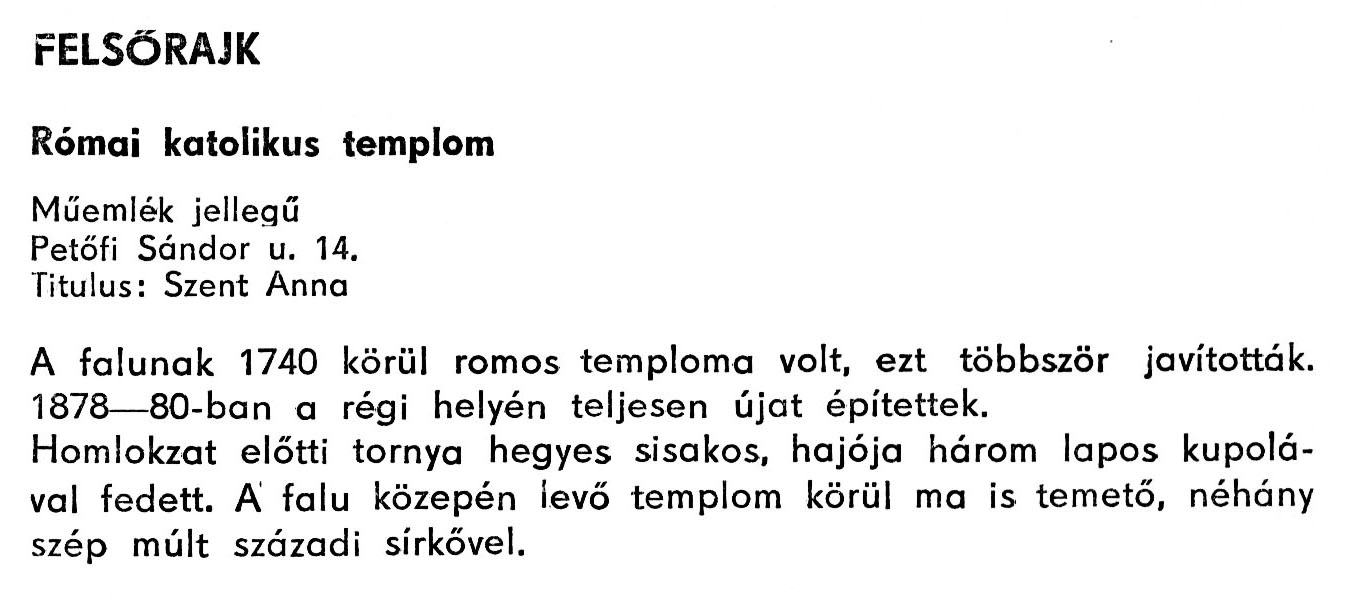 Nyilvános 1987 | 4123 | Felsőrajk - Zala megye műemlékei 1979 068old | A részlet szövege: FELSŐRAJK Római katolikus templom Műemlék jellegű Petőfi Sándor u. 14. Titulus: Szent Anna A falunak 1740 körül romos temploma volt, ezt többször javították. 1878–80-ban a régi helyén teljesen újat építettek. Homlokzat előtti tornya hegyes sisakos, hajója három lapos kupolával fedett. A falu közepén levő templom körül ma is temető, néhány szép múlt századi sírkővel. A részlet a következő könyvből származik: Cím: Zala megye műemlékei Szerző: Németh József (1928) Közreműködő: Vándor László (szerk.) ; Szabóky Zsolt (1941) (fotó) Szerz. közl.: Németh József ; [szerk. Vándor László] ; [fotók... Szabóky Zsolt] Kiadás jelzés: 2. bőv. kiad. Kiadás: Zalaegerszeg : Zalai Ny., 1979 ETO jelzet: 72(439.121) ; 7.025.3/.4(439.121) ; 908.439.121 Tárgyszó: Zala Szakjelzet: 908 Cutter: N 53 Nyelv: magyar Oldalszám: 134 p. |