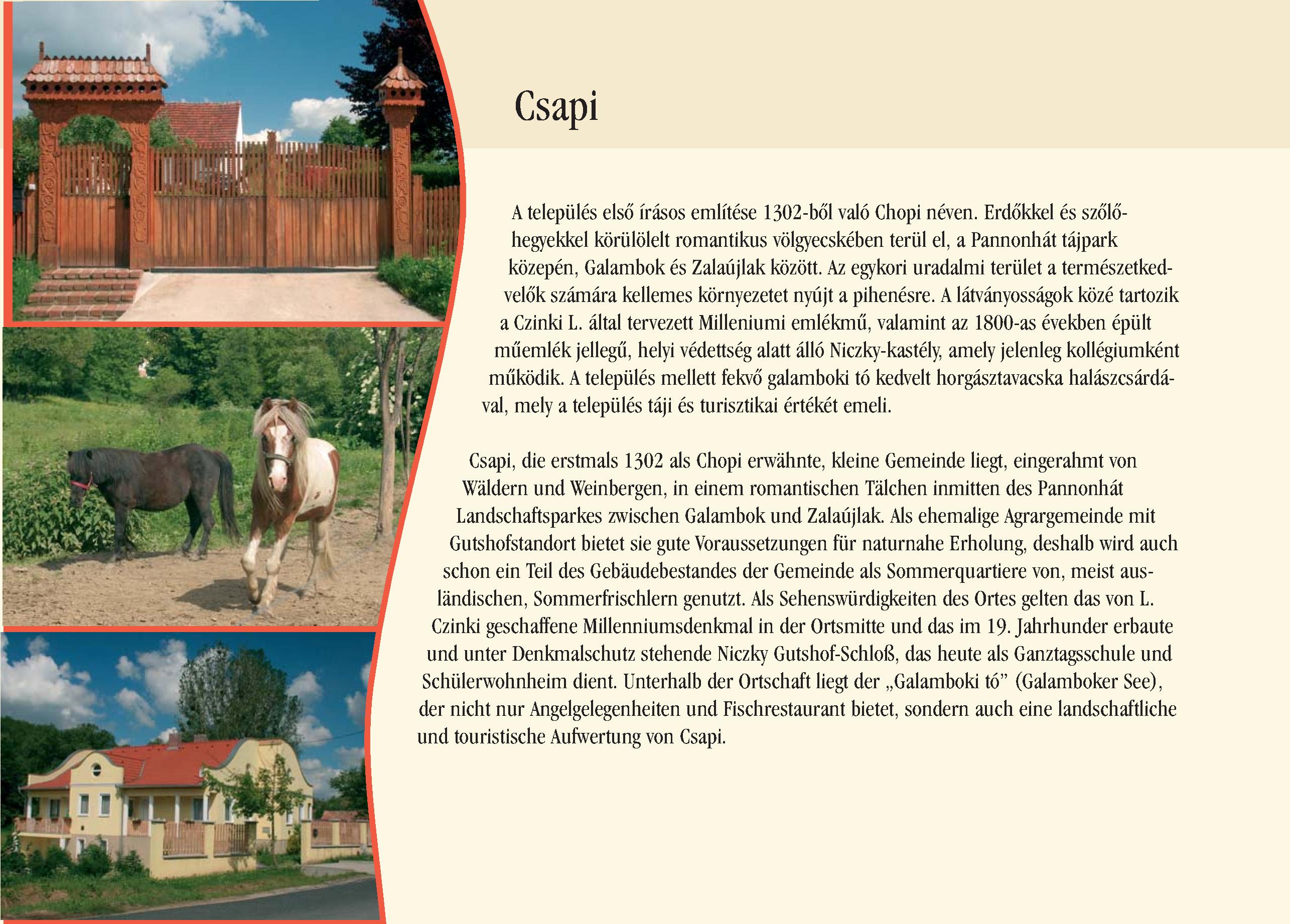Nyilvános 2384 | 8486 | Csapi | Csapi, die erstmals 1302 als Chopi erwähnte, kleine Gemeinde liegt, eingerahmt von Wäldern und Weinbergen, in einem romantischen Tälchen inmitten des Pannonhát Landschaftsparkes zwischen Galambok und Zalaújlak. Als ehemalige Agrargemeinde mit Gutshofstandort bietet sie gute Voraussetzungen für naturnahe Erholung, deshalb wird auch schon ein Teil des Gebäudebestandes der Gemeinde als Sommerquartiere von, meist ausländischen, Sommerfrischlern genutzt. Als Sehenswürdigkeiten des Ortes gelten das von L. Czinki geschaffene Millenniumsdenkmal in der Ortsmitte und das im 19. Jahrhunder erbaute und unter Denkmalschutz stehende Niczky Gutshof-Schloß, das heute als Ganztagsschule und Schülerwohnheim dient. Unterhalb der Ortschaft liegt der ,,Galamboki tó" (Galamboker See), der nicht nur Angelgelegenheiten und Fischrestaurant bietet, sondern auch eine landschaftliche und touristische Aufwertung von Csapi. Dieses Text stammt von: Pannonhát tájpark prospektus 2006. Web: http://www.pannonhat.hu/ (auch in Deutsch) |