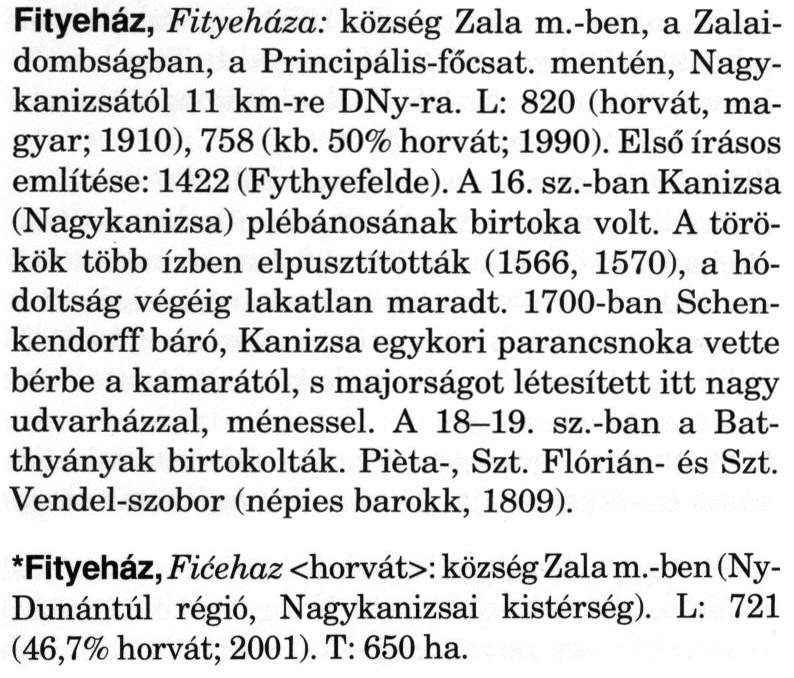 Nyilvános 2312 | 5865 | A szócikkek felismertetett szövege: | (A csillag után a kiegészítő kötetből származó szöveg következik) Fityeház, Fityeháza: község Zala m.-ben, a Zalaidombságban, a Principális-főcsat. mentén, Nagykanizsától 11 km-re DNy-ra. L: 820 (horvát, magyar; 1910), 758 (kb. 50% horvát; 1990). Első írásos említése: 1422 (Fythyefelde). A 16. sz.-ban Kanizsa (Nagykanizsa) plébánosának birtoka volt. A törökök több ízben elpusztították (1566, 1570), a hódoltság végéig lakatlan maradt. 1700-ban Schen-kendorff báró, Kanizsa egykori parancsnoka vette bérbe a kamarától, s majorságot létesített itt nagy udvarházzal, ménessel. A 18—19. sz.-ban a Bat-thyányak birtokolták. Piéta-, Szt. Flórián- és Szt. Vendel-szobor (népies barokk, 1809). *Fityeház, Ficehaz <horvát>: község Zala m.-ben (Ny-Dunántúl régió, Nagykanizsai kistérség). L: 721 (46,7% horvát; 2001). T: 650 ha. A szócikkek a következő lexikonból származnak: Cím: Magyar nagylexikon Közreműködő: Élesztős László (1949) (szerk.) ; Barabás Éva (1943) (szerk.) ; Berényi Gábor (1946) (szerk.) ; Bárány Lászlóné (szerk.) ; Adelmann-né Kertész Judit (1945) (közrem.) ; Froemel Károlyné Jáky Éva (1936) (közrem.) ; Akadémiai Kiadó és Nyomda Vállala Szerz. közl.: [... Élesztős László főszerk.] ; [szerk. Barabás Éva et al.] ; [bibliogr. Adelmanné Kertész Judit] ; [kész. az Akadémiai Kiadó Magyar Nagylexikon Szerkesztőségében] Kiadás: Budapest : Akad. K., 1993- Kötetei: 1. köt., A - Anc 2. köt., And - Bag 3. köt., Bah - Bij 4. köt., Bik - Bz 5. köt., C - Csem 6. köt., Csen - Ec 7. köt., Ed - Fe 8. köt., Ff - Gyep 9. köt., Gyer - Iq 10. köt., Ir - Kip 11. köt., Kir - Lem 12. köt., Len - Mep 13. köt., Mer - Nyk 14. köt., Nyl - Pom 15. köt., Pon - Sek 16. köt., Sel - Szö 17. köt., Szp - Ung 18. köt., Unh - Z 19. köt., Kiegészítő kötet, A - Z ETO jelzet: 030=945.11 Szakjelzet: 030 Cutter: M 14 ISBN: 963-05-6611-7 [!ISBN 963-05-6615-X] Nyelv: magyar Megjegyzés: Az 5. kötettől kiad. a Magyar Nagylexikon Kiadó ; A 6. kötettől főszerk. Berényi Gábor ; A 6. kötettől szakszerk. Bárány Lászlóné et al. ; A 6. kötettől bibliogr. Froemel Károlyné ; Bibliogr. a szócikkek végén |