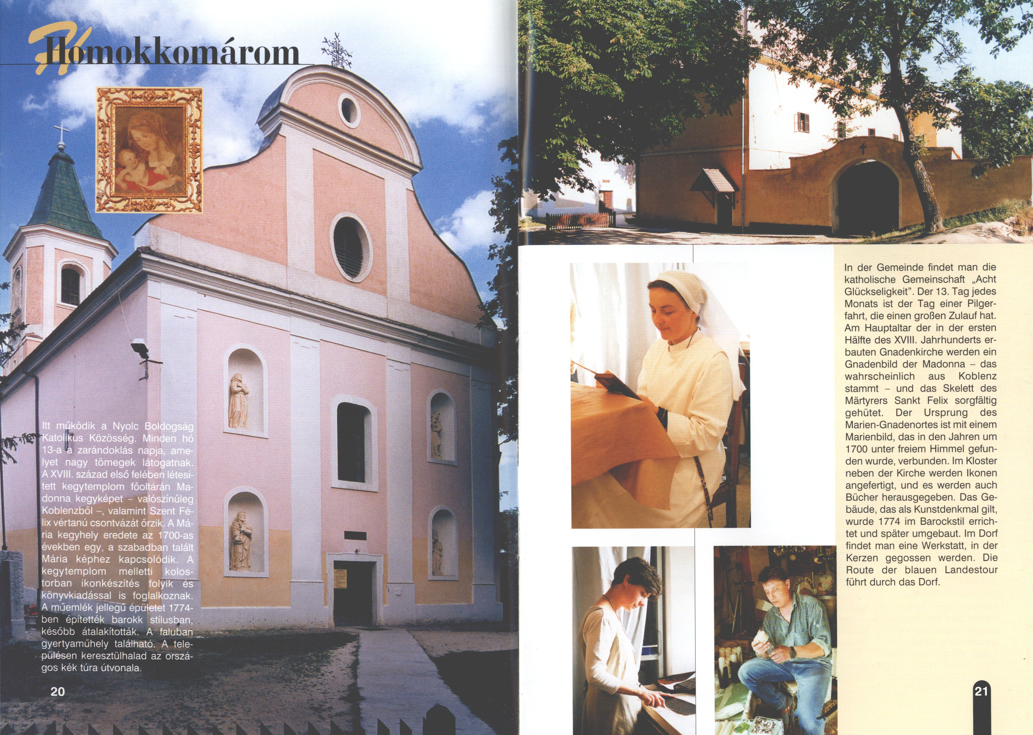 Nyilvános 2137 | 5775 | Homokkomárom | In der Gemeinde findet man die katholische Gemeinschaft „Acht Glückseligkeit". Der 13. Tag jedes Monats ist der Tag einer Pilgerfahrt, die einen großen Zulauf hat. Am Hauptaltar der in der ersten Hälfte des XVIII. Jahrhunderts erbauten Gnadenkirche werden ein Gnadenbild der Madonna - das wahrscheinlich aus Koblenz stammt - und das Skelett des Märtyrers Sankt Felix sorgfältig gehütet. Der Ursprung des Marien-Gnadenortes ist mit einem Marienbild, das in den Jahren um 1700 unter freiem Himmel gefunden wurde, verbunden. Im Kloster neben der Kirche werden Ikonen angefertigt, und es werden auch Bücher herausgegeben. Das Gebäude, das als Kunstdenkmal gilt, wurde 1774 im Barockstil errichtet und später umgebaut. Im Dorf findet man eine Werkstatt, in der Kerzen gegossen werden. Die Route der blauen Landestour führt durch das Dorf. Dieses Text stammt von: Titel: Hívogató a Régiók Kapujában - Útikönyv Látnivalók Nagykanizsán és Térségében (Einladend in dem Tor des Gebiets - Reisebuch - Sehenswürdigkeiten in Nagykanizsa und Umgebung) Herausgegeben von: Nagykanizsa és a Környező Települések Területfejlesztési Társulása (Verein für Gebietsentwicklung in Nagykanizsa und in ihrer Umgebung) 8800 Nagykanizsa, Petőfi Sándor út 5. Tel.: 06 93/536-453 • 06 93/536-454 Tel ./Fax: 06 93/326-323 E-mail: terstars@axelero.hu www.kanizsaterseg.celodin.hu |