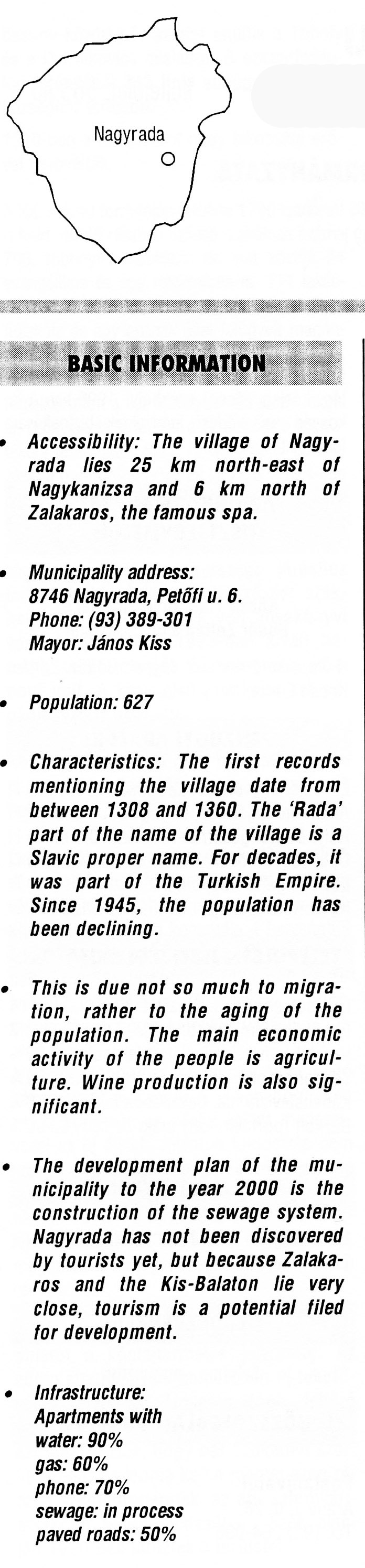 Nyilvános 2013 | 5574 | Nagyrada | BASIC INFORMATION Accessibility: The village of Nagy¬rada lies 25 km north-east of Nagykanizsa and 6 km north of Zalakaros, the famous spa. Municipality address: 8746 Nagyrada, Petőfi u. 6. Phone: (93) 389-301 Mayor: János Kiss Population: 627 Characteristics: The first records mentioning the village date from between 1308 and 1360. The \'Rada\' part of the name of the village is a Slavic proper name. For decades, it was part of the Turkish Empire. Since 1945, the population has been declining. This is due not so much to migra¬tion, rather to the aging of the population. The main economic activity of the people is agricul¬ture. Wine production is also sig¬nificant. The development plan of the mu¬nicipality to the year 2000 is the construction of the sewage system. Nagyrada has not been discovered by tourists yet, but because Zalaka-ros and the Kis-Balaton lie very close, tourism is a potential filed for development. Infrastructure: Apartments with water: 90% gas: 60% phone: 70% sewage: in process paved roads: 50% This text came from the following book: Title: Handbook of Zala county (Zala megye kézikönyve) Series: County handbooks of Hungary (Magyarország megyei kézikönyvei) Chief editor: Hóbor József Publisher: (Hatvan), CEBA-Hungary Ltd, 1998 ETO: 908.439.121(035) ; 050.8(439.121) ISBN: 963-9089-18-2 Pages: 488-1040 p. Remark: Closed on: 1998. márc. 31. |