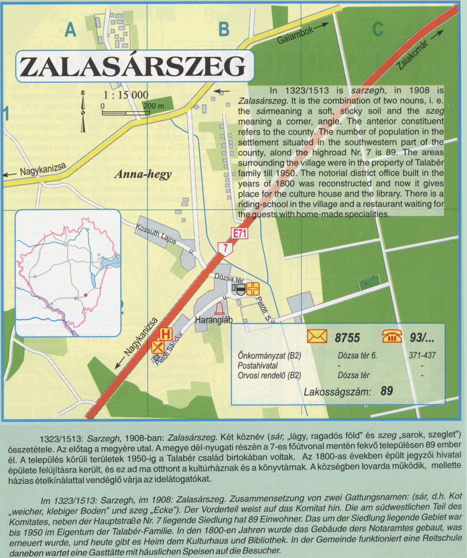 Nyilvános 2268 | 8671 | ZALASÁRSZEG | 1323/1513: Sarzegh, 1908-ban: Zalasárszeg. Két köznév (sár, „lágy, ragadós föld" és szeg „sarok, szeglet") összetétele. Az előtag a megyére utal. A megye dél-nyugati részén a 7-es főútvonal mentén fekvő településen 89 ember él. A település körüli területek 1950-ig a Talabér család birtokában voltak. Az 1800-as években épült jegyzői hivatal épülete felújításra került, és ez ad ma otthont a kultúrháznak és a könyvtárnak. A községben lovarda működik, mellette házias ételkínálattal vendéglő várja az idelátogatókat. lm 1323/1513: Sarzegh, im 1908: Zalasárszeg. Zusammensetzung von zwei Gattungsnamen: (sár, d.h. Kot „weicher, klebiger Boden" und szeg „Ecke"). Der Vorderteil weist auf das Komitat hin. Die am südwestlichen Teil des Komitates, neben der Hauptstraße Nr. 7 liegende Siedlung hat 89 Einwohner. Das um der Siedlung liegende Gebiet war bis 1950 im Eigentum der Talabér-Familie. In den 1800-en Jahren wurde das Gebäude ders Notaramtes gebaut, was erneuert wurde, und heute gibt es Heim dem Kulturhaus und Bibliothek. In der Gemeinde funktioniert eine Reitschule daneben wartet eine Gasttätte mit häuslichen Speisen auf die Besucher. In 1323/1513 is sarzegh, in 1908 is, Zalasárszeg. It is the combination of two nouns, i. e. the sármeaning a soft, sticky soil and the szeg meaning a corner, angle. The anterior constituent refers to the county. The number of population in the settlement situated in the southwestern part of the county, alond the highroad Nr. 7 is 89. The areas surrounding the village were in the property of Talabér family till 1950. The notorial district office built in the years of 1800 was reconstructed and now it gives place for the culture house and the library. There is a riding-school in the village and a restaurant waiting for the guests, with home-made specialities. A részlet a következő kiadványból származik/Die Teile stammen vom volgenden Buch/This text came from the following book: Cím/Titel/Title: Zala megye településeinek atlasza - 257 település részletes térképe/Atlas der Komitat Zala - 257 Detailte Siedlungskarten/Zala county\'s Atlas - 257 settlement maps. Közreműködő/contributor: Lackner László (1943) (fotó) Kiadás/Ausgabe/Publisher: Gyula : HISZI-MAP, 1997 Sorozat/Serie/Series: Indulástól - megérkezésig... ETO: 912(439.121-2) ; 908.439.121 Cutter: Z 19 ISBN: 963-610-025-4 Oldalszám/Seiten/Pages: 323, 81 p. Megjegyzés/Note: Lezárva/Abgeschlossen am/Closed am: 1997. máj. 30. |