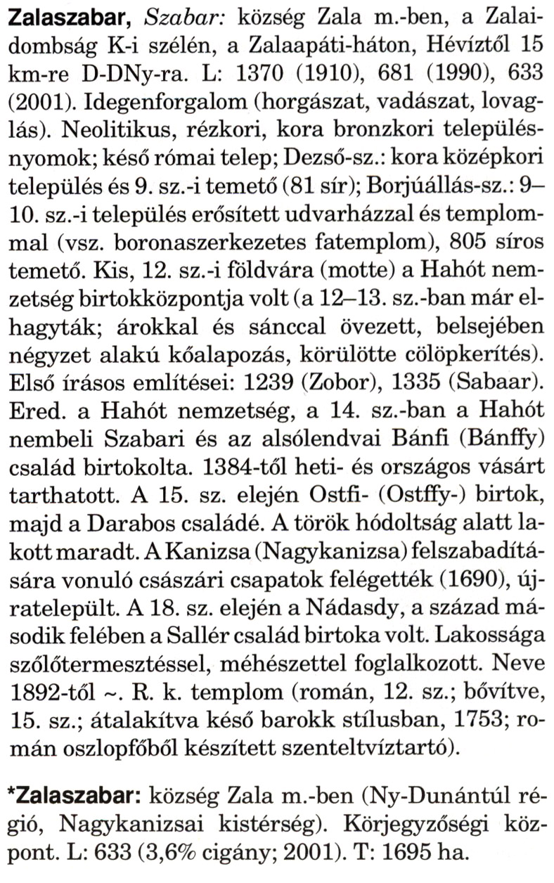 Nyilvános 2190 | 5726 | A szócikkek felismertetett szövege: | (A csillag után a kiegészítő kötetből származó szöveg következik) Zalaszabar, Szabar: község Zala m.-ben, a Zalai-dombság K-i szélén, a Zalaapáti-háton, Hévíztől 15 km-re D-DNy-ra. L: 1370 (1910), 681 (1990), 633 (2001). Idegenforgalom (horgászat, vadászat, lovaglás). Neolitikus, rézkori, kora bronzkori településnyomok; késő római telep; Dezső-sz.: kora középkori település és 9. sz.-i temető (81 sír); Borjúállás-sz.: 9— 10. sz.-i település erősített udvarházzal és templommal (vsz. boronaszerkezetes fatemplom), 805 síros temető. Kis, 12. sz.-i földvára (motte) a Hahót nemzetség birtokközpontja volt (a 12—13. sz.-ban már elhagyták; árokkal és sánccal övezett, belsejében négyzet alakú kőalapozás, körülötte cölöpkerítés). Első írásos említései: 1239 (Zobor), 1335 (Sabaar). Ered. a Hahót nemzetség, a 14. sz.-ban a Hahót nembeli Szabari és az alsólendvai Bánfi (Bánffy) család birtokolta. 1384-től heti- és országos vásárt tarthatott. A 15. sz. elején Ostfi- (Ostffy-) birtok, majd a Darabos családé. A török hódoltság alatt lakott maradt. A Kanizsa (Nagykanizsa) felszabadítására vonuló császári csapatok felégették (1690), újratelepült. A 18. sz. elején a Nádasdy, a század második felében a Sallér család birtoka volt. Lakossága szőlőtermesztéssel, méhészettel foglalkozott. Neve 1892-től ~. R. k. templom (román, 12. sz.; bővítve, 15. sz.; átalakítva késő barokk stílusban, 1753; román oszlopfőből készített szenteltvíztartó). *Zalaszabar: község Zala m.-ben (Ny-Dunántúl régió, Nagykanizsai kistérség). Körjegyzőségi központ. L: 633 (3,6% cigány; 2001). T: 1695 ha. A szócikkek a következő lexikonból származnak: Cím: Magyar nagylexikon Közreműködő: Élesztős László (1949) (szerk.) ; Barabás Éva (1943) (szerk.) ; Berényi Gábor (1946) (szerk.) ; Bárány Lászlóné (szerk.) ; Adelmann-né Kertész Judit (1945) (közrem.) ; Froemel Károlyné Jáky Éva (1936) (közrem.) ; Akadémiai Kiadó és Nyomda Vállala Szerz. közl.: [... Élesztős László főszerk.] ; [szerk. Barabás Éva et al.] ; [bibliogr. Adelmanné Kertész Judit] ; [kész. az Akadémiai Kiadó Magyar Nagylexikon Szerkesztőségében] Kiadás: Budapest : Akad. K., 1993- Kötetei: 1. köt., A - Anc 2. köt., And - Bag 3. köt., Bah - Bij 4. köt., Bik - Bz 5. köt., C - Csem 6. köt., Csen - Ec 7. köt., Ed - Fe 8. köt., Ff - Gyep 9. köt., Gyer - Iq 10. köt., Ir - Kip 11. köt., Kir - Lem 12. köt., Len - Mep 13. köt., Mer - Nyk 14. köt., Nyl - Pom 15. köt., Pon - Sek 16. köt., Sel - Szö 17. köt., Szp - Ung 18. köt., Unh - Z 19. köt., Kiegészítő kötet, A - Z ETO jelzet: 030=945.11 Szakjelzet: 030 Cutter: M 14 ISBN: 963-05-6611-7 [!ISBN 963-05-6615-X] Nyelv: magyar Megjegyzés: Az 5. kötettől kiad. a Magyar Nagylexikon Kiadó ; A 6. kötettől főszerk. Berényi Gábor ; A 6. kötettől szakszerk. Bárány Lászlóné et al. ; A 6. kötettől bibliogr. Froemel Károlyné ; Bibliogr. a szócikkek végén |
