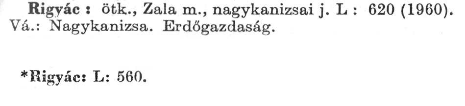 Nyilvános 2357 | 6127 | A szócikkek felismertetett szövege: | (Az első csillag után az 1972-es, a második csillag után az 1981-es kiadású kiegészítő kötetből származó szöveg következik) Rigyác: ötk., Zala m., nagykanizsai j. L: 620(1960). Vá.: Nagykanizsa. Erdőgazdaság. *Rigyác: L: 560. A szócikkek a következő lexikonból származnak: Cím: Új magyar lexikon Közreműködő: Berei Andor (1900-1979) (szerk.) Szerz. közl.: [szerk. Berei Andor et al.] Kiadás jelzés: 2. lny. Kiadás: Budapest : Akad. K., 1961-1962 Kötetei: 1., A - C 2., D - F 3., G - J 4., K - Me 5., Mf - R 6., S - Z 7. köt., A-Z Kiegészítő kötet (1972) Kiegészítő kötet, 1962÷1980 (1981) ETO jelzet: 03=945.11 Szakjelzet: 030 Cutter: U 28 Nyelv: magyar Megjegyzés: Bibliogr. a címszavak egy részének végén |