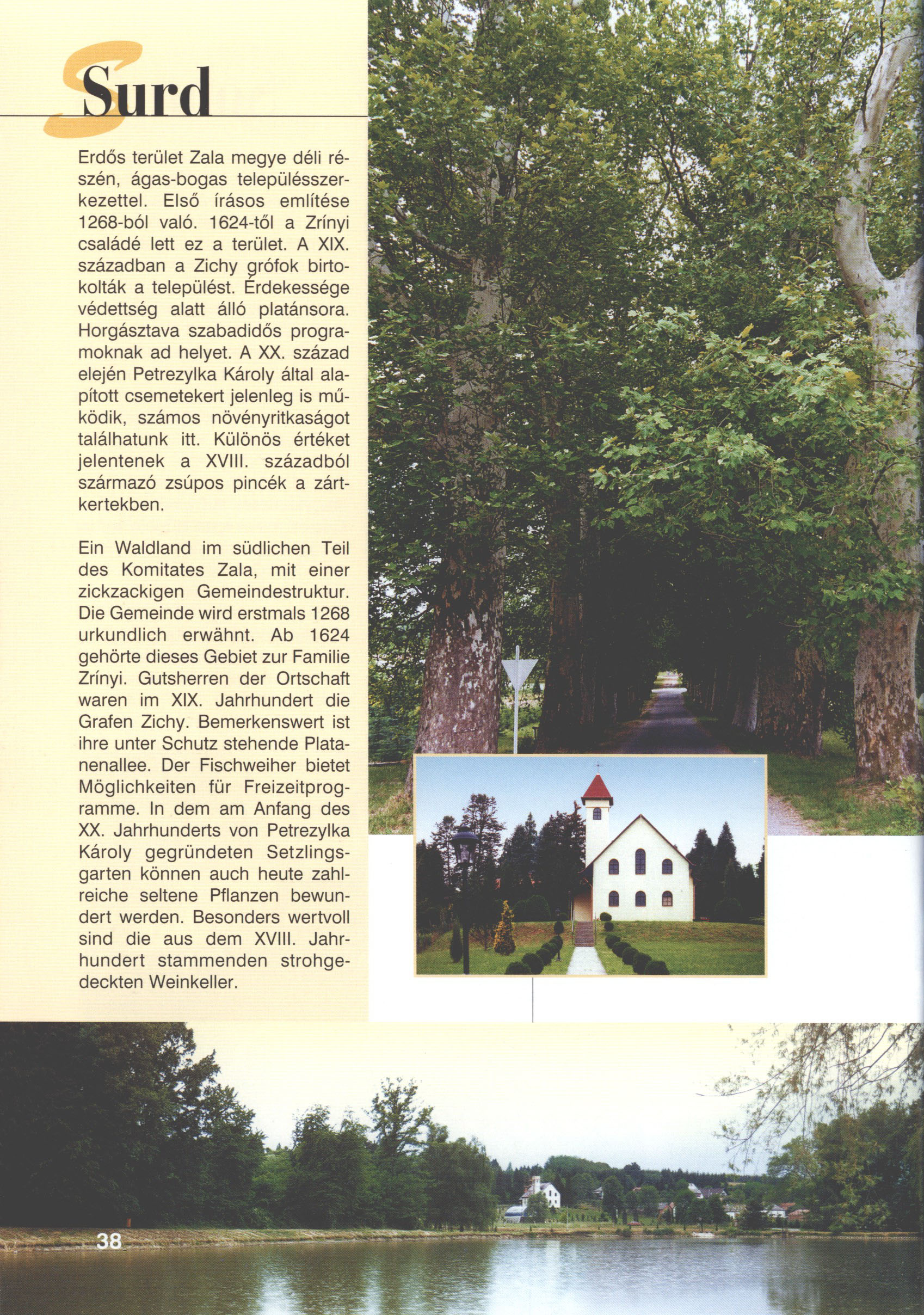 Nyilvános 2616 | 8021 | Surd | Ein Waldland im südlichen Teil des Komitates Zala, mit einer zickzackigen Gemeindestruktur. Die Gemeinde wird erstmals 1268 urkundlich erwähnt. Ab 1624 gehörte dieses Gebiet zur Familie Zrínyi. Gutsherren der Ortschaft waren im XIX. Jahrhundert die Grafen Zichy. Bemerkenswert ist ihre unter Schutz stehende Platanenallee. Der Fischweiher bietet Möglichkeiten für Freizeitprogramme. In dem am Anfang des XX. Jahrhunderts von Petrezylka Károly gegründeten Setzlingsgarten können auch heute zahlreiche seltene Pflanzen bewundert werden. Besonders wertvoll sind die aus dem XVIII. Jahrhundert stammenden strohgedeckten Weinkeller. Dieses Text stammt von: Titel: Hívogató a Régiók Kapujában - Útikönyv Látnivalók Nagykanizsán és Térségében (Einladend in dem Tor des Gebiets - Reisebuch - Sehenswürdigkeiten in Nagykanizsa und Umgebung) Herausgegeben von: Nagykanizsa és a Környező Települések Területfejlesztési Társulása (Verein für Gebietsentwicklung in Nagykanizsa und in ihrer Umgebung) 8800 Nagykanizsa, Petőfi Sándor út 5. Tel.: 06 93/536-453 • 06 93/536-454 Tel ./Fax: 06 93/326-323 E-mail: terstars@axelero.hu www.kanizsaterseg.celodin.hu |