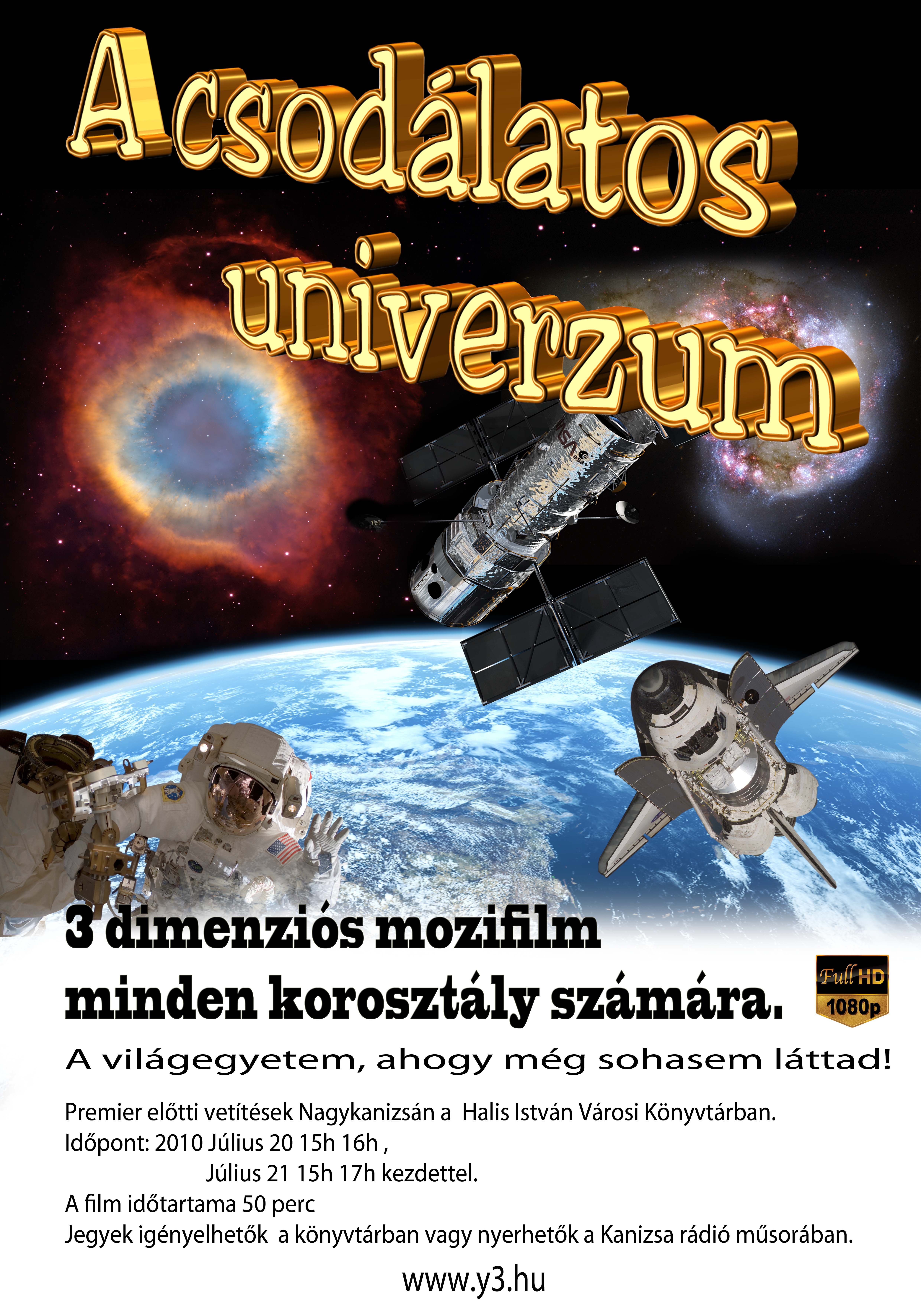 Nyilvános 1475 | 3895 | A csodálatos univerzum | 3 dimenziós mozifilm minden korosztály számára. A világegyetem, ahogy még sohasem láttad! Premier előtti 3D vetítések Nagykanizsán a Halis István Városi Könyvtárban. Időpont: 2010. július 20. 15h 16h, július 21. 15h 17h kezdettel. A film időtartama 50 perc. Jegyek igényelhetők a könyvtárban vagy nyerhetők a Kanizsa rádió műsorában. www.y3.hu Full HD 1080p |