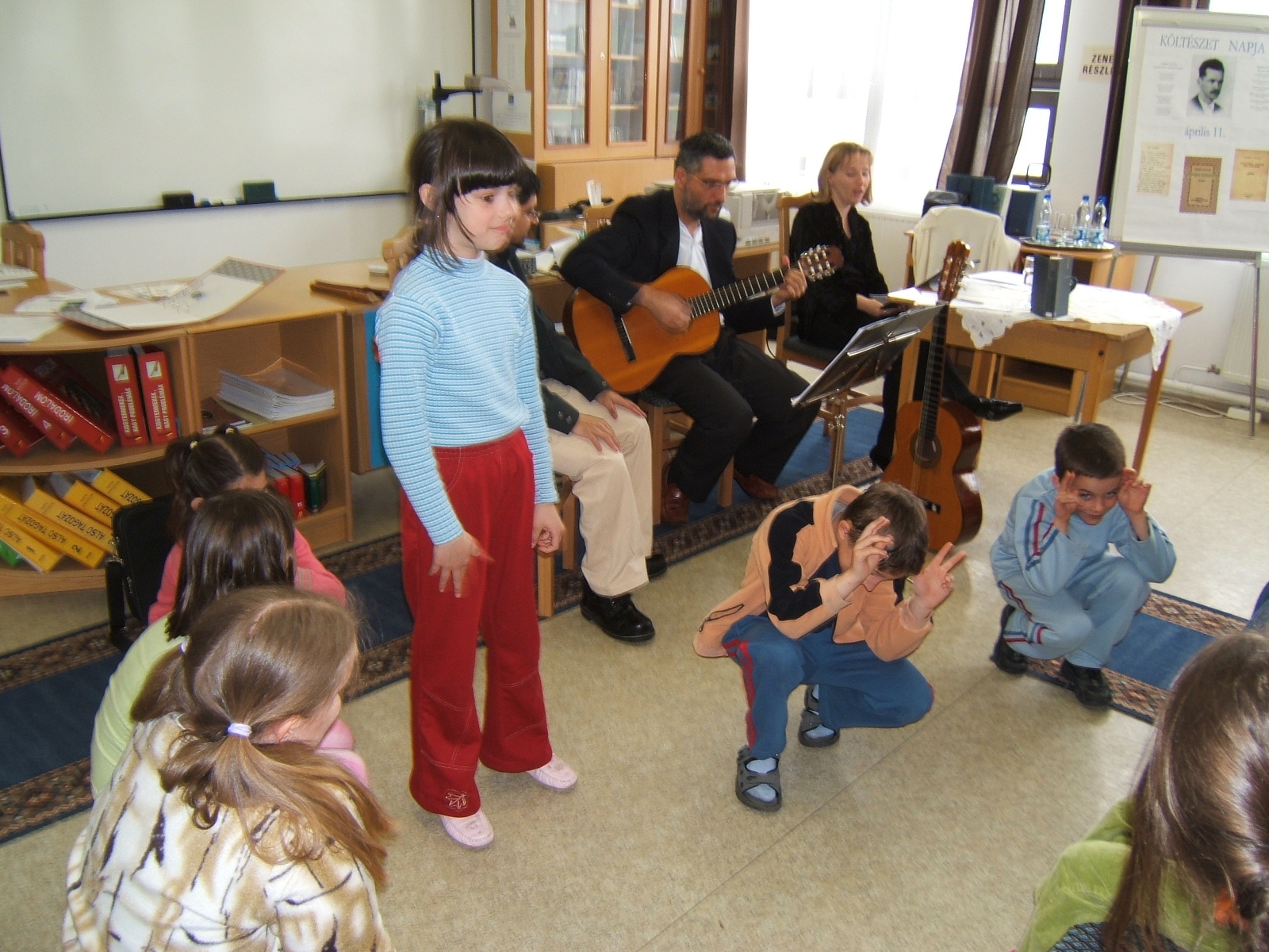 Nyilvános 1180 | 3138 | Költészet napja műsor a zalakarosi könyvtárban 2006. április 11-én. Vendégünk volt a Kardos Banda együttes, aki a kisiskolásoknak és a nagyoknak külön összeálított \"Költészet - minden formában régiektől, maiaktól\" című műsorát adta elő. | |