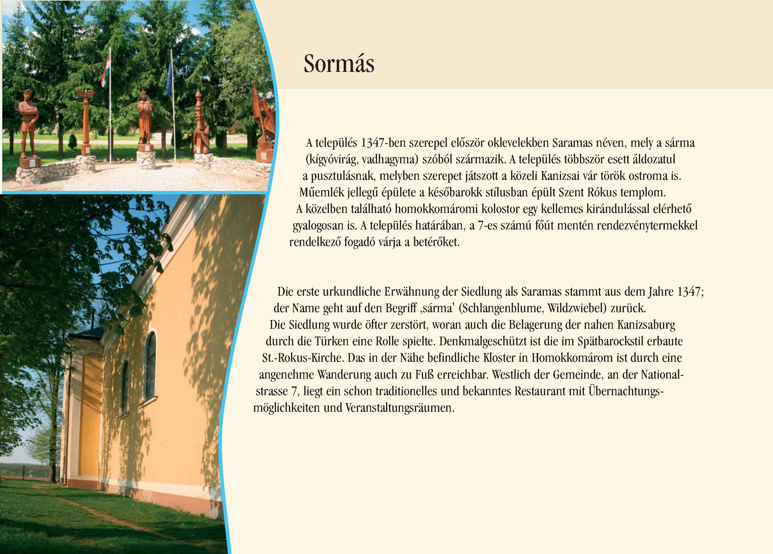 Nyilvános 2431 | 8470 | Sormás | Die erste urkundliche Erwähnung der Siedlung als Saramas stammt aus dem Jahre 1347; der Name geht auf den Begriff ,sárma\' (Schlangenblume, Wildzwiebel) zurück. Die Siedlung wurde öfter zerstört, woran auch die Belagerung der nahen Kanizsaburg durch die Türken eine Rolle spielte. Denkmalgeschützt ist die im Spätbarockstil erbaute St.-Rokus-Kirche. Das in der Nähe befindliche Kloster in Homokkomárom ist durch eine angenehme Wanderung auch zu Fuß erreichbar. Westlich der Gemeinde, an der Nationalstrasse 7, liegt ein schon traditionelles und bekanntes Restaurant mit Übernachtungsmöglichkeiten und Veranstaltungsräumen Dieses Text stammt von: Pannonhát tájpark prospektus 2006. Web: http://www.pannonhat.hu/ (auch in Deutsch |