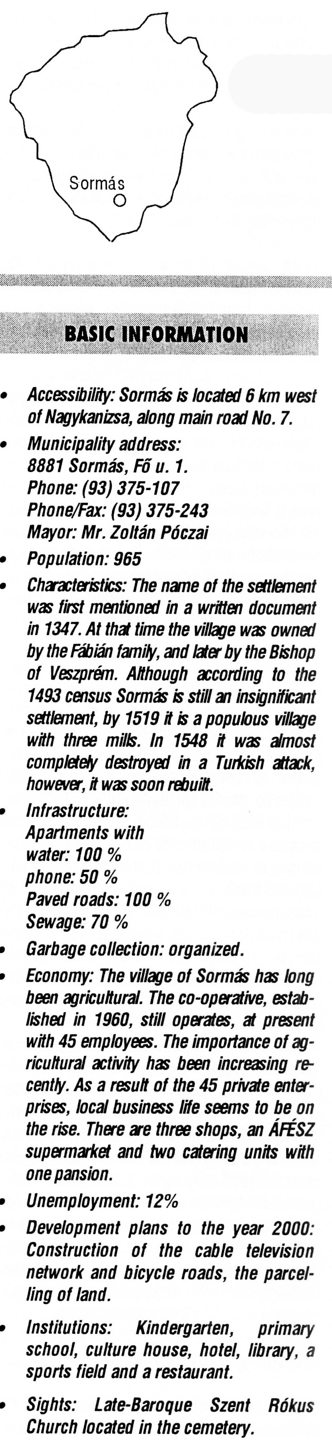 Nyilvános 2222 | 7901 | Sormás | BASIC INFORMATION Accessibility: Sormás is located 6 km west of Nagykanizsa, along main road No. 7. Municipality address: 8881 Sormás, Fő u. 1. Phone: (93) 375-107 Phone/Fax: (93) 375-243 Mayor: Mr. Zoltán Póczai Population: 965 Characteristics: The name of the settlement was first mentioned in a written document in 1347. At that time the village was owned by the Fábián family, and later by the Bishop of Veszprém. Although according to the 1493 census Sormás is still an insignificant settlement, by 1519 it is a populous village with three mills. In 1548 it was almost completely destroyed in a Turkish attack, however, it was soon rebuilt. Infrastructure: Apartments with water: 100 % phone: 50 % Paved roads: 100 % Sewage: 70 % Garbage collection: organized. Economy: The village of Sormás has long been agricultural. The co-operative, established in 1960, still operates, at present with 45 employees. The importance of agricultural activity has been increasing recently. As a result of the 45 private enterprises, local business life seems to be on the rise. There are three shops, an ÁFÉSZ supermarket and two catering units with one pansion. Unemployment: 12% Development plans to the year 2000: Construction of the cable television network and bicycle roads, the parcelling of land. Institutions: Kindergarten, primary school, culture house, hotel, library, a sports field and a restaurant. Sights: Late-Baroque Szent Rókus Church located in the cemetery. This text came from the following book: Title: Handbook of Zala county (Zala megye kézikönyve) Series: County handbooks of Hungary (Magyarország megyei kézikönyvei) Chief editor: Hóbor József Publisher: (Hatvan), CEBA-Hungary Ltd, 1998 ETO: 908.439.121(035) ; 050.8(439.121) ISBN: 963-9089-18-2 Pages: 488-1040 p. Remark: Closed on: 1998. márc. 31. |