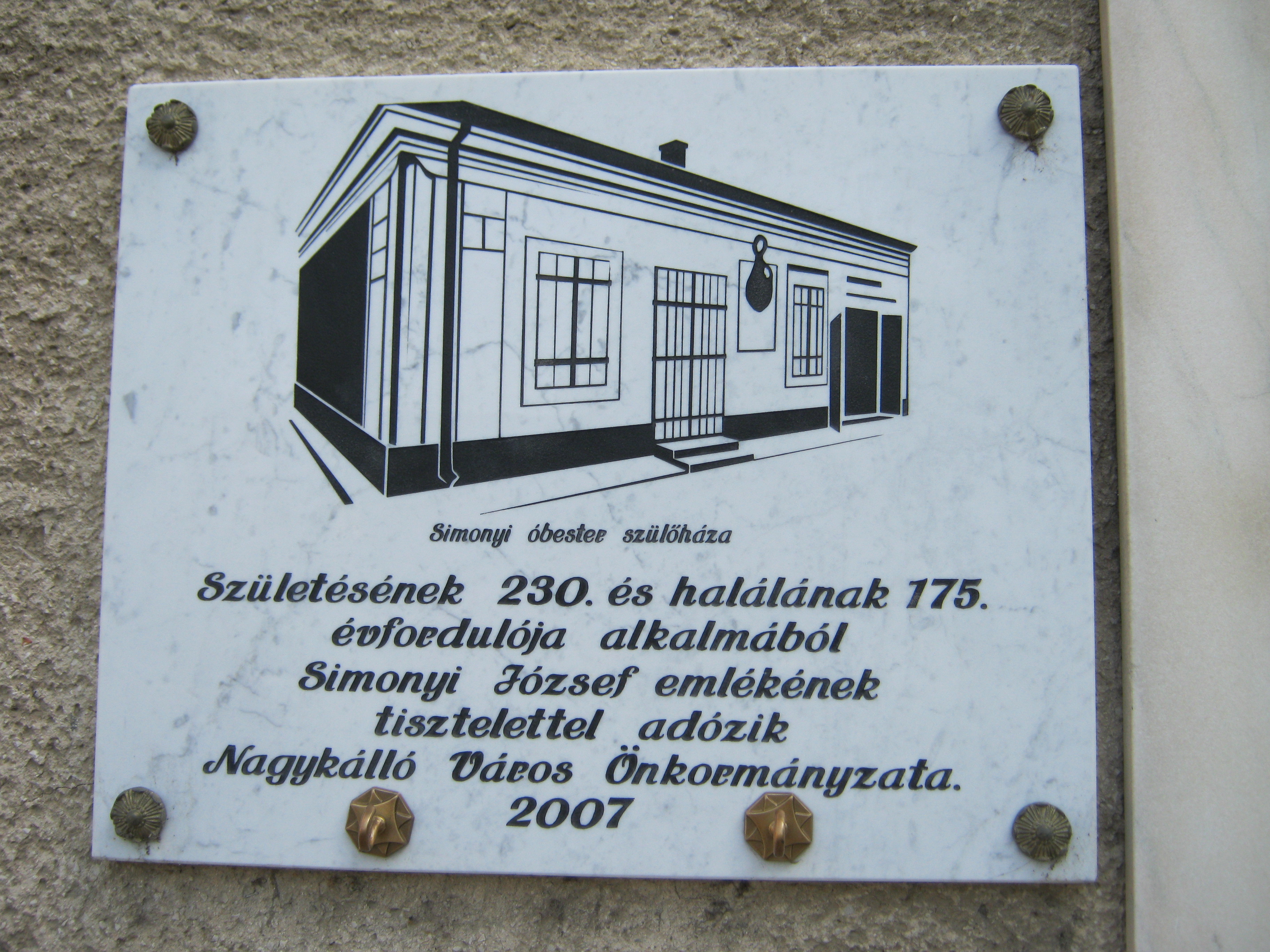 Nyilvános 1550 | 3242 | Nagykálló, Bátori út 2. | Egykor ezen a helyen állott a legendás Simonyi óbester szülőháza. Barbácsi és vitézvári báró Simonyi József (1771. március 18. – 1832. augusztus 23.), legendás hírű huszártiszt volt, kortársai "a legvitézebb huszár" kitüntető címmel illették. A panelházon szerencsére legalább látható az eredeti épületen 1932-ben elhelyezett emléktábla, egy új márványtáblán pedig megörökítették a szülőház képét. A fénykép 2010 augusztus elején készült. |