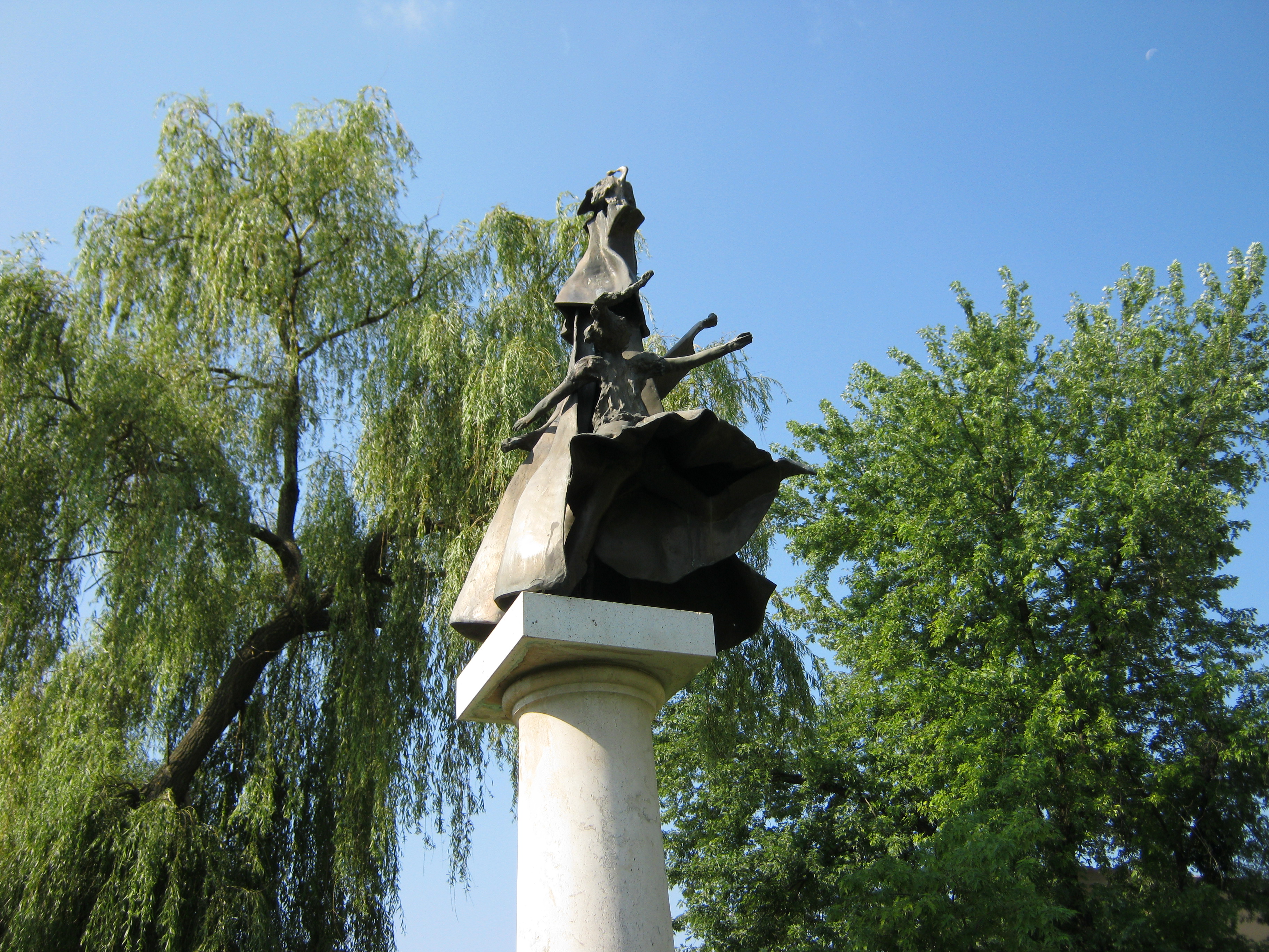 Nyilvános 755 | 1198 | Nagykálló, Szabadság tér: A "Kállai kettős" emlékmű | A művelődési ház előtt 1994-ben állították fel Borbás Tibor: Kállai kettős című szoborkompozícióját. A helyi dalos és táncos hagyományon alapuló ún. „kállai kettős”-t Kodály Zoltán tette világhírűvé, aki a helyszínen (lásd: Nagykálló, Nagybalkányi út 1.) 1926-ban megismert táncot 1950-ben öntötte műzenei formába a Magyar Állami Népi Együttes számára. A zeneszerző emléktábláját a művelődési ház belső terében helyezték el. A híres tánc hagyománya máig él a településen. Ébrentartói a Kállai Kettős Néptáncklub, a Kállai Lakodalmas Hagyományőrző Csoport és a Kiskállai Ifjúsági Néptáncegyüttes. A művelődési ház a házigazdája a kétévente ősszel megrendezésre kerülő Kállai Kettős Néptáncfesztiválnak. Felh. irod.: Harsányi Gézáné: Kálló kincsei. Nagykálló, 2007 www.nagykallo.net A fénykép 2010 augusztus elején készült. |