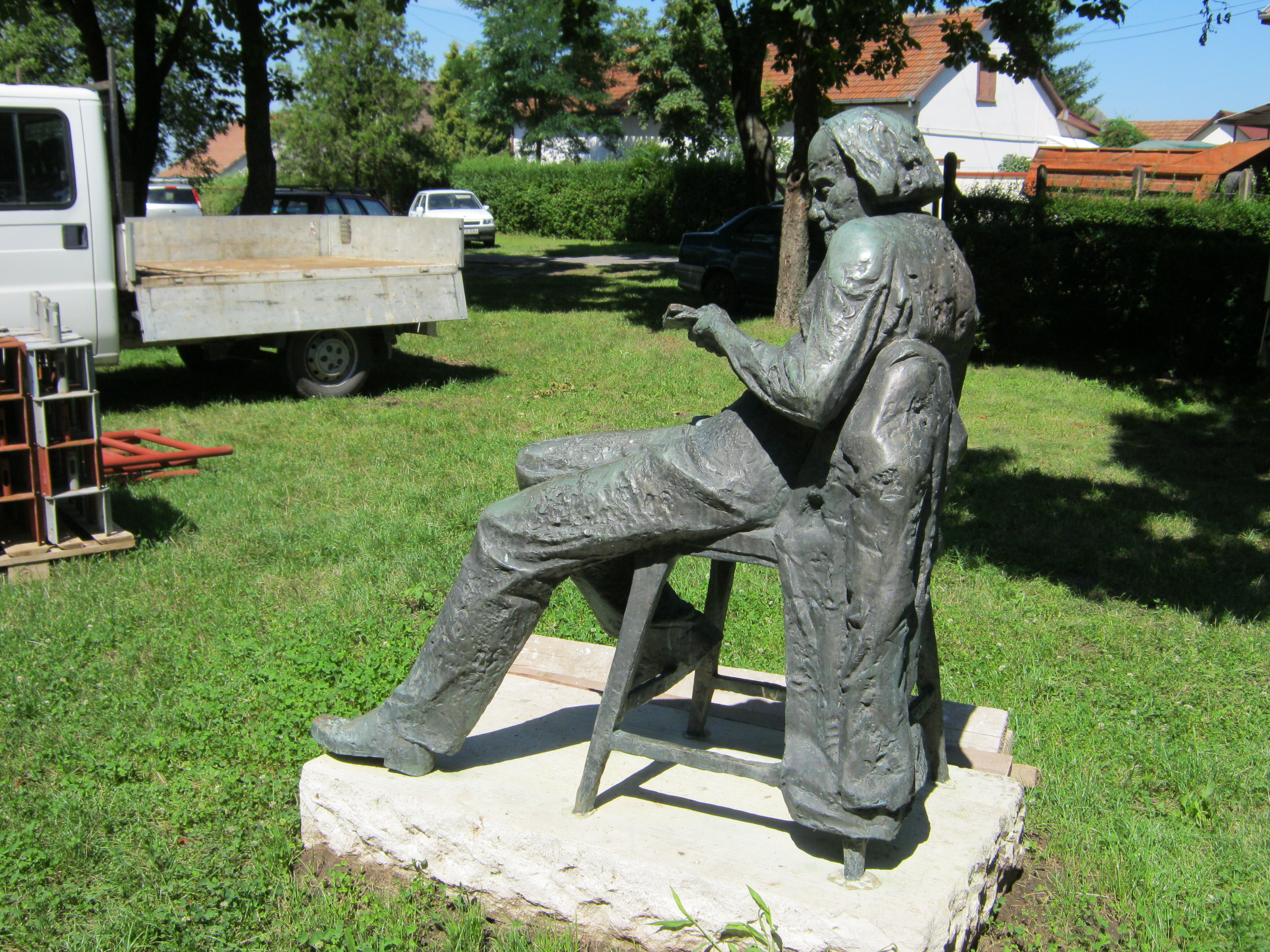 Nyilvános 1031 | 1431 | Nyírbátor, Báthori utca 24. mögött: Kodály Zoltán | A református templom háta mögött két zeneszerző szobra látható. Kodály Zoltán egészalakos ülő szobrát, Kirchmayer Károly alkotását 1983-ban állították fel. Nem találtam erre vonatkozó információt, de a szobornak valószínűleg köze van a Nyírbátori Zenei Napokhoz. A református templomban, mint ideális helyszínen többször felhangzott Kodály Psalmus Hungaricusa. Az egyik előadást - Simándy József tenorszólójával - televíziós felvétel is megörökítette. Felh. irod.: www.szoborlap.hu A fénykép 2010 augusztus elején, amint látható is, a templom helyreállítási munkálatai idején készült. |