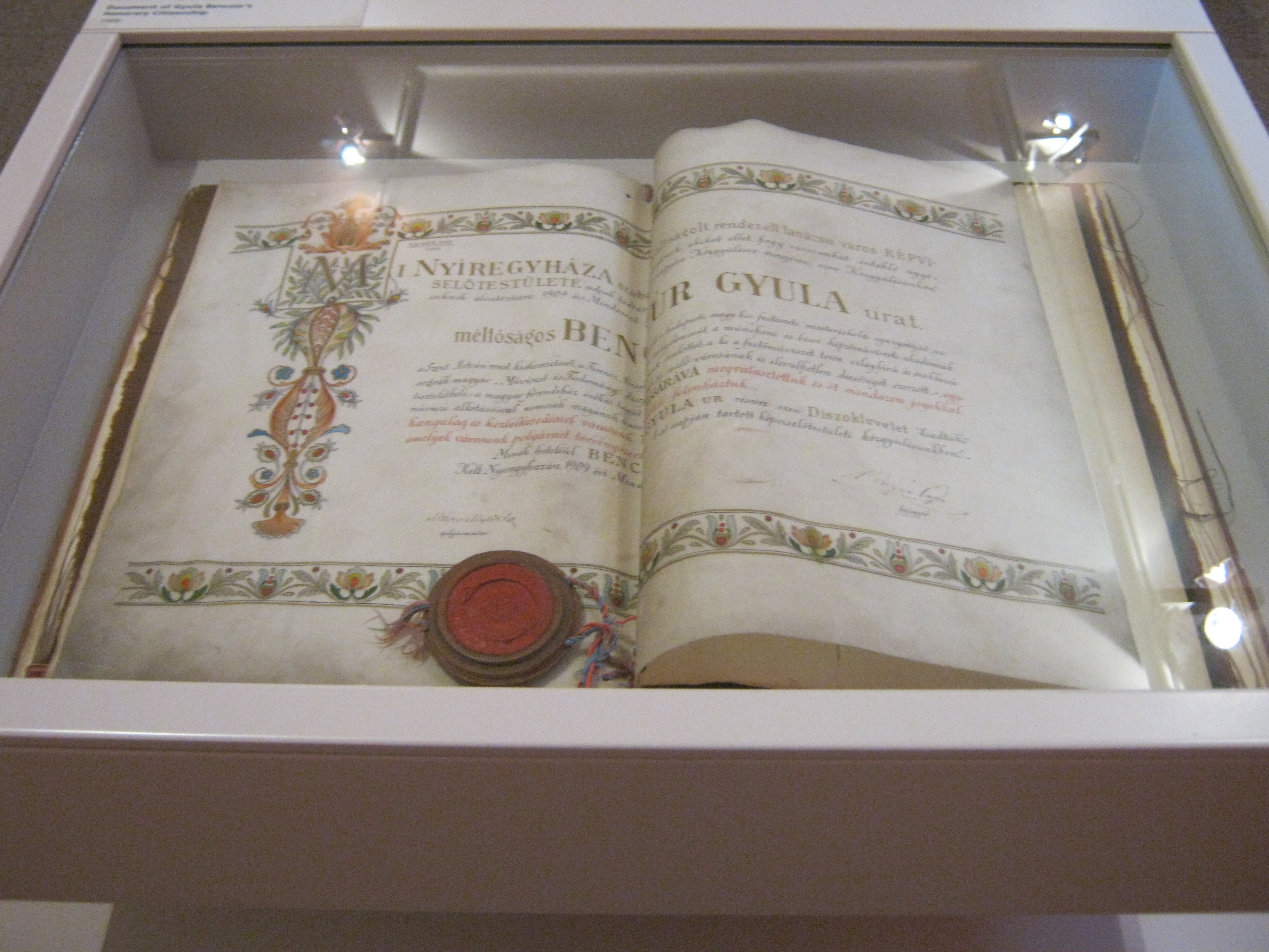 Nyilvános 1153 | 1670 | Nyíregyháza, Benczúr tér 21. Jósa András Múzeum | Magyarország egyik legrégibb múzeumát Dr. Jósa András alapította 1868-ban, akinek ma nevét viseli. A képen Benczúr Gyula emlékszobájának részlete. A nagy magyar festőművész 1844-ben Nyíregyházán született (lásd: Nyíregyháza, Kossuth tér 8.), apja gyógyszerész volt. A Benczúr-emlékszobában alkotásai mellett eredeti bútorok, s a festőművész több használati tárgya is megtekinthető. A képen Benczúr 1909-ből származó díszpolgári oklevele. Felh. irod.: Látnivalók Szabolcs-Szatmár-Bereg megyében. Miskolc, Well-PRess, 1999 http://jam.nyirbone.hu A fénykép 2010 augusztus elején készült. |