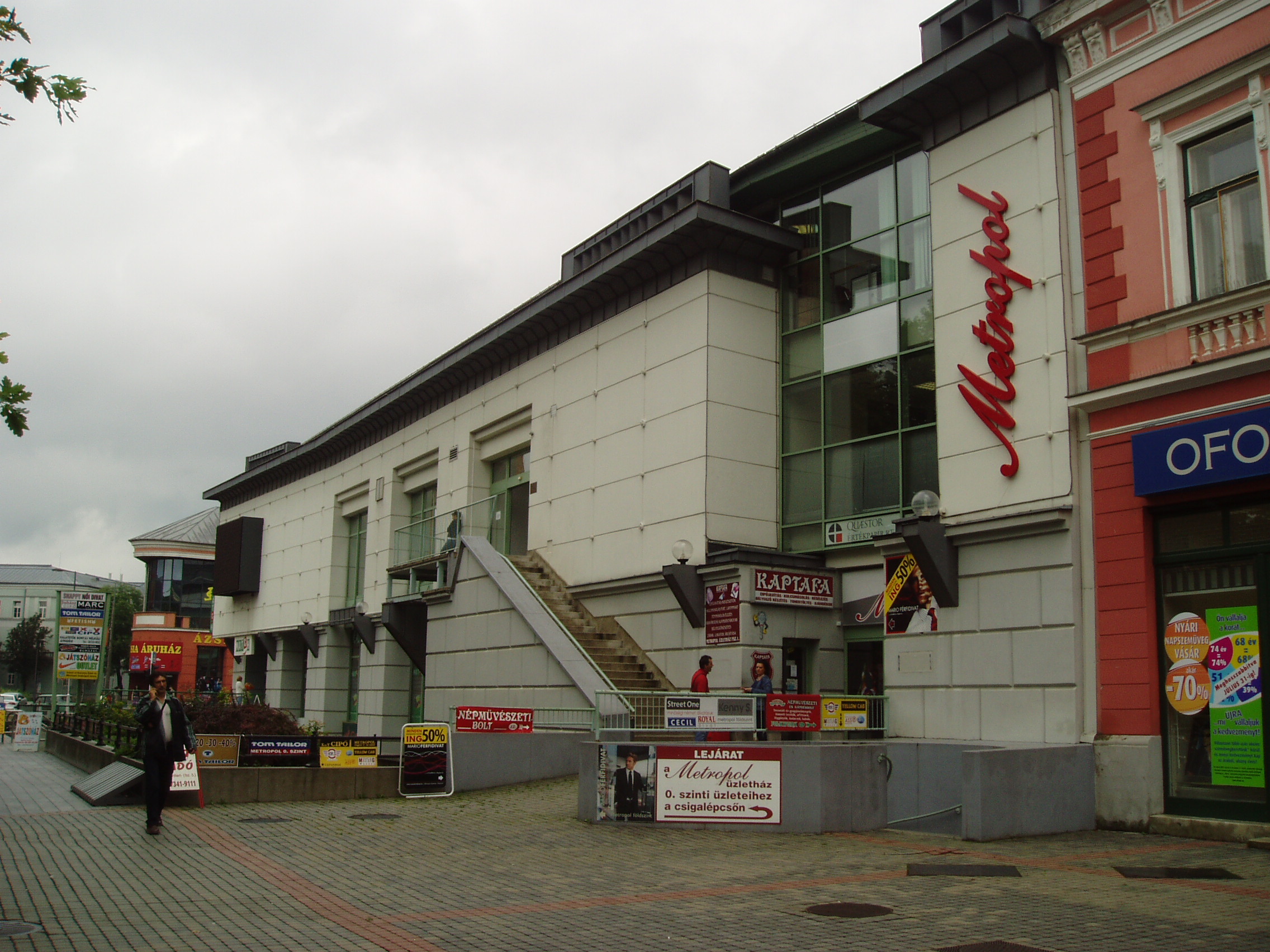 Nyilvános 998 | 3543 | Nyíregyháza, Kossuth tér 8. | A Kossuth tér déli részét ma a modern Metropol üzletház uralja. Valaha itt állt az 1793-ban felépült városháza, amelyben - a napóleoni hadak elől menekülve - 1809-ben megszállt Ferenc császár felesége a trónörökössel, a leendő V. Ferdinánddal, s állítólag magával hurcolta a koronát is. Később itt működött Benczúr gyógyszerész "Magyar Korona" nevű gyógyszertára, s ebben az épületben született 1844-ben fia, Benczúr Gyula festőművész. Felh. irod.: Látnivalók Szabolcs-Szatmár-Bereg megyében. Miskolc, Well-PRess, 1999 A fénykép 2010 augusztus elején készült. |