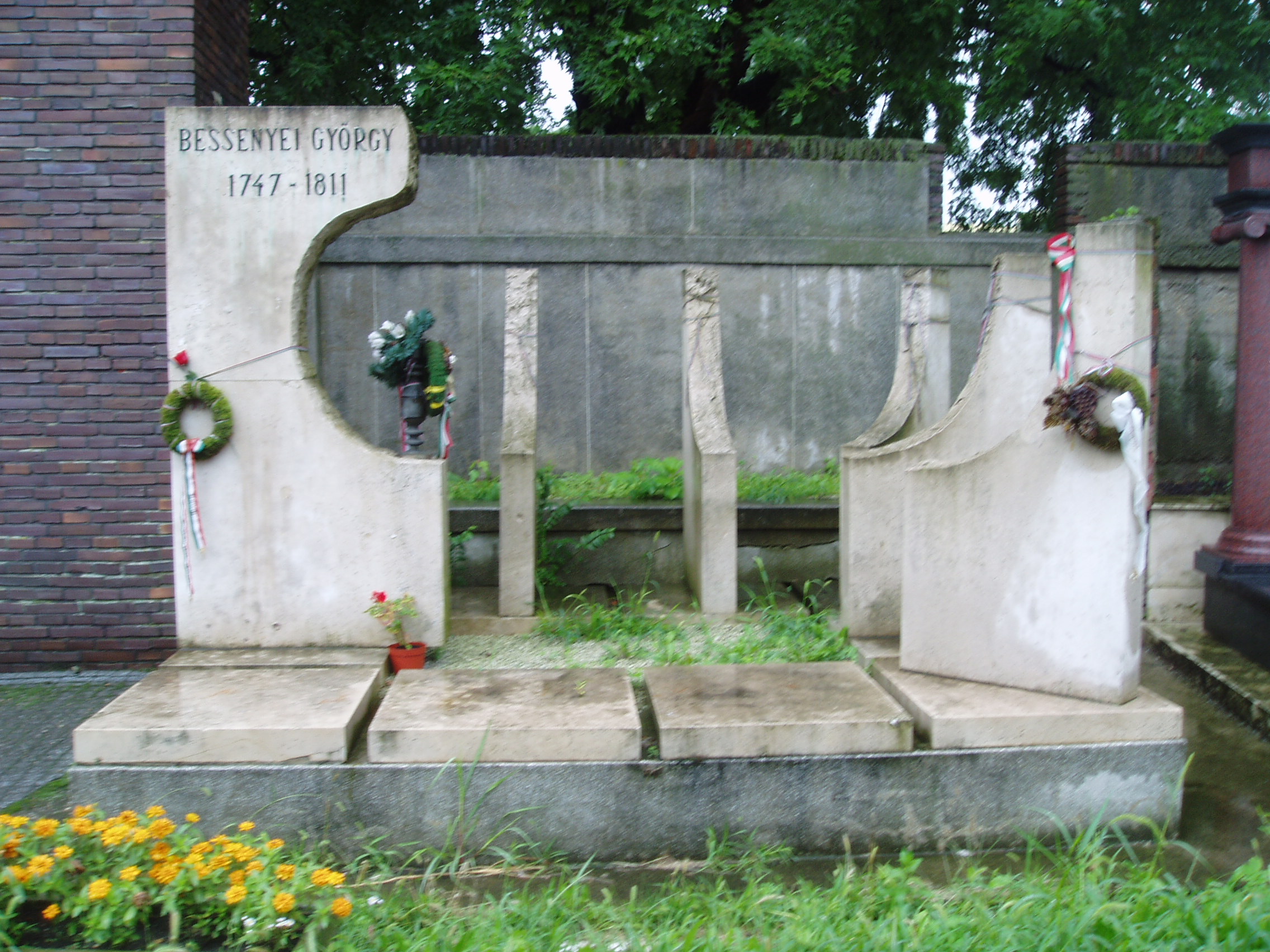 Nyilvános 1021 | 1801 | Nyíregyháza, Pazonyi tér, Északi temető: Bessenyei György sírja | A Dózsa György út vezet Nyíregyháza Északi temetőjébe. A főbejárat közvetlen közelében nyugszik a magyar irodalomtörténet egyik nagy alakja, Bessenyei György (1746/7-1811). Birtokán, Pusztakovácsiban hunyt el, kúriájának kertjében temették el. Hamvait 1940-ben szállították Nyíregyházára. Síremlékét süttői márványból 1982-ben készítette Ráthonyi József. Felh. irod.: Fazekas Árpád - Szekrényes András: Nyíregyháza temetői. Nyíregyháza, 1990 A fénykép 2010 augusztus elején készült |