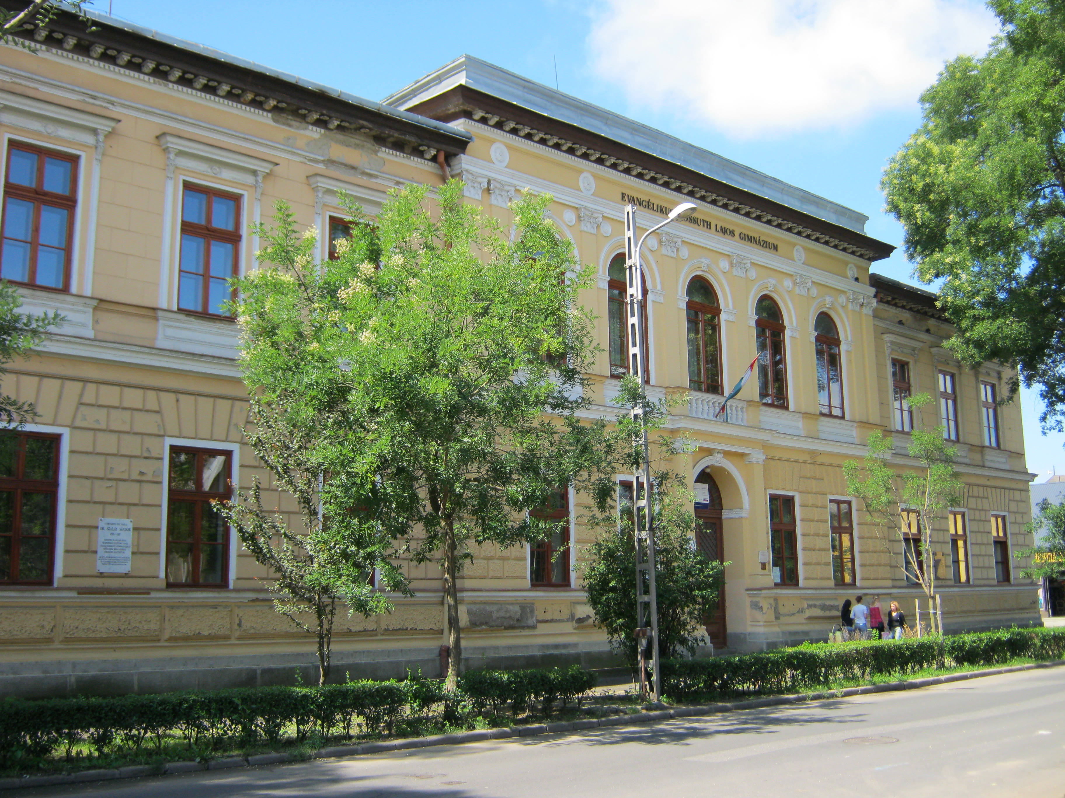 Nyilvános 947 | 1336 | Nyíregyháza, Szent István utca 19. Evangélikus Kossuth Lajos Gimnázium | A megye legrégibb középiskolája. 1808-ban alapították mint evangélikus professzori iskolát (lásd: Nyíregyháza, Luther utca 5.). Nyolc osztályos gimnáziummá 1888-ra fejlesztették fel. Mai épületét ekkoriban, 1887-ben emelték Bobula János tervei szerint. Kossuth Lajos nevét 1921-ben vette fel. Az 1948-ban államosított iskolát 1992-ben kapta vissza az evangélikus egyház. Homlokzatán számos márványtábla emlékezik kiváló diákjaira, tanáraira. Felh. irod.: www.eklg.hu A fénykép 2010 augusztus elején készült |