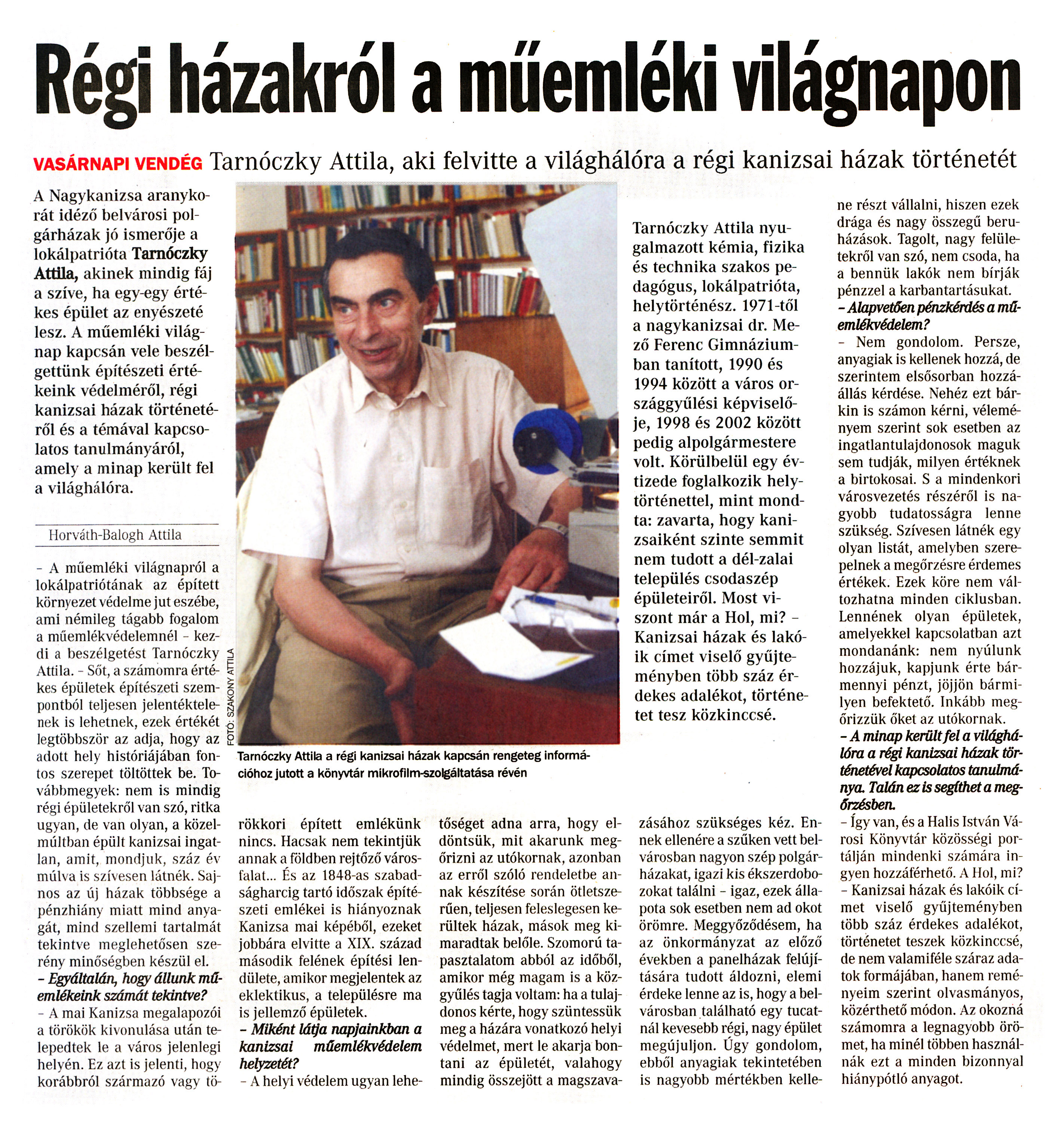 Nyilvános 1315 | 2843 | Vasárnapi Zalai Hírlap 2009. április 19. 15. szám 3. oldal | Régi házakról a műemléki világnapon A cikk szövege: Régi házakról a műemléki világnapon vasárnapi vendég Tarnóczky Attila, aki felvitte a világhálóra a régi kanizsai házak történetét Tarnóczky Attila a régi kanizsai házak kapcsán rengeteg információhoz jutott a könyvtár mikrofilm-szolgáltatása révén Tarnóczky Attila nyugalmazott kémia, fizika és technika szakos pedagógus, lokálpatrióta, helytörténész. 1971-től a nagykanizsai dr. Mező Ferenc Gimnáziumban tanított, 1990 és 1994 között a város országgyűlési képviselője, 1998 és 2002 között pedig alpolgármestere volt. Körülbelül egy évtizede foglalkozik helytörténettel, mint mondta: zavarta, hogy kanizsaiként szinte semmit nem tudott a dél-zalai település csodaszép épületeiről. Most viszont már a Hol, mi? -Kanizsai házak és lakóik címet viselő gyűjteményben több száz érdekes adalékot, történetet tesz közkinccsé. A Nagykanizsa aranykorát idéző belvárosi polgárházak jó ismerője a lokálpatrióta Tarnóczky Attila, akinek mindig fáj a szíve, ha egy-egy értékes épület az enyészeté lesz. A műemléki világnap kapcsán vele beszélgettünk építészeti értékeink védelméről, régi kanizsai házak történetéről és a témával kapcsolatos tanulmányáról, amely a minap került fel a világhálóra. Horváth-Balogh Attila - A műemléki világnapról a lokálpatriótának az épített környezet védelme jut eszébe, ami némileg tágabb fogalom a műemlékvédelemnél - kezdi a beszélgetést Tarnóczky Attila. - Sőt, a számomra értékes épületek építészeti szempontból teljesen jelentéktelenek is lehetnek, ezek értékét legtöbbször az adja, hogy az adott hely históriájában fontos szerepet töltöttek be. Továbbmegyek: nem is mindig régi épületekről van szó, ritka ugyan, de van olyan, a közelmúltban épült kanizsai ingatlan, amit, mondjuk, száz év múlva is szívesen látnék. Sajnos az új házak többsége a pénzhiány miatt mind anyagát, mind szellemi tartalmát tekintve meglehetősen szerény minőségben készül el. - Egyáltalán, hogy állunk műemlékeink számát tekintve? - A mai Kanizsa megalapozói a törökök kivonulása után telepedtek le a város jelenlegi helyén. Ez azt is jelenti, hogy korábbról származó vagy törökkori épített emlékünk nincs. Hacsak nem tekintjük annak a földben rejtőző városfalat... És az 1848-as szabadságharcig tartó időszak építészeti emlékei is hiányoznak Kanizsa mai képéből, ezeket jobbára elvitte a XIX. század második felének építési lendülete, amikor megjelentek az eklektikus, a településre ma is jellemző épületek. - Miként látja napjainkban a kanizsai műemlékvédelem helyzetét? - A helyi védelem ugyan lehe- tőséget adna arra, hogy eldöntsük, mit akarunk megőrizni az utókornak, azonban az erről szóló rendeletbe annak készítése során ötletszerűen, teljesen feleslegesen kerültek házak, mások meg kimaradtak belőle. Szomorú tapasztalatom abból az időből, amikor még magam is a közgyűlés tagja voltam: ha a tulajdonos kérte, hogy szüntessük meg a házára vonatkozó helyi védelmet, mert le akarja bontani az épületét, valahogy mindig összejött a megszavazásához szükséges kéz. Ennek ellenére a szűken vett belvárosban nagyon szép polgárházakat, igazi kis ékszerdobozokat találni - igaz, ezek állapota sok esetben nem ad okot örömre. Meggyőződésem, ha az önkormányzat az előző években a panelházak felújítására tudott áldozni, elemi érdeke lenne az is, hogy a belvárosban található egy tucatnál kevesebb régi, nagy épület megújuljon. Úgy gondolom, ebből anyagiak tekintetében is nagyobb mértékben kellene részt vállalni, hiszen ezek drága és nagy összegű beruházások. Tagolt, nagy felületekről van szó, nem csoda, ha a bennük lakók nem bírják pénzzel a karbantartásukat. - Alapvetően pénzkérdés a műemlékvédelem? - Nem gondolom. Persze, anyagiak is kellenek hozzá, de szerintem elsősorban hozzáállás kérdése. Nehéz ezt bárkin is számon kérni, véleményem szerint sok esetben az ingatlantulajdonosok maguk sem tudják, milyen értéknek a birtokosai. S a mindenkori városvezetés részéről is nagyobb tudatosságra lenne szükség. Szívesen látnék egy olyan listát, amelyben szerepelnek a megőrzésre érdemes értékek. Ezek köre nem változhatna minden ciklusban. Lennének olyan épületek, amelyekkel kapcsolatban azt mondanánk: nem nyúlunk hozzájuk, kapjunk érte bármennyi pénzt, jöjjön bármilyen befektető. Inkább megőrizzük őket az utókornak. - A minap került fel a világhálóra a régi kanizsai házak történetével kapcsolatos tanulmánya. Talán ez is segíthet a megőrzésben. - Így van, és a Halis István Városi Könyvtár közösségi portálján mindenki számára ingyen hozzáférhető. A Hol, mi? - Kanizsai házak és lakóik címet viselő gyűjteményben több száz érdekes adalékot, történetet teszek közkinccsé, de nem valamiféle száraz adatok tormájában, hanem reményeim szerint olvasmányos, közérthető módon. Az okozná számomra a legnagyobb örömet, ha minél többen használnák ezt a minden bizonnyal hiánypótló anyagot. |