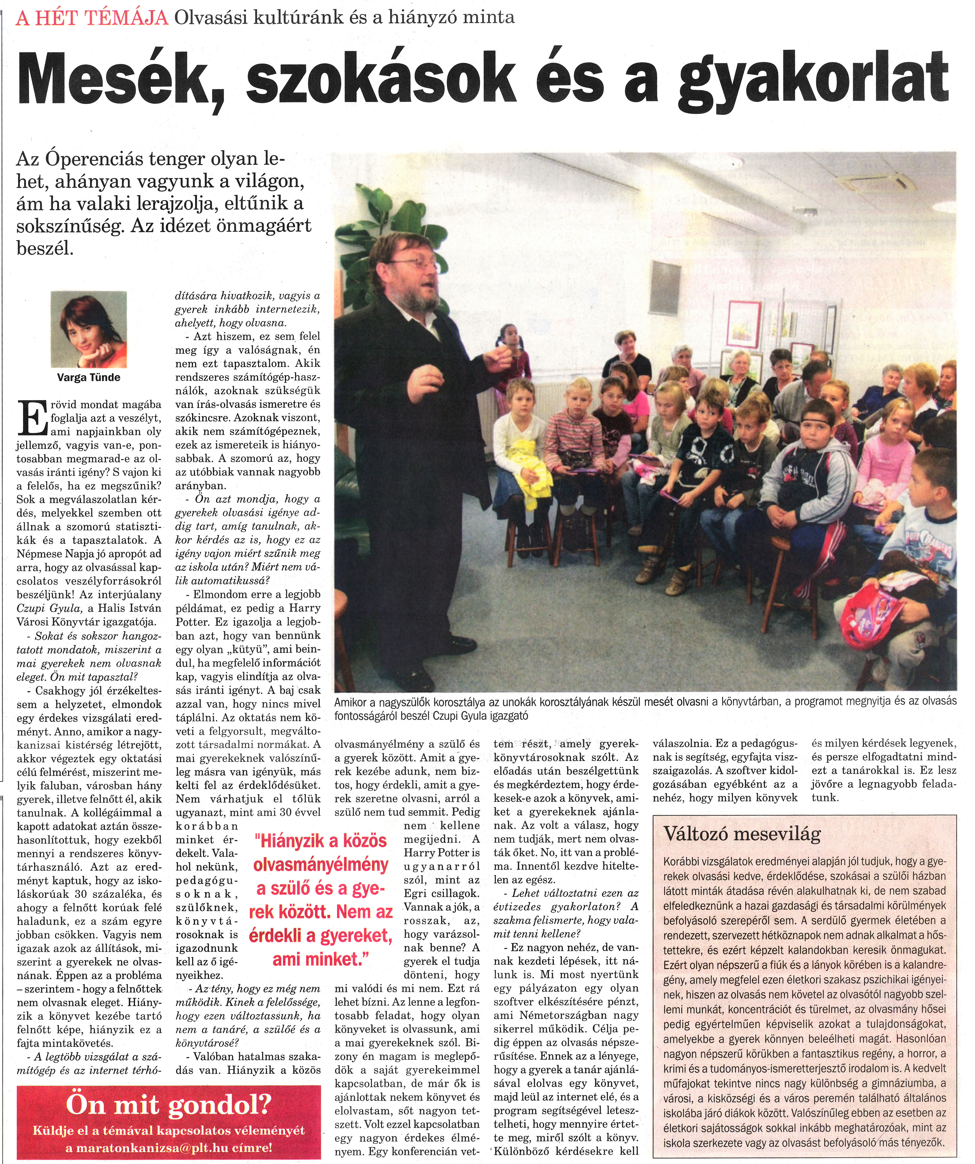 Nyilvános 961 | 1421 | Nagykanizsai Maraton 2009. október 2. 39. szám 3. oldal - Mesék, szokások és a gyakorlat - A hét témája: olvasási kultúránk és a hiányzó minta | A cikk szövege: A HÉT TÉMÁJA Olvasási kultúránk és a hiányzó minta Mesék, szokások és a gyakorlat "Hiányzik a közös olvasmányélmény a szülő és a gyerek között. Nem az érdekli a gyereket, ami minket." Varga Tünde Az Óperenciás tenger olyan lehet, ahányan vagyunk a világon, ám ha valaki lerajzolja, eltűnik a sokszínűség. Az idézet önmagáért beszél. E rövid mondat magába foglalja azt a veszélyt, ami napjainkban oly jellemző, vagyis van-e, pontosabban megmarad-e az olvasás iránti igény? S vajon ki a felelős, ha ez megszűnik? Sok a megválaszolatlan kérdés, melyekkel szemben ott állnak a szomorú statisztikák és a tapasztalatok. A Népmese Napja jó apropót ad arra, hogy az olvasással kapcsolatos veszélyforrásokról beszéljünk! Az interjúalany Czupi Gyula, a Halis István Városi Könyvtár igazgatója. - Sokat és sokszor hangoztatott mondatok, miszerint a mai gyerekek nem olvasnak eleget. Ön mit tapasztal? - Csakhogy jól érzékeltessem a helyzetet, elmondok egy érdekes vizsgálati eredményt. Anno, amikor a nagykanizsai kistérség létrejött, akkor végeztek egy oktatási célú felmérést, miszerint melyik faluban, városban hány gyerek, illetve felnőtt él, akik tanulnak. A kollégáimmal a kapott adatokat aztán összehasonlítottuk, hogy ezekből mennyi a rendszeres könyvtárhasználó. Azt az eredményt kaptuk, hogy az iskoláskorúak 30 százaléka, és ahogy a felnőtt korúak felé haladunk, ez a szám egyre jobban csökken. Vagyis nem igazak azok az állítások, miszerint a gyerekek ne olvasnának. Éppen az a probléma - szerintem - hogy a felnőttek nem olvasnak eleget. Hiányzik a könyvet kezébe tartó felnőtt képe, hiányzik ez a fajta mintakövetés. - A legtöbb vizsgálat a számítógép és az internet térhódítására hivatkozik, vagyis a gyerek inkább internetezik, ahelyett, hogy olvasna. - Azt hiszem, ez sem felel meg így a valóságnak, én nem ezt tapasztalom. Akik rendszeres számítógép-használók, azoknak szükségük van írás-olvasás ismeretre és szókincsre. Azoknak viszont, akik nem számítógépeznek, ezek az ismereteik is hiányosabbak. A szomorú az, hogy az utóbbiak vannak nagyobb arányban. - Ön azt mondja, hogy a gyerekek olvasási igénye addig tart, amíg tanulnak, akkor kérdés az is, hogy ez az igény vajon miért szűnik meg az iskola után? Miért nem válik automatikussá? - Elmondom erre a legjobb példámat, ez pedig a Harry Potter. Ez igazolja a legjobban azt, hogy van bennünk egy olyan „kütyü”, ami beindul, ha megfelelő információt kap, vagyis elindítja az olvasás iránti igényt. A baj csak azzal van, hogy nincs mivel táplálni. Az oktatás nem követi a felgyorsult, megváltozott társadalmi normákat. A mai gyerekeknek valószínűleg másra van igényük, más kelti fel az érdeklődésüket. Nem várhatjuk el tőlük ugyanazt, mint ami 30 évvel korábban minket érdekelt. Valahol nekünk, pedagógusoknak, szülőknek, könyvtárosoknak is igazodnunk kell az ő igényeikhez. - Az tény, hogy ez még nem működik. Kinek a felelőssége, hogy ezen változtassunk, ha nem a tanáré, a szülőé és a könyvtárosé? - Valóban hatalmas szakadás van. Hiányzik a közös olvasmányélmény a szülő és a gyerek között. Amit a gyerek kezébe adunk, nem biztos, hogy érdekli, amit a gyerek szeretne olvasni, arról a szülő nem tud semmit. Pedig nem kellene megijedni. A Harry Potter is ugyanarról szól, mint az Egri csillagok. Vannak a jók, a rosszak, az, hogy varázsolnak benne? A gyerek el tudja dönteni, hogy mi valódi és mi nem. Ezt rá lehet bízni. Az lenne a legfontosabb feladat, hogy olyan könyveket is olvassunk, ami a mai gyerekeknek szól. Bizony én magam is meglepődök a saját gyerekeimmel kapcsolatban, de már ők is ajánlottak nekem könyvet és elolvastam, sőt nagyon tetszett. Volt ezzel kapcsolatban egy nagyon érdekes élményem. Egy konferencián vettem részt, amely gyerekkönyvtárosoknak szólt. Az előadás után beszélgettünk és megkérdeztem, hogy érdekesek-e azok a könyvek, amiket a gyerekeknek ajánlanak. Az volt a válasz, hogy nem tudják, mert nem olvasták őket. No, itt van a probléma. Innentől kezdve hiteltelen az egész. - Lehet változtatni ezen az évtizedes gyakorlaton? A szakma felismerte, hogy valamit tenni kellene? - Ez nagyon nehéz, de vannak kezdeti lépések, itt nálunk is. Mi most nyertünk egy pályázaton egy olyan szoftver elkészítésére pénzt, ami Németországban nagy sikerrel működik. Célja pedig éppen az olvasás népszerűsítése. Ennek az a lényege, hogy a gyerek a tanár ajánlásával elolvas egy könyvet, majd leül az internet elé, és a program segítségével letesztelheti, hogy mennyire értette meg, miről szólt a könyv. Különböző kérdésekre kell válaszolnia. Ez a pedagógusnak is segítség, egyfajta visszaigazolás. A szoftver kidolgozásában egyébként az a nehéz, hogy milyen könyvek és milyen kérdések legyenek, és persze elfogadtatni mindezt a tanárokkal is. Ez lesz jövőre a legnagyobb feladatunk. Változó mesevilág Korábbi vizsgálatok eredményei alapján jól tudjuk, hogy a gyerekek olvasási kedve, érdeklődése, szokásai a szülői házban látott minták átadása révén alakulhatnak ki, de nem szabad elfeledkeznünk a hazai gazdasági és társadalmi körülmények befolyásoló szerepéről sem. A serdülő gyermek életében a rendezett, szervezett hétköznapok nem adnak alkalmat a hőstettekre, és ezért képzelt kalandokban keresik önmagukat. Ezért olyan népszerű a fiúk és a lányok körében is a kalandregény, amely megfelel ezen életkori szakasz pszichikai igényeinek, hiszen az olvasás nem követel az olvasótól nagyob