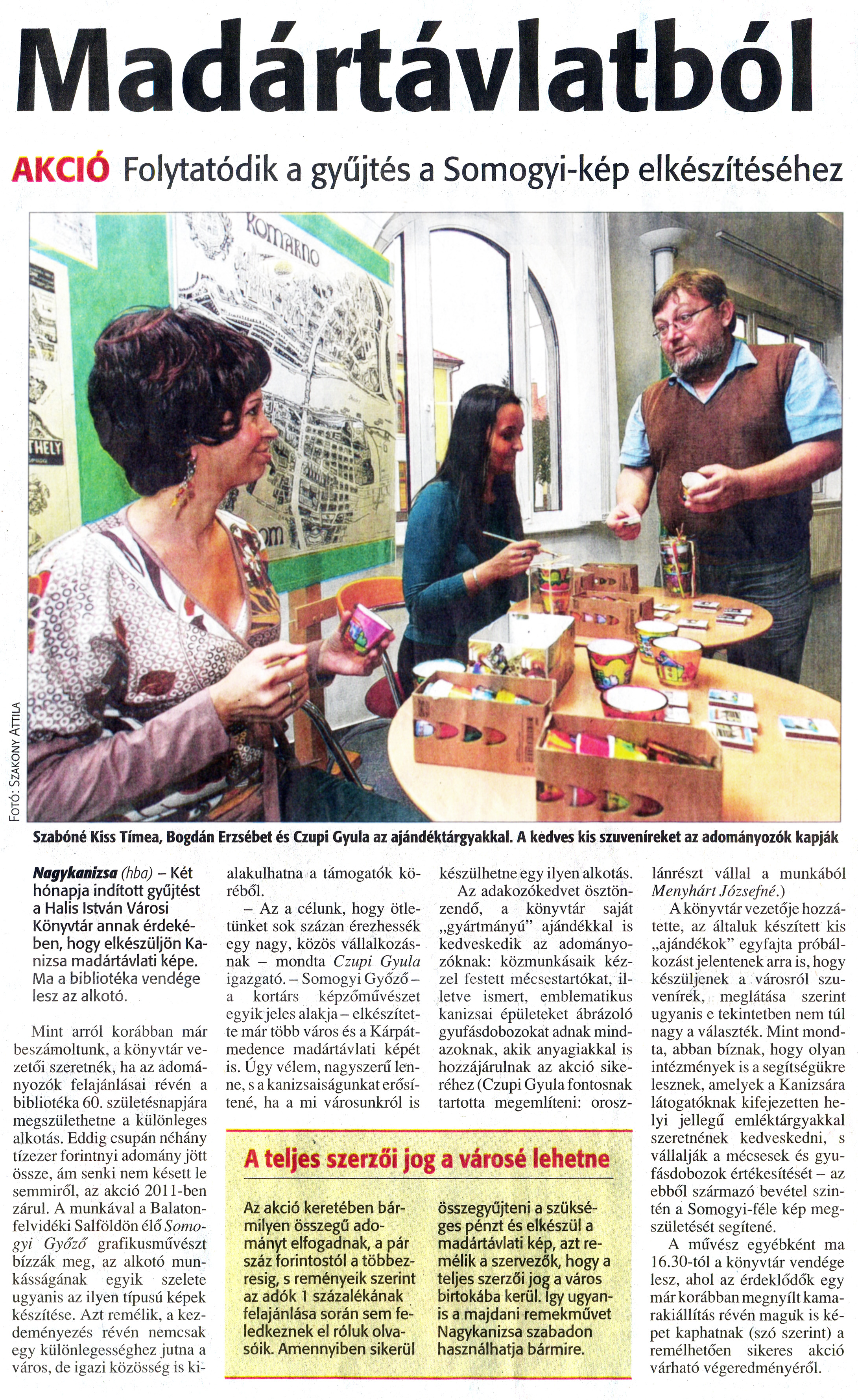 Nyilvános 1107 | 1404 | Zalai Hírlap 2009. november 17. 269. szám 11. oldal - Madártávlatból | A cikk szövege: Madártávlatból AKCIÓ Folytatódik a gyűjtés a Somogyi-kép elkészítéséhez Szabóné Kiss Tímea, Bogdán Erzsébet és Czupi Gyula az ajándéktárgyakkal. A kedves kis szuveníreket az adományozók kapják Nagykanizsa (hba) - Két hónapja indított gyűjtést a Halis István Városi Könyvtár annak érdekében, hogy elkészüljön Kanizsa madártávlati képe. Ma a bibliotéka vendége lesz az alkotó. Mint arról korábban már beszámoltunk, a könyvtár vezetői szeretnék, ha az adományozók felajánlásai révén a bibliotéka 60. születésnapjára megszülethetne a különleges alkotás. Eddig csupán néhány tízezer forintnyi adomány jött össze, ám senki nem késett le semmiről, az akció 2011-ben zárul. A munkával a Balatonfelvidéki Salföldön élő Somogyi Győző grafikusművészt bízzák meg, az alkotó munkásságának egyik szelete ugyanis az ilyen típusú képek készítése. Azt remélik, a kezdeményezés révén nemcsak egy különlegességhez jutna a város, de igazi közösség is kialakulhatna a támogatók köréből. - Az a célunk, hogy ötletünket sok százan érezhessék egy nagy, közös vállalkozásnak - mondta Czupi Gyula igazgató. - Somogyi Győző -a kortárs képzőművészet egyik jeles alakja - elkészítette már több város és a Kárpátmedence madártávlati képét is. Úgy vélem, nagyszerű lenne, s a kanizsaiságunkat erősítené, ha a mi városunkról is készülhetne egy ilyen alkotás. Az adakozókedvet ösztönzendő, a könyvtár saját „gyártmányú" ajándékkal is kedveskedik az adományozóknak: közmunkásaik kézzel festett mécsestartókat, illetve ismert, emblematikus kanizsai épületeket ábrázoló gyufásdobozokat adnak mindazoknak, akik anyagiakkal is hozzájárulnak az akció sikeréhez (Czupi Gyula fontosnak tartotta megemlíteni: oroszlánrészt vállal a munkából Menyhárt Józsefné!) A könyvtár vezetője hozzátette, az általuk készített kis „ajándékok" egyfajta próbálkozást jelentenek arra is, hogy készüljenek a városról szuvenírek, meglátása szerint ugyanis e tekintetben nem túl nagy a választék. Mint mondta, abban bíznak, hogy olyan intézmények is a segítségükre lesznek, amelyek a Kanizsára látogatóknak kifejezetten helyi jellegű emléktárgyakkal szeretnének kedveskedni, s vállalják a mécsesek és gyu-fásdobozok értékesítését - az ebből származó bevétel szintén a Somogyi-féle kép megszületését segítené. A művész egyébként ma 16.30-tól a könyvtár vendége lesz, ahol az érdeklődők egy már korábban megnyílt kamarakiállítás révén maguk is képet kaphatnak (szó szerint) a remélhetően sikeres akció várható végeredményéről. A teljes szerzői jog a városé lehetne Az akció keretében bármilyen összegű adományt elfogadnak, a pár száz forintostól a többezresig, s reményeik szerint az adók 1 százalékának felajánlása során sem feledkeznek el róluk olvasóik. Amennyiben sikerül összegyűjteni a szükséges pénzt és elkészül a madártávlati kép, azt remélik a szervezők, hogy a teljes szerzői jog a város birtokába kerül. Így ugyanis a majdani remekművet Nagykanizsa szabadon használhatja bármire. |