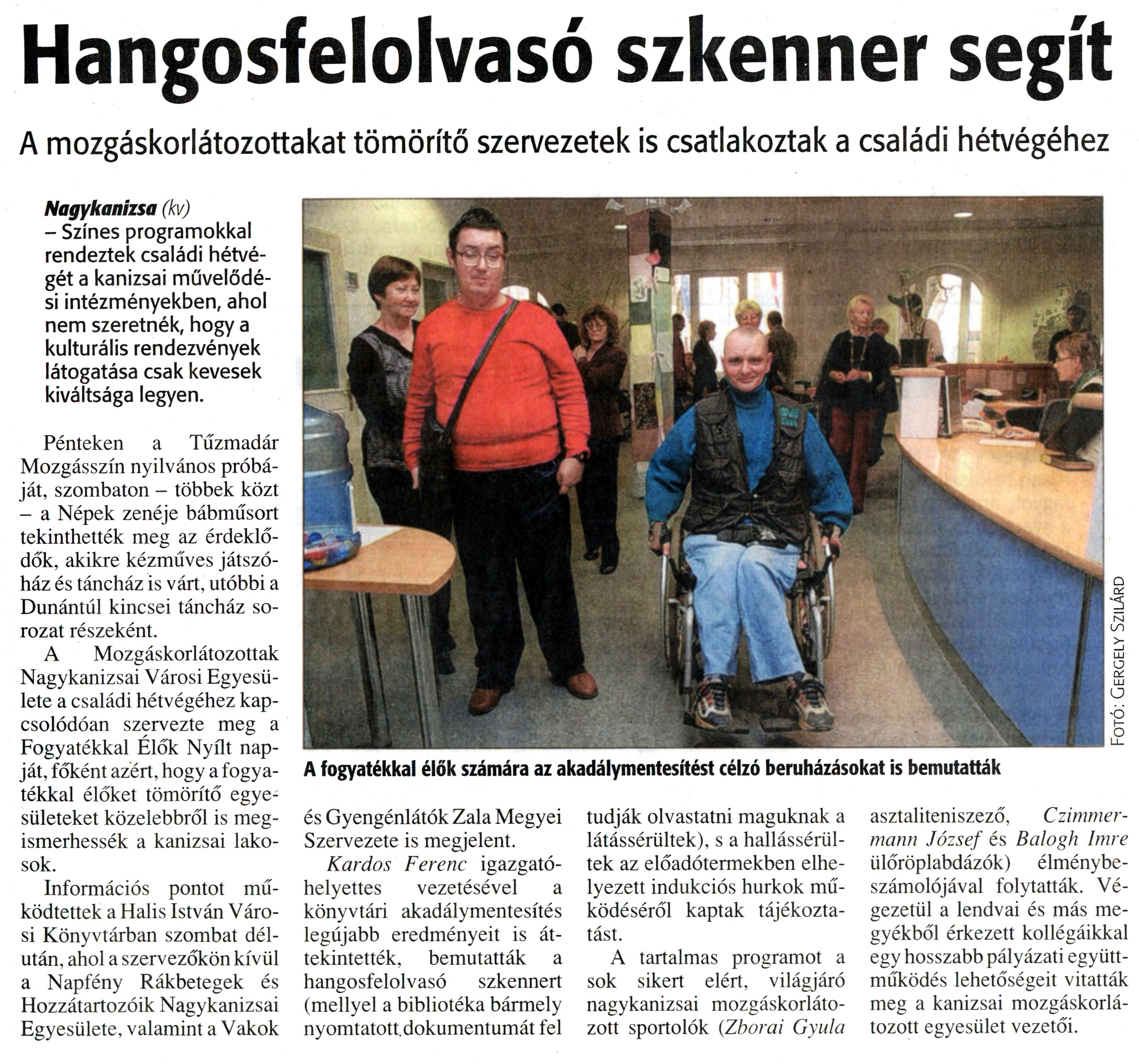 Nyilvános 1840 | 4962 | Zalai Hírlap 2010. november 23. 272. szám 11. oldal - Hangosfelolvasó szkenner segít | A cikk szövege: Hangosfelolvasó szkenner segít A mozgáskorlátozottakat tömörítő szervezetek is csatlakoztak a családi hétvégéhez A fogyatékkal élők számára az akadálymentesítést célzó beruházásokat is bemutatták Nagykanizsa (kv) - Színes programokkal rendeztek családi hétvégét a kanizsai művelődési intézményekben, ahol nem szeretnék, hogy a kulturális rendezvények látogatása csak kevesek kiváltsága legyen. Pénteken a Tűzmadár Mozgásszín nyilvános próbáját, szombaton - többek közt - a Népek zenéje bábműsort tekinthették meg az érdeklődők, akikre kézműves játszóház és táncház is várt, utóbbi a Dunántúl kincsei táncház sorozat részeként. A Mozgáskorlátozottak Nagykanizsai Városi Egyesülete a családi hétvégéhez kapcsolódóan szervezte meg a Fogyatékkal Élők Nyílt napját, főként azért, hogy a fogyatékkal élőket tömörítő egyesületeket közelebbről is megismerhessék a kanizsai lakosok. Információs pontot működtettek a Halis István Városi Könyvtárban szombat délután, ahol a szervezőkön kívül a Napfény Rákbetegek és Hozzátartozóik Nagykanizsai Egyesülete, valamint a Vakok és Gyengénlátók Zala Megyei Szervezete is megjelent. Kardos Ferenc igazgatóhelyettes vezetésével a könyvtári akadálymentesítés legújabb eredményeit is áttekintették, bemutatták a hangosfelolvasó szkennert (mellyel a bibliotéka bármely nyomtatott, dokumentumát fel tudják olvastatni maguknak a látássérültek), s a hallássérültek az előadótermekben elhelyezett indukciós hurkok működéséről kaptak tájékoztatást. A tartalmas programot a sok sikert elért, világjáró nagykanizsai mozgáskorlátozott sportolók (Zborai Gyula asztaliteniszező, Czimmer-mann József és Balogh Imre ülőröplabdázók) élménybeszámolójával folytatták. Végezetül a lendvai és más megyékből érkezett kollégáikkal egy hosszabb pályázati együttműködés lehetőségeit vitatták meg a kanizsai mozgáskorlátozott egyesület vezetői. |