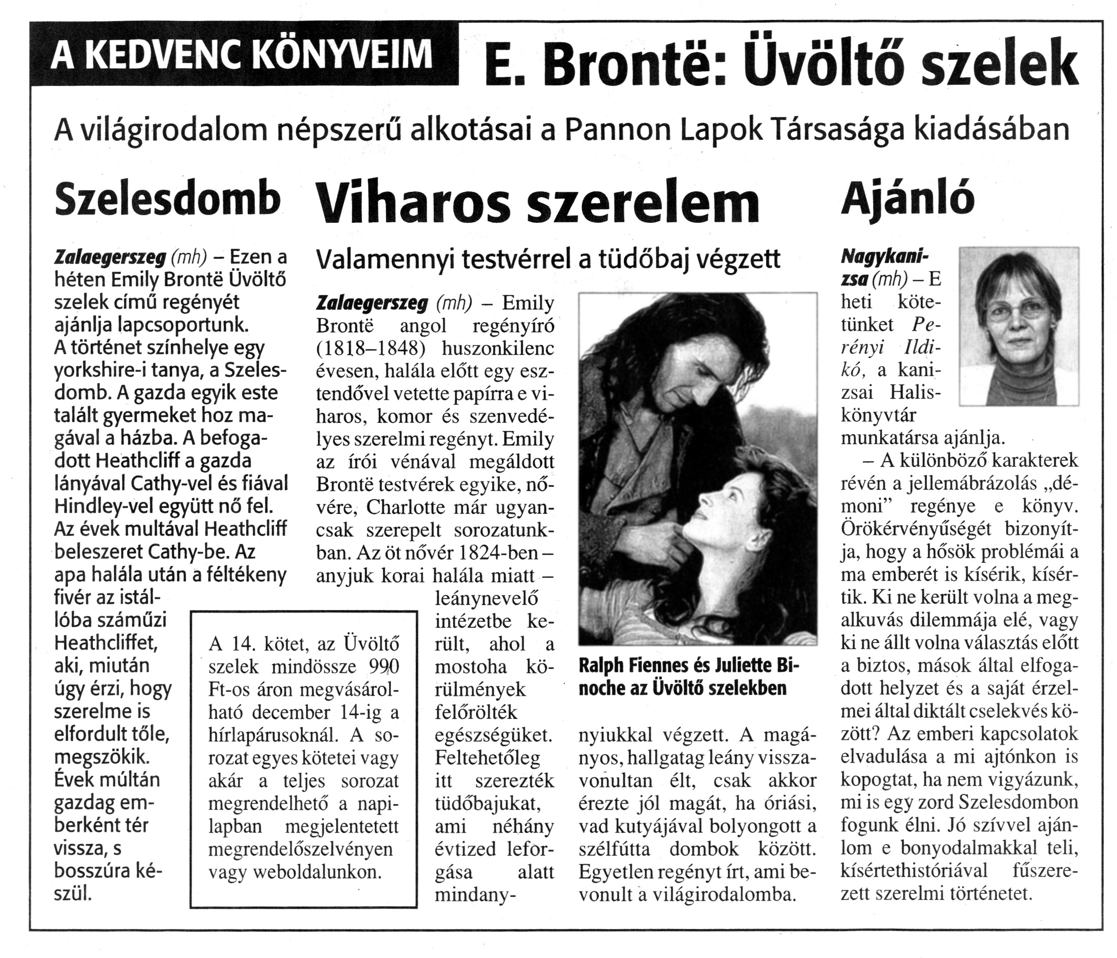 Nyilvános 1879 | 4907 | Zalai Hírlap 2010. december 8. 285. szám 7. oldal - Könyvajánló | A cikk szövege: A KEDVENC KÖNYVEIM E. Bronte: Üvöltő szelek A világirodalom népszerű alkotásai a Pannon Lapok Társasága kiadásában Szelesdomb Zalaegerszeg (mh) - Ezen a héten Emily Bronte Üvöltő szelek című regényét ajánlja lapcsoportunk. A történet színhelye egy yorkshire-i tanya, a Szeles-domb. A gazda egyik este talált gyermeket hoz magával a házba. A befogadott Heathcliff a gazda lányával Cathy-vel és fiával Hindley-vel együtt nő fel. Az évek multával Heathcliff beleszeret Cathy-be. Az apa halála után a féltékeny fivér az istállóba száműzi Heathcliffet, aki, miután úgy érzi, hogy szerelme is elfordult tőle, megszökik. Évek múltán gazdag emberként tér vissza, s bosszúra készül. Viharos szerelem Valamennyi testvérrel a tüdőbaj végzett A 14. kötet, az Üvöltő szelek mindössze 990 Ft-os áron megvásárolható december 14-ig a hírlapárusoknál. A sorozat egyes kötetei vagy akár a teljes sorozat megrendelhető a napilapban megjelentetett megrendelőszelvényen vagy weboldalunkon. Zalaegerszeg (mh) - Emily Bronte angol regényíró (1818-1848) huszonkilenc évesen, halála előtt egy esztendővel vetette papírra e viharos, komor és szenvedélyes szerelmi regényt. Emily az írói vénával megáldott Bronte testvérek egyike, nővére, Charlotte már ugyancsak szerepelt sorozatunkban. Az öt nővér 1824-ben -anyjuk korai halála miatt -leánynevelő intézetbe került, ahol a mostoha körülmények felőrölték egészségüket. Feltehetőleg itt szerezték tüdőbajukat, ami néhány évtized leforgása alatt mindannyiukkal végzett. A magányos, hallgatag leány visszavonultan élt, csak akkor érezte jól magát, ha óriási, vad kutyájával bolyongott a szélfútta dombok között. Egyetlen regényt írt, ami bevonult a világirodalomba. Ajánló Nagykanizsa (mh)-E heti kötetünket Perényi Ildikó, a kanizsai Halis-könyvtár munkatársa ajánlja. - A különböző karakterek révén a jellemábrázolás „démoni" regénye e könyv. Örökérvényűségét bizonyítja, hogy a hősök problémái a ma emberét is kísérik, kísértik. Ki ne került volna a megalkuvás dilemmája elé, vagy ki ne állt volna választás előtt a biztos, mások által elfogadott helyzet és a saját érzelmei által diktált cselekvés között? Az emberi kapcsolatok elvadulása a mi ajtónkon is kopogtat, ha nem vigyázunk, mi is egy zord Szelesdombon fogunk élni. Jó szívvel ajánlom e bonyodalmakkal teli, kísértethistóriával fűszerezett szerelmi történetet. |