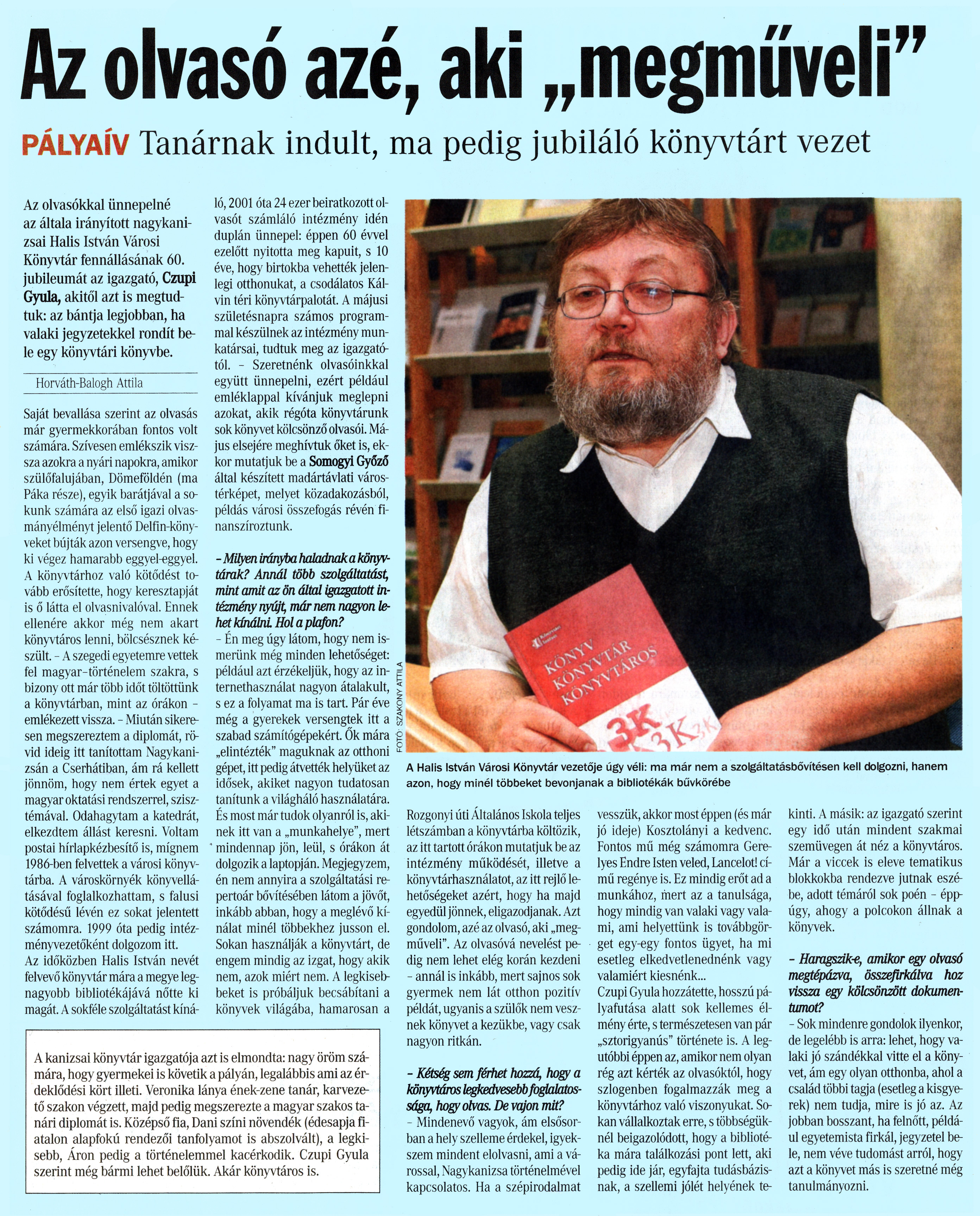 Nyilvános 1943 | 6107 | Vasárnapi Zalai Hírlap 2011. április 10. 15. szám 5. oldal - Az olvasó azé, aki megműveli | A cikk szövege: Az olvasó azé, aki „megműveli" PÁLYAÍV Tanárnak indult, ma pedig jubiláló könyvtárt vezet Az olvasókkal ünnepelné az általa irányított nagykanizsai Halis István Városi Könyvtár fennállásának 60. jubileumát az igazgató, Czupi Gyula, akitől azt is megtudtuk: az bántja legjobban, ha valaki jegyzetekkel rondít bele egy könyvtári könyvbe. Horváth-Balogh Attila Saját bevallása szerint az olvasás már gyermekkorában fontos volt számára. Szívesen emlékszik vissza azokra a nyári napokra, amikor szülőfalujában, Dömeföldén (ma Páka része), egyik barátjával a sokunk számára az első igazi olvasmányélményt jelentő Delfin-könyveket bújták azon versengve, hogy ki végez hamarabb eggyel-eggyel. A könyvtárhoz való kötődést tovább erősítette, hogy keresztapját is ő látta el olvasnivalóval. Ennek ellenére akkor még nem akart könyvtáros lenni, bölcsésznek készült. - A szegedi egyetemre vettek fel magyar-történelem szakra, s bizony ott már több időt töltöttünk a könyvtárban, mint az órákon -emlékezett vissza. - Miután sikeresen megszereztem a diplomát, rövid ideig itt tanítottam Nagykanizsán a Cserhátiban, ám rá kellett jönnöm, hogy nem értek egyet a magyar oktatási rendszerrel, szisztémával. Odahagytam a katedrát, elkezdtem állást keresni. Voltam postai hírlapkézbesítő is, mígnem 1986-ben felvettek a városi könyvtárba. A városkörnyék könyvellátásával foglalkozhattam, s falusi kötődésű lévén ez sokat jelentett számomra. 1999 óta pedig intézményvezetőként dolgozom itt. Az időközben Halis István nevét felvevő könyvtár mára a megye legnagyobb bibliotékájává nőtte ki magát. A sokféle szolgáltatást kínáló, 2001 óta 24 ezer beiratkozott olvasót számláló intézmény idén duplán ünnepel: éppen 60 évvel ezelőtt nyitotta meg kapuit, s 10 éve, hogy birtokba vehették jelenlegi otthonukat, a csodálatos Kálvin téri könyvtárpalotát. A májusi születésnapra számos programmal készülnek az intézmény munkatársai, tudtuk meg az igazgatótól. - Szeretnénk olvasóinkkal együtt ünnepelni, ezért például emléklappal kívánjuk meglepni azokat, akik régóta könyvtárunk sok könyvet kölcsönző olvasói. Május elsejére meghívtuk őket is, ekkor mutatjuk be a Somogyi Győző által készített madártávlati várostérképet, melyet közadakozásból, példás városi összefogás révén finanszíroztunk. - Milyen irányba haladnak a könyvtárak? Annál több szolgáltatást, mint amit az ön által igazgatott intézmény nyújt, már nem nagyon lehet kínálni Hol a plafon? - Én meg úgy látom, hogy nem ismerünk még minden lehetőséget: például azt érzékeljük, hogy az internethasználat nagyon átalakult, s ez a folyamat ma is tart. Pár éve még a gyerekek versengtek itt a szabad számítógépekért. Ők mára „elintézték" maguknak az otthoni gépet, itt pedig átvették helyüket az idősek, akiket nagyon tudatosan tanítunk a világháló használatára. És most már tudok olyanról is, akinek itt van a „munkahelye", mert mindennap jön, leül, s órákon át dolgozik a laptopján. Megjegyzem, én nem annyira a szolgáltatási repertoár bővítésében látom a jövőt, inkább abban, hogy a meglévő kínálat minél többekhez jusson el. Sokan használják a könyvtárt, de engem mindig az izgat, hogy akik nem, azok miért nem. A legkisebbeket is próbáljuk becsábítani a könyvek világába, hamarosan a Rozgonyi úti Általános Iskola teljes létszámban a könyvtárba költözik, az itt tartott órákon mutatjuk be az intézmény működését, illetve a könyvtárhasználatot, az itt rejlő lehetőségeket azért, hogy ha majd egyedül jönnek, eligazodjanak. Azt gondolom, azé az olvasó, aki „megműveli". Az olvasóvá nevelést pedig nem lehet elég korán kezdeni - annál is inkább, mert sajnos sok gyermek nem lát otthon pozitív példát, ugyanis a szülők nem vesznek könyvet a kezükbe, vagy csak nagyon ritkán. - Kétség sem férhet hozzá, hogy a könyvtáros legkedvesebb foglalatossága, hogy olvas. De vajon mit? - Mindenevő vagyok, ám elsősorban a hely szelleme érdekel, igyekszem mindent elolvasni, ami a várossal, Nagykanizsa történelmével kapcsolatos. Ha a szépirodalmat vesszük, akkor most éppen (és már jó ideje) Kosztolányi a kedvenc. Fontos mű még számomra Gerelyes Endre Isten veled, Lancelot! című regénye is. Ez mindig erőt ad a munkához, mert az a tanulsága, hogy mindig van valaki vagy valami, ami helyettünk is továbbgörget egy-egy fontos ügyet, ha mi esetleg elkedvetlenednénk vagy valamiért kiesnénk... Czupi Gyula hozzátette, hosszú pályafutása alatt sok kellemes élmény érte, s természetesen van pár „sztorigyanús" története is. A legutóbbi éppen az, amikor nem olyan rég azt kérték az olvasóktól, hogy szlogenben fogalmazzák meg a könyvtárhoz való viszonyukat. Sokan vállalkoztak erre, s többségüknél beigazolódott, hogy a bibliotéka mára találkozási pont lett, aki pedig ide jár, egyfajta tudásbázisnak, a szellemi jólét helyének te- kinti. A másik: az igazgató szerint egy idő után mindent szakmai szemüvegen át néz a könyvtáros. Már a viccek is eleve tematikus blokkokba rendezve jutnak eszébe, adott témáról sok poén - éppúgy, ahogy a polcokon állnak a könyvek. - Haragszik-e, amikor egy olvasó megtépázva, összefirkálva hoz vissza egy kölcsönzött dokumentumot? - Sok mindenre gondolok ilyenkor, de legelébb is arra: lehet, hogy valaki jó szándékkal vitte el a könyvet, ám egy olyan otthonba, ahol a család többi tagja (esetleg a kisgyerek) nem tudja, mire is jó az. Az jobban bosszant, ha felnőtt, például egyetemista firkál, jegyzetel bele, nem 