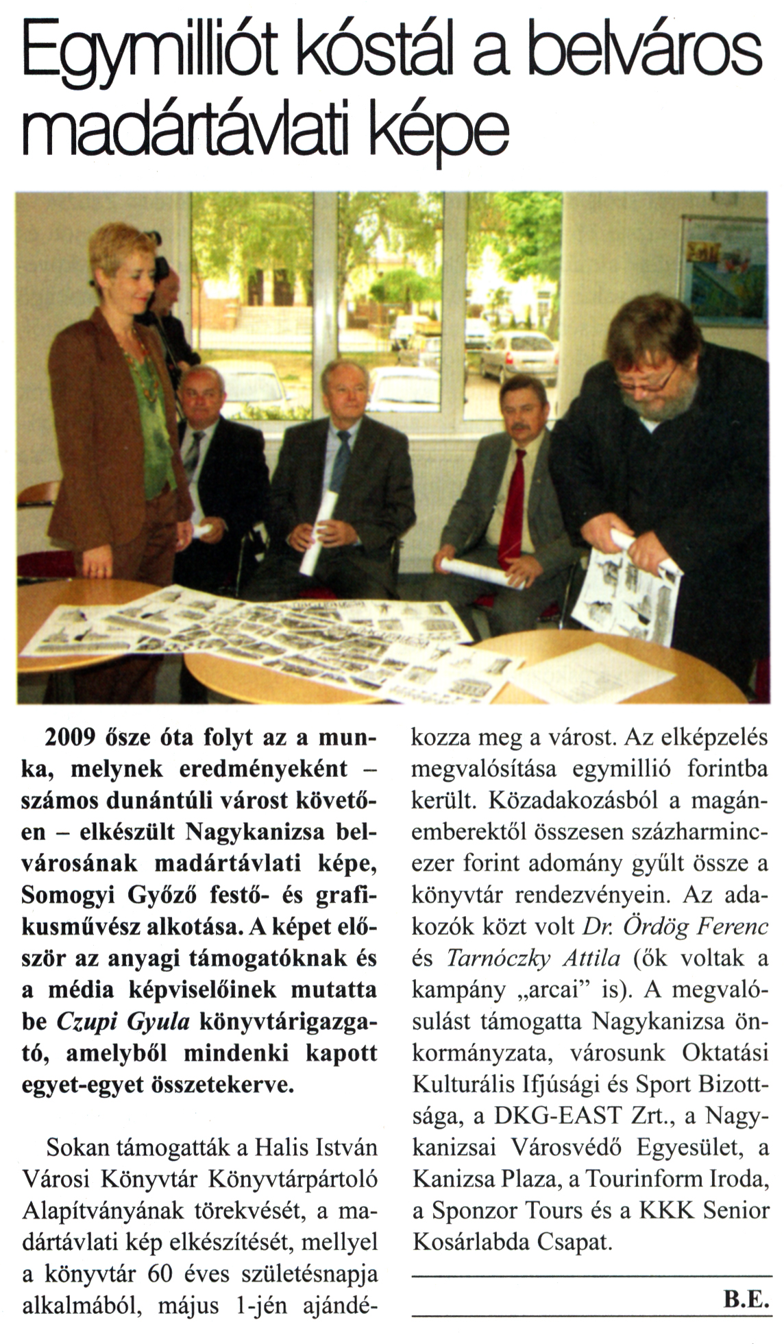 Nyilvános 2689 | 8407 | Kanizsa 2011. április 28. 16. szám 5. oldal - Egymilliót kóstál a belváros madártávlati képe | A cikk szövege: Egymilliót kóstál a belváros madártávlati képe 2009 ősze óta folyt az a munka, melynek eredményeként -számos dunántúli várost követően - elkészült Nagykanizsa belvárosának madártávlati képe, Somogyi Győző festő- és grafikusművész alkotása. A képet először az anyagi támogatóknak és a média képviselőinek mutatta be Czupi Gyula könyvtárigazgató, amelyből mindenki kapott egyet-egyet összetekerve. Sokan támogatták a Halis István Városi Könyvtár Könyvtárpártoló Alapítványának törekvését, a madártávlati kép elkészítését, mellyel a könyvtár 60 éves születésnapja alkalmából, május l-jén ajándékozza meg a várost. Az elképzelés megvalósítása egymillió forintba került. Közadakozásból a magánemberektől összesen százharmincezer forint adomány gyűlt össze a könyvtár rendezvényein. Az adakozók közt volt Dr. Ördög Ferenc és Tarnóczky Attila (ők voltak a kampány „arcai" is). A megvalósulást támogatta Nagykanizsa önkormányzata, városunk Oktatási Kulturális Ifjúsági és Sport Bizottsága, a DKG-EAST Zrt, a Nagykanizsai Városvédő Egyesület, a Kanizsa Plaza, a Tourinform Iroda, a Sponzor Tours és a KKK Senior Kosárlabda Csapat. B.E. |