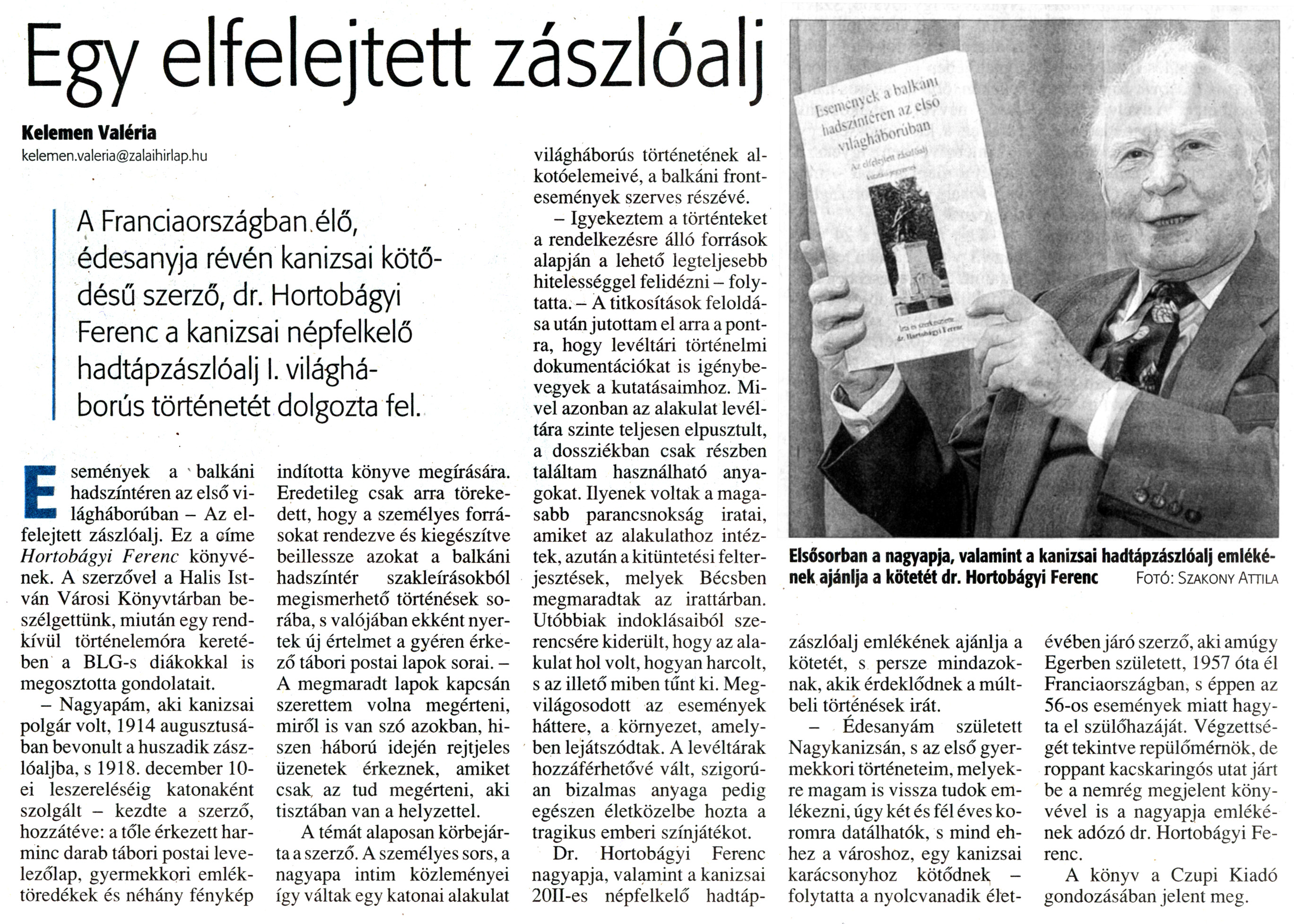Nyilvános 1831 | 5104 | Zalai Hírlap 2011. június 4. 130. szám 18. oldal - Egy elfelejtett zászlóalj | A cikk szövege: Egy elfelejtett zászlóalj Kelemen Valéria kelemen.valeria@zalaihirlap.hu A Franciaországban élő, édesanyja révén kanizsai kötődésű szerző, dr. Hortobágyi Ferenc a kanizsai népfelkelő hadtápzászlóalj I. világháborús történetét dolgozta fel. Elsősorban a nagyapja, valamint a kanizsai hadtápzászlóalj emlékének ajánlja a kötetét dr. Hortobágyi Ferenc Fotó: Szakony Attila Események a balkáni hadszíntéren az első világháborúban - Az elfelejtett zászlóalj. Ez a címe Hortobágyi Ferenc könyvének. A szerzővel a Halis István Városi Könyvtárban beszélgettünk, miután egy rendkívüli történelemóra keretében a BLG-s diákokkal is megosztotta gondolatait. - Nagyapám, aki kanizsai polgár volt, 1914 augusztusában bevonult a huszadik zászlóaljba, s 1918. december 10-ei leszereléséig katonaként szolgált - kezdte a szerző, hozzátéve: a tőle érkezett harminc darab tábori postai levelezőlap, gyermekkori emléktöredékek és néhány fénykép indította könyve megírására. Eredetileg csak arra törekedett, hogy a személyes forrásokat rendezve és kiegészítve beillessze azokat a balkáni hadszíntér szakleírásokból megismerhető történések sorába, s valójában ekként nyertek új értelmet a gyéren érkező tábori postai lapok sorai. - A megmaradt lapok kapcsán szerettem volna megérteni, miről is van szó azokban, hiszen háború idején rejtjeles üzenetek érkeznek, amiket csak, az tud megérteni, aki tisztában van a helyzettel. A témát alaposan körbejárta a szerző. A személyes sors, a nagyapa intim közleményei így váltak egy katonai alakulat világháborús történetének alkotóelemeivé, a balkáni frontesemények szerves részévé. - Igyekeztem a történteket a rendelkezésre álló források alapján a lehető legteljesebb hitelességgel felidézni - folytatta. - A titkosítások feloldása után jutottam el arra a pontra, hogy levéltári történelmi dokumentációkat is igénybe vegyek a kutatásaimhoz. Mivel azonban az alakulat levéltára szinte teljesen elpusztult, a dossziékban csak részben találtam használható anyagokat. Ilyenek voltak a magasabb parancsnokság iratai, amiket az alakulathoz intéztek, azután a kitüntetési felterjesztések, melyek Bécsben megmaradtak az irattárban. Utóbbiak indoklásaiból szerencsére kiderült, hogy az alakulat hol volt, hogyan harcolt, s az illető miben tűnt ki. Megvilágosodott az események háttere, a környezet, amelyben lejátszódtak. A levéltárak hozzáférhetővé vált, szigorúan bizalmas anyaga pedig egészen életközelbe hozta a tragikus emberi színjátékot. Dr. Hortobágyi Ferenc nagyapja, valamint a kanizsai 20 II-es népfelkelő hadtápzászlóalj emlékének ajánlja a kötetét, s persze mindazoknak, akik érdeklődnek a múltbeli történések iránt. - Édesanyám született Nagykanizsán, s az első gyermekkori történeteim, melyekre magam is vissza tudok emlékezni, úgy két és fél éves koromra datálhatok, s mind ehhez a városhoz, egy kanizsai karácsonyhoz kötődnek -folytatta a nyolcvanadik élet- évében járó szerző, aki amúgy Egerben született, 1957 óta él Franciaországban, s éppen az 56-os események miatt hagyta el szülőhazáját. Végzettségét tekintve repülőmérnök, de roppant kacskaringós utat járt be a nemrég megjelent könyvével is a nagyapja emlékének adózó dr. Hortobágyi Ferenc. A könyv a Czupi Kiadó gondozásában jelent meg. |