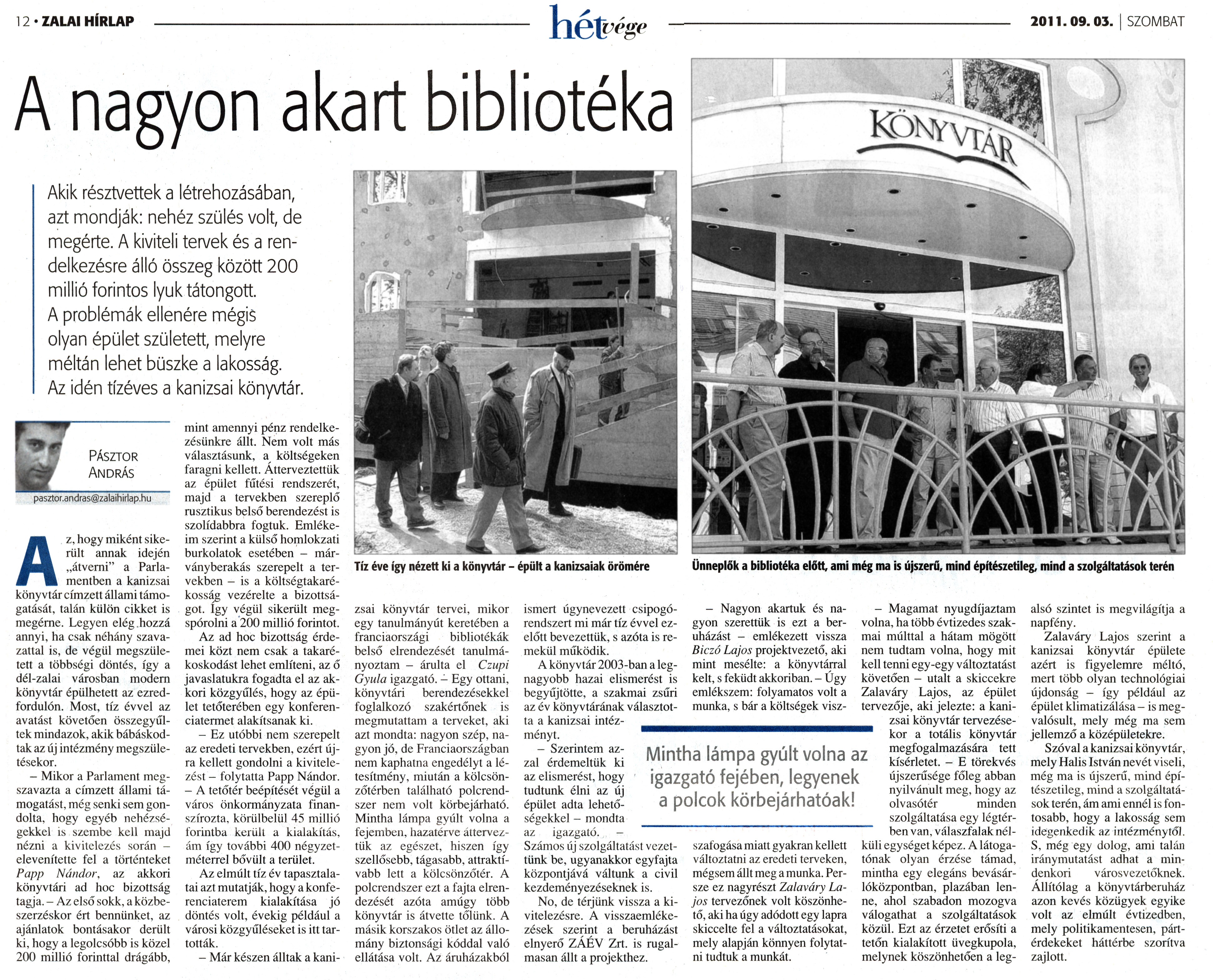 Nyilvános 2151 | 6871 | Zalai Hírlap 2011. szeptember 3. 206. szám 12. oldal - A nagyon akart bibliotéka | 12 ZALAI HÍRLAP 2011.09.03. SZOMBAT A nagyon akart bibliotéka Akik résztvettek a létrehozásában, azt mondják: nehéz szülés volt, de megérte. A kiviteli tervek és a rendelkezésre álló összeg között 200 millió forintos lyuk tátongott. A problémák ellenére mégis olyan épület született, melyre méltán lehet büszke a lakosság. Az idén tízéves a kanizsai könyvtár. Az, hogy miként sikerült annak idején „átverni" a Parlamentben a kanizsai könyvtár címzett állami támogatását, talán külön cikket is megérne. Legyen elég hozzá annyi, ha csak néhány szavazattal is, de végül megszületett a többségi döntés, így a dél-zalai városban modern könyvtár épülhetett az ezredfordulón. Most, tíz évvel az avatást követően összegyűltek mindazok, akik bábáskodtak az új intézmény megszületésekor. - Mikor a Parlament megszavazta a címzett állami támogatást, még senki sem gondolta, hogy egyéb nehézségekkel is szembe kell majd nézni a kivitelezés során - elevenítette fel a történteket Papp Nándor, az akkori könyvtári ad hoc bizottság tagja. - Az első sokk, a közbeszerzéskor ért bennünket, az ajánlatok bontásakor derült ki, hogy a legolcsóbb is közel 200 millió forinttal drágább, mint amennyi pénz rendelkezésünkre állt. Nem volt más választásunk, a költségeken faragni kellett. Átterveztettük az épület fűtési rendszerét, majd a tervekben szereplő rusztikus belső berendezést is szolidabbra fogtuk. Emlékeim szerint a külső homlokzati burkolatok esetében - márványberakás szerepelt a tervekben - is a költségtakarékosság vezérelte a bizottságot, így végül sikerült megspórolni a 200 millió forintot. Az ad hoc bizottság érdemei közt nem csak a takarékoskodást lehet említeni, az ő javaslatukra fogadta el az akkori közgyűlés, hogy az épület tetőterében egy konferenciatermet alakítsanak ki. - Ez utóbbi nem szerepelt az eredeti tervekben, ezért újra kellett gondolni a kivitelezést - folytatta Papp Nándor. - A tetőtér beépítését végül a város önkormányzata finanszírozta, körülbelül 45 millió forintba került a kialakítás, ám így további 400 négyzetméterrel bővült a terület. Az elmúlt tíz év tapasztalatai azt mutatják, hogy a konferenciaterem kialakítása jó döntés volt, évekig például a városi közgyűléseket is itt tartották. - Már készen álltak a kanizsai könyvtár tervei, mikor egy tanulmányút keretében a franciaországi bibliotékák belső elrendezését tanulmányoztam - árulta el Czupi Gyula igazgató. - Egy ottani, könyvtári berendezésekkel foglalkozó szakértőnek is megmutattam a terveket, aki azt mondta: nagyon szép, nagyon jó, de Franciaországban nem kaphatna engedélyt a létesítmény, miután a kölcsönzőtérben található polcrendszer nem volt körbejárható. Mintha lámpa gyúlt volna a fejemben, hazatérve átterveztük az egészet, hiszen így szellősebb, tágasabb, attraktívabb lett a kölcsönzőtér. A polcrendszer ezt a fajta elrendezését azóta amúgy több könyvtár is átvette tőlünk. A másik korszakos ötlet az állomány biztonsági kóddal való ellátása volt. Az áruházakból ismert úgynevezett csipogórendszert mi már tíz évvel ezelőtt bevezettük, s azóta is remekül működik. A könyvtár 2003-ban a legnagyobb hazai elismerést is begyűjtötte, a szakmai zsűri az év könyvtárának választotta a kanizsai intézményt. - Szerintem azzal érdemeltük ki az elismerést, hogy tudtunk élni az új épület adta lehetőségekkel - mondta az igazgató. -Számos új szolgáltatást vezettünk be, ugyanakkor egyfajta központjává váltunk a civil kezdeményezéseknek is. No, de térjünk vissza a kivitelezésre. A visszaemlékezések szerint a beruházást elnyerő ZAÉV Zrt. is rugalmasan állt a projekthez. - Nagyon akartuk és nagyon szerettük is ezt a beruházást - emlékezett vissza Biczó Lajos projektvezető, aki mint mesélte: a könyvtárral kelt, s feküdt akkoriban. - Úgy emlékszem: folyamatos volt a munka, s bár a költségek visszafogása miatt gyakran kellett változtatni az eredeti terveken, mégsem állt meg a munka. Persze ez nagyrészt Zalaváry Lajos tervezőnek volt köszönhető, aki ha úgy adódott egy lapra skiccelte fel a változtatásokat, mely alapján könnyen folytatni tudtuk a munkát. - Magamat nyugdíjaztam volna, ha több évtizedes szakmai múlttal a hátam mögött nem tudtam volna, hogy mit kell tenni egy-egy változtatást követően - utalt a skiccekre Zalaváry Lajos, az épület tervezője, aki jelezte: a kanizsai könyvtár tervezésekor a totális könyvtár megfogalmazására tett kísérletet. - E törekvés újszerűsége főleg abban nyilvánult meg, hogy az olvasótér minden szolgáltatása egy légtérben van, válaszfalak nélküli egységet képez. A látogatónak olyan érzése támad, mintha egy elegáns bevásárlóközpontban, plazában lenne, ahol szabadon mozogva válogathat a szolgáltatások közül. Ezt az érzetet erősíti a tetőn kialakított üvegkupola, melynek köszönhetően a legalsó szintet is megvilágítja a napfény. Zalaváry Lajos szerint a kanizsai könyvtár épülete azért is figyelemre méltó, mert több olyan technológiai újdonság - így például az épület klimatizálása - is megvalósult, mely még ma sem jellemző a középületekre. Szóval a kanizsai könyvtár, mely Halis István nevét viseli, még ma is újszerű, mind építészetileg, mind a szolgáltatások terén, ám ami ennél is fontosabb, hogy a lakosság sem idegenkedik az intézménytől. S, még egy dolog, ami talán iránymutatást adhat a mindenkori városvezetőknek. Állítólag a könyvtárberuház azon kevés közügyek egyike volt az elmúlt évtizedben, mely politikamentesen, pá