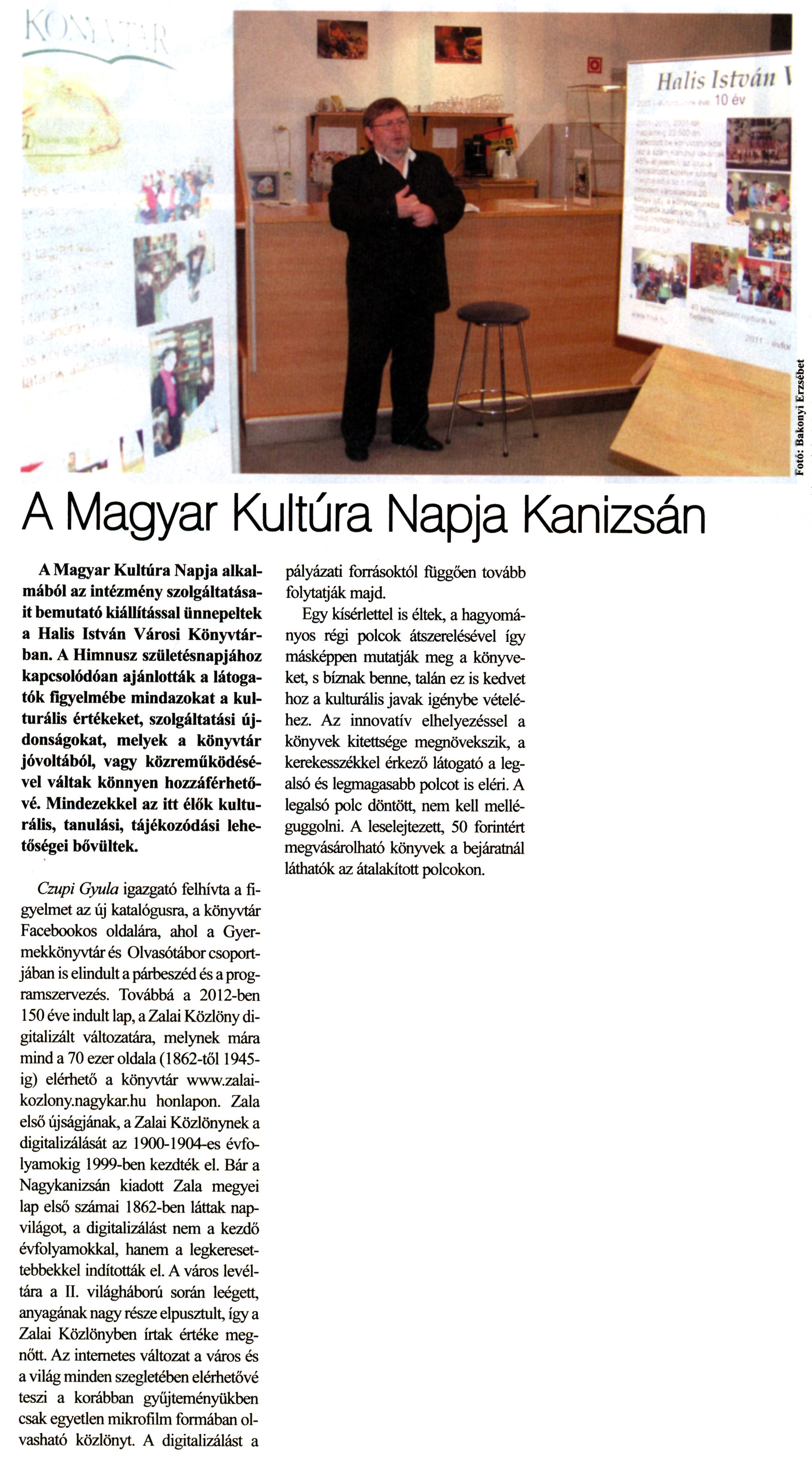 Nyilvános 2431 | 7640 | Kanizsa 2012. január 26. 3. szám 2. oldal - A Magyar Kultúra Napja Kanizsán | A Magyar Kultúra Napja Kanizsán A Magyar Kultúra Napja alkalmából az intézmény szolgáltatásait bemutató kiállítással ünnepeltek a Halis István Városi Könyvtárban. A Himnusz születésnapjához kapcsolódóan ajánlották a látogatók figyelmébe mindazokat a kulturális értékeket, szolgáltatási újdonságokat, melyek a könyvtár jóvoltából, vagy közreműködésével váltak könnyen hozzáférhetővé. Mindezekkel az itt élők kulturális, tanulási, tájékozódási lehetőségei bővültek. Czupi Gyula igazgató felhívta a figyelmet az új katalógusra, a könyvtár Facebookos oldalára, ahol a Gyermekkönyvtár és Olvasótábor csoportjában is elindult a párbeszéd és a programszervezés. Továbbá a 2012-ben 150 éve indult lap, a Zalai Közlöny digitalizált változatára, melynek mára mind a 70 ezer oldala (1862-től 1945-ig) elérhető a könyvtár www.zalai-kozlony.nagykar.hu honlapon. Zala első újságjának, a Zalai Közlönynek a digitalizálását az 1900-1904-es évfolyamokig 1999-ben kezdték el. Bár a Nagykanizsán kiadott Zala megyei lap első számai 1862-ben láttak napvilágot, a digitalizálást nem a kezdő évfolyamokkal, hanem a legkeresettebbekkel indították el. A város levéltára a II. világháború során leégett, anyagának nagy része elpusztult, így a Zalai Közlönyben írtak értéke megnőtt. Az internetes változat a város és a világ minden szegletében elérhetővé teszi a korábban gyűjteményükben csak egyetlen mikrofilm formában olvasható közlönyt. A digitalizálást a pályázati forrásoktól függően tovább folytatják majd. Egy kísérlettel is éltek, a hagyományos régi polcok átszerelésével így másképpen mutatják meg a könyveket, s bíznak benne, talán ez is kedvet hoz a kulturális javak igénybe vételéhez. Az innovatív elhelyezéssel a könyvek kitettsége megnövekszik, a kerekesszékkel érkező látogató a legalsó és legmagasabb polcot is eléri. A legalsó polc döntött, nem kell melléguggolni. A leselejtezett, 50 forintért megvásárolható könyvek a bejáratnál láthatók az átalakított polcokon. |