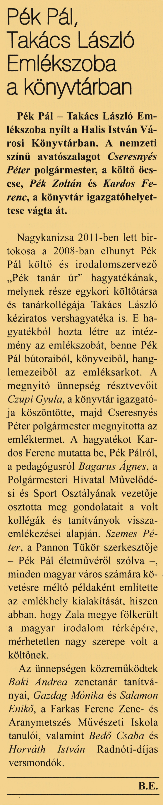 Nyilvános 2142 | 6631 | Kanizsa 2012. április 19. 15. szám 1. oldal - Pék Pál, Takács László Emlékszoba | Pék Pál, Takács László Emlékszoba a könyvtárban Pék Pál - Takács László Emlékszoba nyílt a Halis István Városi Könyvtárban. A nemzeti színű avatószalagot Cseresnyés Péter polgármester, a költő öccse, Pék Zoltán és Kardos Ferenc, a könyvtár igazgatóhelyettese vágta át. Nagykanizsa 2011-ben lett birtokosa a 2008-ban elhunyt Pék Pál költő és irodalomszervező „Pék tanár úr" hagyatékának, melynek része egykori költőtársa és tanárkollégája Takács László kéziratos vershagyatéka is. E hagyatékból hozta létre az intézmény az emlékszobát, benne Pék Pál bútoraiból, könyveiből, hanglemezeiből az emléksarkot. A megnyitó ünnepség résztvevőit Czupi Gyula, a könyvtár igazgatója köszöntötte, majd Cseresnyés Péter polgármester megnyitotta az emléktermet. A hagyatékot Kardos Ferenc mutatta be. Pék Pálról, a pedagógusról Bagarus Ágnes, a Polgármesteri Hivatal Művelődési és Sport Osztályának vezetője osztotta meg gondolatait a volt kollégák és tanítványok visszaemlékezései alapján. Szemes Péter, a Pannon Tükör szerkesztője - Pék Pál életművéről szólva -, minden magyar város számára követésre méltó példaként említette az emlékhely kialakítását, hiszen abban, hogy Zala megye fölkerült a magyar irodalom térképére, mérhetetlen nagy szerepe volt a költőnek. Az ünnepségen közreműködtek Baki Andrea zenetanár tanítványai, Gazdag Mónika és Salamon Enikő, a Farkas Ferenc Zene- és Aranymetszés Művészeti Iskola tanulói, valamint Bedő Csaba és Horváth István Radnóti-díjas versmondók. B.E. |