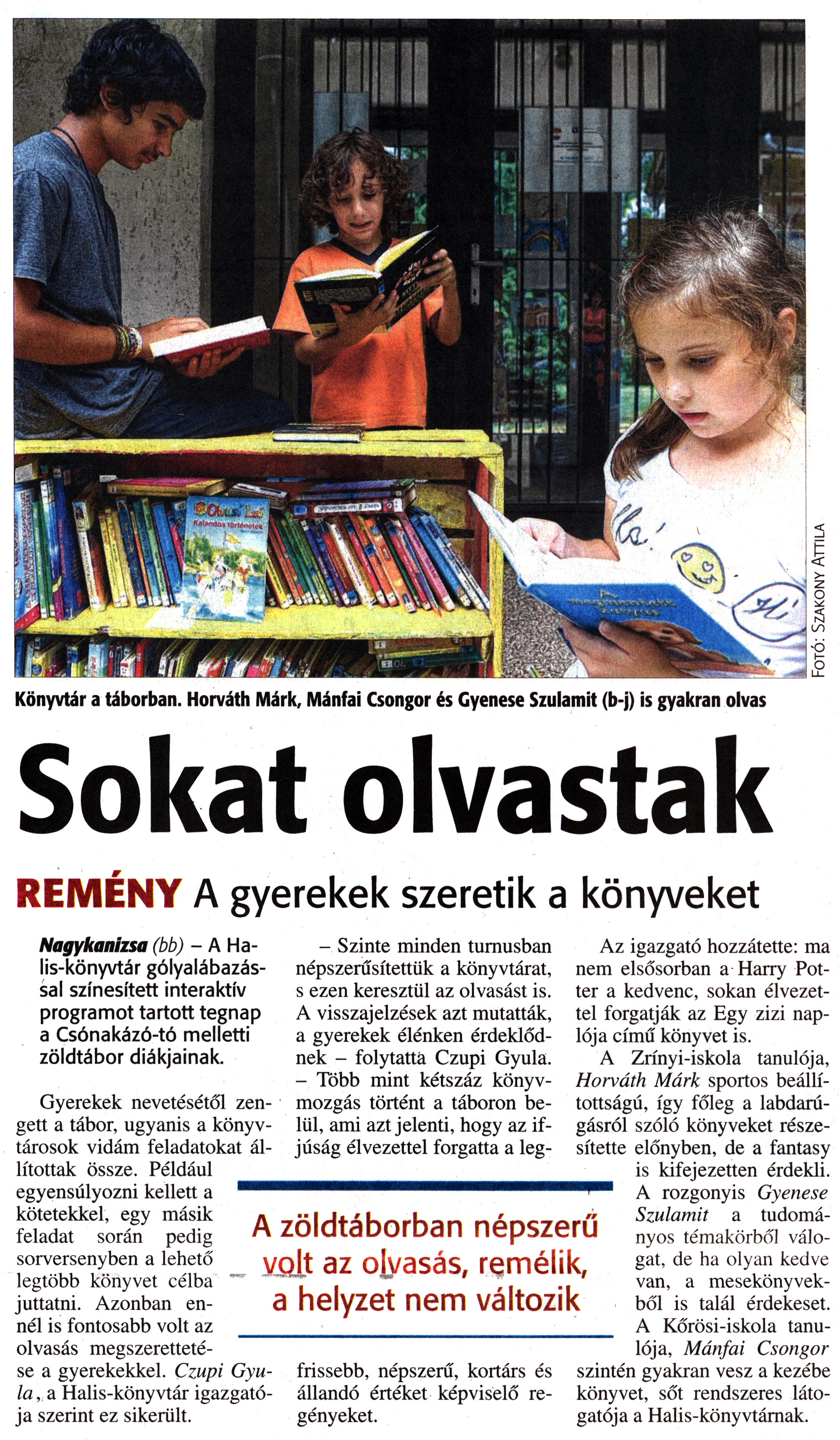 Nyilvános 1734 | 3242 | Zalai Hírlap 2016. augusztus 19. 195. szám 2. oldal - Sokat olvastak | Sokat olvastak REMÉNY A gyerekek szeretik a könyveket Nagykanizsa (bb) - A Halis-könyvtár gólyalábazással színesített interaktív programot tartott tegnap a Csónakázó-tó melletti zöldtábor diákjainak. Gyerekek nevetésétől zengett a tábor, ugyanis a könyvtárosok vidám feladatokat állítottak össze. Például egyensúlyozni kellett a kötetekkel, egy másik feladat során pedig sorversenyben a lehető legtöbb könyvet célba juttatni. Azonban ennél is fontosabb volt az olvasás megszerettetése a gyerekekkel. Czupi Gyula, a Halis-könyvtár igazgatója szerint ez sikerült. - Szinte minden turnusban népszerűsítettük a könyvtárat, s ezen keresztül az olvasást is. A visszajelzések azt mutatták, a gyerekek élénken érdeklődnek - folytatta Czupi Gyula. - Több mint kétszáz könyvmozgás történt a táboron belül, ami azt jelenti, hogy az ifjúság élvezettel forgatta a legfrissebb, népszerű, kortárs és állandó értéket képviselő regényeket. Az igazgató hozzátette: ma nem elsősorban a Harry Potter a kedvenc, sokan élvezettel forgatják az Egy zizi naplója című könyvet is. A Zrínyi-iskola tanulója, Horváth Márk sportos beállítottságú, így főleg a labdarúgásról szóló könyveket részesítette előnyben, de a fantasy is kifejezetten érdekli. A rozgonyis Gyenese Szulamit a tudományos témakörből válogat, de ha olyan kedve van, a mesekönyvekből is talál érdekeset. A Kőrösi-iskola tanulója, Mánfai Csongor szintén gyakran vesz a kezébe könyvet, sőt rendszeres látogatója a Halis-könyvtárnak. |