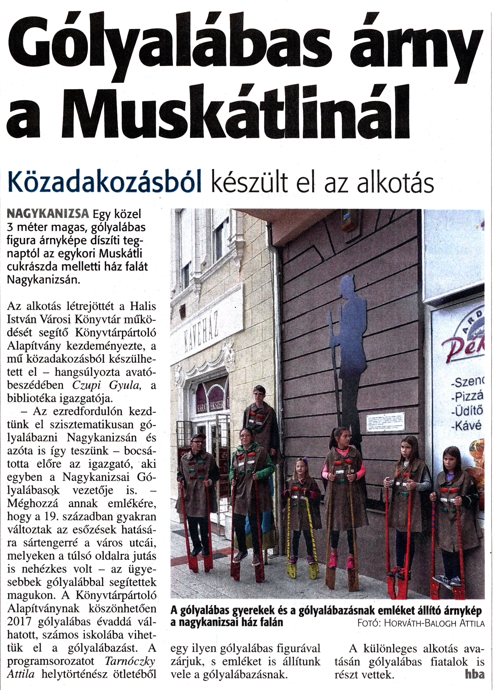 Nyilvános 1700 | 3278 | Zalai Hírlap 2017. október 7. 235. szám 16. oldal | Gólyalábas árny a Muskátlinál Közadakozásból készült el az alkotás NAGYKANIZSA Egy közel 3 méter magas, gólyalábas figura árnyképe díszíti tegnaptól az egykori Muskátli cukrászda melletti ház falát Nagykanizsán. Az alkotás létrejöttét a Halis István Városi Könyvtár működését segítő Könyvtárpártoló Alapítvány kezdeményezte, a mű közadakozásból készülhetett el - hangsúlyozta avatóbeszédében Czupi Gyula, a bibliotéka igazgatója. - Az ezredfordulón kezdtünk el szisztematikusan gólyalábazni Nagykanizsán és azóta is így teszünk - bocsátotta előre az igazgató, aki egyben a Nagykanizsai Gólyalábasok vezetője is. - Méghozzá annak emlékére, hogy a 19. században gyakran változtak az esőzések hatására sártengerré a város utcái, melyeken a túlsó oldalra jutás is nehézkes volt - az ügyesebbek gólyalábbal segítettek magukon. A Könyvtárpártoló Alapítványnak köszönhetően 2017 gólyalábas évaddá válhatott, számos iskolába vihettük el a gólyalábazást. A programsorozatot Tarnóczky Attila helytörténész ötletéből egy ilyen gólyalábas figurával zárjuk, s emléket is állítunk vele a gólyalábazásnak. A különleges alkotás avatásán gólyalábas fiatalok is részt vettek. hba A gólyalábas gyerekek és a gólyalábazásnak emléket állító árnykép a nagykanizsai ház falán Fotó: Horváth-Balogh Attila A cikk online változata: https://www.zaol.hu/kozelet/helyi-kozelet/kozadakozasbol-keszult-el-kulonleges-golyalabas-figura-2165943/ |