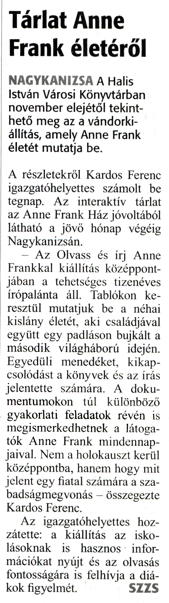 Nyilvános 1561 | 2569 | Zalai Hírlap 2018. október 31. 253. szám 1. oldal | Tárlat Anne Frank életéről NAGYKANIZSA A Halis István Városi Könyvtárban november elejétől tekinthető meg az a vándorkiállítás, amely Anne Frank életét mutatja be. A részletekről Kardos Ferenc igazgatóhelyettes számolt be tegnap. Az interaktív tárlat az Anne Frank Ház jóvoltából látható a jövő hónap végéig Nagykanizsán. - Az Olvass és írj Anne Frankkal kiállítás középpontjában a tehetséges tizenéves írópalánta áll. Tablókon keresztül mutatjuk be a néhai kislány életét, aki családjával együtt egy padláson bujkált a második világháború idején. Egyedüli menedéket, kikapcsolódást a könyvek és az írás jelentette számára. A dokumentumokon túl különböző gyakorlati feladatok révén is megismerkedhetnek a látogatók Anne Frank mindennapjaival. Nem a holokauszt kerül középpontba, hanem hogy mit jelent egy fiatal számára a szabadságmegvonás - összegezte Kardos Ferenc. Az igazgatóhelyettes hozzátette: a kiállítás az iskolásoknak is hasznos információkat nyújt és az olvasás fontosságára is felhívja a diákok figyelmét. SZZS |